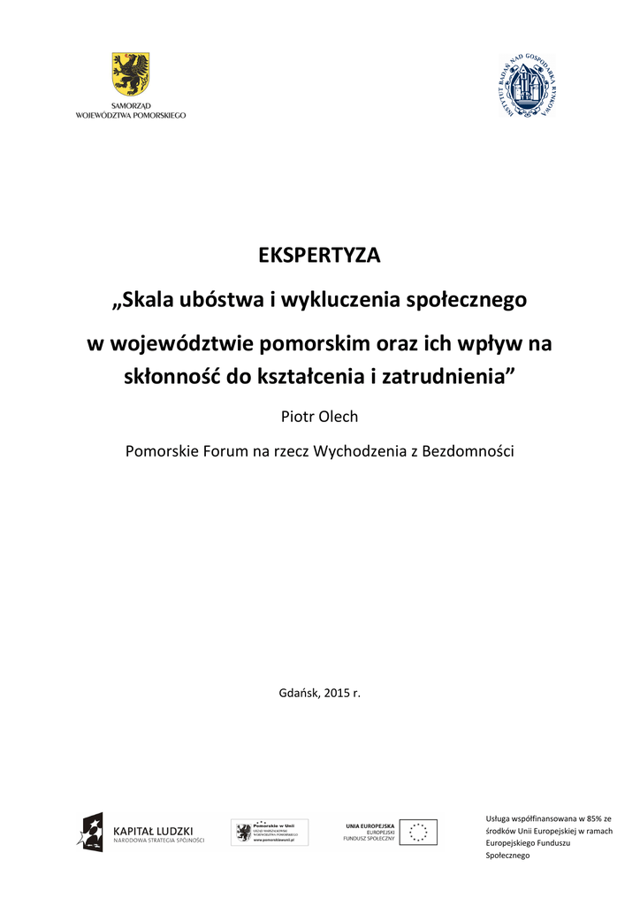 EKSPERTYZA „Skala ubóstwa i wykluczenia społecznego w województwie pomorskim oraz ich wpływ na skłonność do kształcenia i zatrudnienia” Piotr Olech Pomorskie Forum na rzecz Wychodzenia z Bezdomności Gdańsk, 2015 r. Usługa współfinansowana w 85% ze środków Unii Europejskiej w ramach Europejskiego Funduszu Społecznego Streszczenie Niniejsze opracowanie jest niełatwą próbą przybliżenia skali ubóstwa i wykluczenia społecznego w województwie pomorskim oraz częściową próbą odpowiedzi na pytanie jak zagrożenie i samo doświadczanie tych problemów wpływa na motywację do podejmowania kształcenia i zatrudnienia. Pierwsza część poświęcona skali zagrożenia ubóstwem i wykluczeniem społecznym opiera się na istniejących i dostępnych danych, z kolei druga część w większej części odnosi się do doświadczeń i przekonań autora. Obie części nie wyczerpują w żaden sposób szerokiej tematyki, sygnalizują jednak kluczowe w tym zakresie zagadnienia. W związku z wielowymiarowym charakterem niniejszych zjawisk przedstawiono skalę i krótką charakterystykę głównych grup społecznych zagrożonych ubóstwem i wykluczeniem społecznym w tym: osób długotrwale bezrobotnych i biernych zawodowo, osób starszych, niepełnosprawnych, rodzin z problemami opiekuńczo-wychowawczymi i wychowanków pieczy zastępczej, osób uzależnionych, osób zaburzonych psychicznie, osób bezdomnych i wykluczonych mieszkaniowo, osób zagrożonych przemocą domową, osób opuszczających zakłady penitencjarne. Samo zestawienie różnych grup społecznych pokazuje jak złożone to zagadnienie. Analiza wpływu ubóstwa i wykluczenia społecznego na skłonność do podejmowania kształcenia i zatrudnienia została zrealizowana w podziale na kilka rodzajów czynników. Po pierwsze czynniki psychologiczne, po drugie czynniki społeczne, po trzecie czynniki ekonomiczne i po czwarte czynniki instytucjonalne, część z niniejszych czynników ma charakter indywidualny, zależny od osoby, część jednak ma charakter niezależny i zewnętrzny wobec osoby. W związku ze złożonością problemu, uwagę poświęcono jedynie wybranym czynnikom, tym które nie są tak oczywiste i tak często nie pojawiają się w dyskursie o osobach i rodzinach zagrożonych ubóstwem lub wykluczeniem społecznym. Usługa współfinansowana w 85% ze środków Unii Europejskiej w ramach Europejskiego Funduszu Społecznego Spis treści Streszczenie ............................................................................................................................................. 2 Wprowadzenie ........................................................................................................................................ 4 Opis zastosowanej metodologii oraz źródła informacji .......................................................................... 6 Opis wyników analizy eksperckiej ........................................................................................................... 7 Najważniejsze grupy zagrożone ubóstwem lub wykluczeniem społecznym....................................... 7 Osoby długotrwale bezrobotne i bierne zawodowo ....................................................................... 7 Osoby niepełnosprawne .................................................................................................................. 7 Osoby starsze................................................................................................................................... 8 Rodziny z problemami opiekuńczo wychowawczymi i wychowankowie pieczy zastępczej ........... 9 Osoby bezdomne i wykluczone mieszkaniowo ............................................................................. 10 Osoby uzależnione......................................................................................................................... 11 Osoby zaburzone psychicznie ........................................................................................................ 12 Ofiary przemocy domowej ............................................................................................................ 12 Osoby opuszczające zakłady karne................................................................................................ 13 Wpływ ubóstwa i wykluczenia społecznego na skłonność do kształcenia i zatrudnienia ................. 14 Czynniki psychologiczne ................................................................................................................ 14 Czynniki społeczne......................................................................................................................... 15 Czynniki ekonomiczne ................................................................................................................... 16 Czynniki instytucjonalne ................................................................................................................ 17 Wnioski i powiązane z nimi rekomendacje ........................................................................................... 18 Usługa współfinansowana w 85% ze środków Unii Europejskiej w ramach Europejskiego Funduszu Społecznego Wprowadzenie Skala ubóstwa i wykluczenia społecznego w województwie pomorskim Obszar województwa pomorskiego (2 295 811 mieszkańców) charakteryzuje się wysokimi wskaźnikami bezrobocia, bierności zawodowej, a także ubóstwa i wykluczenia społecznego. Skala bezrobocia w woj. pomorskim wynosi 13,2%, tymczasem długotrwałego bezrobocia doświadcza 34,8% osób. W grupie osób bezrobotnych w wieku 55-64 lata aż 42,1% to osoby długotrwale bezrobotne.1 Jednocześnie rejestrowane bezrobocie nie odzwierciedla w pełni sytuacji aktywności zawodowej mieszkańców. Współczynnik aktywności zawodowej ogółem wynosi niecałe 56%, w grupie osób w wieku produkcyjnym 72,5%2, wskaźnik zatrudnienia 50,2%3, osoby aktywne zawodowo (p