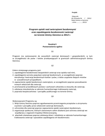 Projekt Załącznik do Uchwały Nr / /2012 Rady Gminy w Siennicy z dnia ……………2012r Program opieki nad zwierzętami bezdomnymi oraz zapobiegania bezdomności zwierząt na terenie Gminy Siennica w 2012 r. Rozdział I Postanowienia ogólne §1 Program ma zastosowanie do wszystkich zwierząt domowych i gospodarskich, w tym w szczególności do psów i kotów przebywających w granicach administracyjnych Gminy Siennica. §2 Celem niniejszego programu jest: 1. zapobieganie bezdomności bezpańskich zwierząt oraz opieka nad nimi, 2. zapobieganie wzrostu populacji zwierząt bezdomnych, w szczególności poprzez sterylizację i kastrację bezdomnych kotów i psów, a także usypianie ślepych miotów w uzasadnionych przypadkach, 3. zapewnienie opieki bezdomnym zwierzętom, w szczególności poprzez poszukiwanie nowych właścicieli dla zwierząt, 4. promowanie prawidłowych postaw i zachowań człowieka w stosunku do zwierząt, 5. edukacja mieszkańców w zakresie humanitarnego traktowania zwierząt, 5. poprawa bezpieczeństwa i porządku publicznego na terenie Gminy. §3 Wykonawcami Programu są: 1. Wójt Gminy Siennica poprzez egzekwowanie przestrzegania przepisów o utrzymaniu czystości i porządku przez właścicieli zwierząt domowych, 2. schronisko dla zwierząt poprzez zapewnienie opieki zwierzętom bezdomnym, 3. organizacje społeczne, których statutowym celem działania jest ochrona zwierząt we współpracy z organami Inspekcji Weterynaryjnej, 4. placówki oświatowe poprzez edukację dzieci i młodzieży w zakresie humanitarnego traktowania zwierząt i sposobów zapobiegania ich bezdomności. Rozdział II Sposoby realizacji celów programu §4 Opieka na bezdomnymi zwierzętami tj. przebywającymi w miejscach publicznych bez opieki i kontroli człowieka obejmuje: 1. Okresowe odławianie bezdomnych zwierząt (psów i kotów) na terenie gminy Siennica w zależności od zaistniałej potrzeby i na zgłoszenie interwencyjne Policji lub mieszkańców, realizowane w następujący sposób: 1) wyłapywaniem bezdomnych zwierząt zajmować się będzie uprawniony podmiot w zakresie działania, którego jest wyłapywanie bezdomnych zwierząt, 2) wyłapane bezdomne zwierzęta zostaną niezwłocznie przewiezione do nadzorowanego przez Inspekcję Weterynaryjną schroniska dla zwierząt, 3) wyłapywanie, przeniesienie i umieszczenie zwierząt bezdomnych w schronisku realizowane będzie w oparciu o umowę zawartą przez Wójta Gminy Siennica z wyspecjalizowanym i uprawnionym przedsiębiorcą, 4) schronisko zapewni bezterminową opiekę wyłapywanym zwierzętom bezdomnym lub znajdzie dla nich osoby, które adoptują bezdomne zwierzęta, 5) Gminie Siennica przysługuje prawo żądania od schroniska, do którego kierowane są bezdomne zwierzęta, informacji o postępowaniu z wyłapywanymi zwierzętami oraz dokumentów potwierdzających właściwe prowadzenie schroniska, 6) bezdomne zwierzęta umieszczone w schronisku będą poddawane zabiegowi sterylizacji albo kastracji, 7) zwierzę umieszczone w schronisku może być oddane jego właścicielowi, w ciągu 14 dni od dnia przyjęcia, jeżeli został on ustalony i pod warunkiem uregulowania przez niego kosztów związanych z wyłapaniem zwierzęcia i umieszczeniem go w schronisku. 2. Poszukiwanie wspólnie z organizacjami opieki nad zwierzętami, wolontariuszami i innymi osobami nowych właścicieli dla bezdomnych zwierząt. 3. Dokarmianie kotów wolnożyjących w okresie zimy, kiedy występują temperatury ujemne przez opiekunów społecznych. §5 W celu zmniejszenia populacji bezdomnych zwierząt planuje się realizację następujących zadań: 1. sterylizację albo kastrację bezdomnych psów i kotów przebywających w schronisku, 2. usypianie ślepych miotów w schronisku albo poprzez zawieranie umów z zakładami leczniczymi dla zwierząt. §6 W przypadku zwierząt gospodarskich dopuszcza się czasowe przekazanie tego typu zwierząt bezdomnych, gospodarstwu posiadającemu odpowiednie warunki do ich przetrzymywania, do czasu ustalenia dalszego postępowania z tymi zwierzętami. Decyzję o przekazaniu właściwemu gospodarstwu podejmować będzie Wójt Gminy Siennica. §7 Zapewnienie całodobowej opieki weterynaryjnej w przypadkach zdarzeń drogowych z udziałem zwierząt realizowane będzie poprzez zawieranie umów z zakładem leczniczym dla zwierząt lub przez zapewnienie dyżuru lekarza weterynarii w schronisku. §8 Poprawa bezpieczeństwa i porządku publicznego na terenie gminy realizowana będzie przez: 1. Egzekwowanie przepisów prawa lokalnego w zakresie obowiązków właścicieli zwierząt, określonych przepisami o utrzymaniu czystości i porządku w gminach; 2. Egzekwowanie , we współpracy z inspekcją weterynaryjną obowiązku wykonania corocznego szczepienia psów przeciw wściekliźnie; 3. Prowadzenie działań edukacyjnych w zakresie opieki nad zwierzętami i humanitarnego ich traktowania. Rozdział III Edukacja w zakresie ochrony zwierząt §9 W celu edukacji mieszkańców Gminy w zakresie ochrony zwierząt planuje się realizację następujących zadań: 1. włączenie nauczycieli w szkołach i przedszkolach z terenu gminy do działań edukacyjnych mających na celu podniesienia świadomości dzieci i młodzieży w zakresie kształtowania prawidłowych postaw i zachowań człowieka w stosunku do zwierząt, 2. Promowanie na stronie internetowej Urzędu Gminy Programu opieki nad zwierzętami bezdomnymi oraz zapobiegania bezdomności zwierząt. Rozdział IV Środki finansowe przeznaczone na realizację programu §10 1. Program będzie realizowany ze środków finansowych budżetu Gminy Siennica. 2. W 2012 roku Gmina Siennica zapewniła w budżecie kwotę 27000,00 zł.