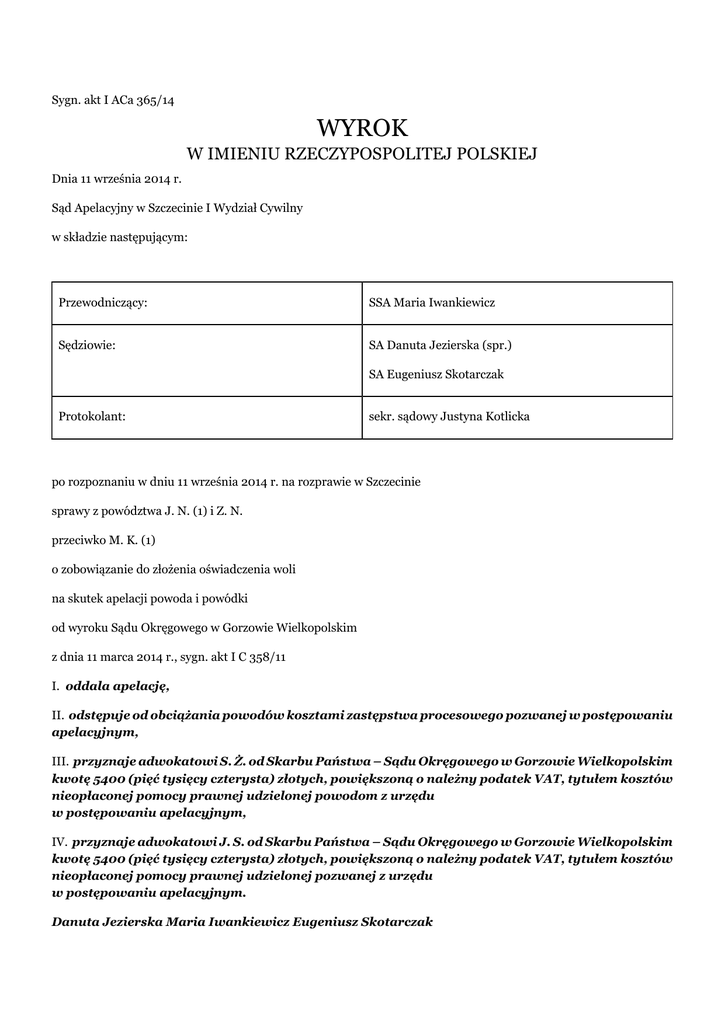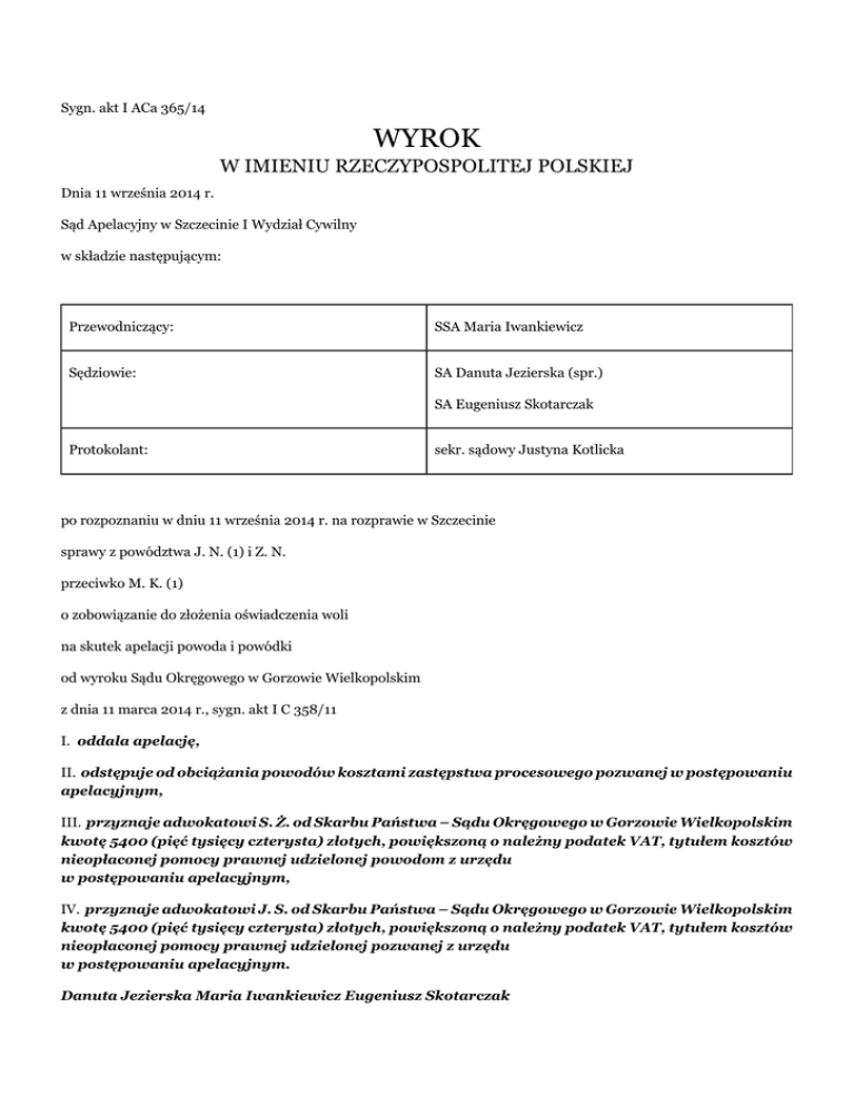 Sygn. akt I ACa 365/14 WYROK W IMIENIU RZECZYPOSPOLITEJ POLSKIEJ Dnia 11 września 2014 r. Sąd Apelacyjny w Szczecinie I Wydział Cywilny w składzie następującym: Przewodniczący: SSA Maria Iwankiewicz Sędziowie: SA Danuta Jezierska (spr.) SA Eugeniusz Skotarczak Protokolant: sekr. sądowy Justyna Kotlicka po rozpoznaniu w dniu 11 września 2014 r. na rozprawie w Szczecinie sprawy z powództwa J. N. (1) i Z. N. przeciwko M. K. (1) o zobowiązanie do złożenia oświadczenia woli na skutek apelacji powoda i powódki od wyroku Sądu Okręgowego w Gorzowie Wielkopolskim z dnia 11 marca 2014 r., sygn. akt I C 358/11 I. oddala apelację, II. odstępuje od obciążania powodów kosztami zastępstwa procesowego pozwanej w postępowaniu apelacyjnym, III. przyznaje adwokatowi S. Ż. od Skarbu Państwa – Sądu Okręgowego w Gorzowie Wielkopolskim kwotę 5400 (pięć tysięcy czterysta) złotych, powiększoną o należny podatek VAT, tytułem kosztów nieopłaconej pomocy prawnej udzielonej powodom z urzędu w postępowaniu apelacyjnym, IV. przyznaje adwokatowi J. S. od Skarbu Państwa – Sądu Okręgowego w Gorzowie Wielkopolskim kwotę 5400 (pięć tysięcy czterysta) złotych, powiększoną o należny podatek VAT, tytułem kosztów nieopłaconej pomocy prawnej udzielonej pozwanej z urzędu w postępowaniu apelacyjnym. Danuta Jezierska Maria Iwankiewicz Eugeniusz Skotarczak Sygn. akt I ACa 365/14 UZASADNIENIE J. N. (1) i Z. N. wnieśli o nakazanie M. K. (1) złożenia oświadczenia o przeniesieniu na ich rzecz darowanej pozwanej nieruchomości, w związku ze złożeniem przez powodów oświadczenia o odstąpieniu od umowy darowizny z powodu rażącej niewdzięczności pozwanej przejawiającej się zamiarem sprzedaży tej nieruchomości, żądaniem zrzeczenia się przez nich ze służebności osobistej związanej z bezpłatnym zamieszkiwaniem w darowanym domu, a także tym, że pozwana nie opiekowała się nimi, nie remontowała domu będącego przedmiotem darowizny oraz nie regulowała rachunków związanych z nieruchomością i wszczynała awantury. Pozwana wniosła o oddalenie powództwa w całości. Wyrokiem z dnia 11 marca 2014r. Sąd Okręgowy w Koszalinie powództwo oddalił i orzekł o kosztach procesu, odstępując od obciążania powodów nieuiszczonymi kosztami sądowymi. Podstawę rozstrzygnięcia stanowiły ustalenia, zgodnie z którymi od 2007 r. pozwana, córka powodów, wraz z mężem i synem zamieszkiwała w domu jednorodzinnym w S. przy ul. (...), będącym wówczas własnością powodów, oraz prowadziła wraz z mężem działalność gospodarczą, tj. lokal gastronomiczny przylegający do domu mieszkalnego. W okresie od 2008 r. do 2011 r. pozwana oraz jej mąż regulowali wszelkie opłaty eksploatacyjne domu. W 2007r. powód zaprzestał prowadzenia działalności gospodarczej i przeszedł na rentę. Posiadał zadłużenie wobec ZUS, zabezpieczone hipoteką przymusową na nieruchomości. Nadto w 2007 i w 2008 r. powodowie zaciągnęli wiele pożyczek i kredytów gotówkowych. Pozwana uregulowała za powoda dług wobec ZUS. Strony ustaliły, że pozwana wraz z mężem uregulują wszelkie zobowiązania powodów, wynikające z umów kredytowych, a powodowie darują na rzecz pozwanej własność nieruchomości położonej w S. przy ul. (...). Ogółem pozwana spłaciła za powódkę z tytułu kredytów, pożyczek i karty kredytowej kwotę 34.348,49 zł. W dniu 1 października 2008 r. powodowie zawarli z pozwaną umowę darowizny wraz z oświadczeniem o ustanowieniu służebności osobistych, na mocy której przenieśli na rzecz pozwanej nieruchomość zabudowaną-budynek mieszkalny jednorodzinny oraz budynek gospodarczy położony w S. przy ul. (...), składającą się z działki gruntu o obszarze wynoszącym 682 m2, dla której to nieruchomości Sąd Rejonowy Wydział Ksiąg Wieczystych w S. prowadzi księgę wieczystą Kw Nr (...). Umowa przewidywała również dożywotnią i bezpłatną służebność osobistą, polegającą na prawie nieodpłatnego korzystania przez powodów z całego budynku mieszkalnego oraz obejścia. Umowa darowizny nie nakładała żadnych innych obowiązków względem obdarowanej. Po zawarciu umowy darowizny strony zgodnie ustaliły sposób korzystania z pomieszczeń domu. Pod koniec 2008 r. pozwana wraz ze swoim mężem rozpoczęła remont domu niezbędny z uwagi na bardzo wysokie zawilgocenie murów domu i posadzki. Koszt osuszania oraz remontu piwnicy wyniósł 32.900 zł. Powodom nie podobał się remont przeprowadzany przez pozwaną i jej męża. Mieli pretensje do pozwanej, że nie uzgodniła z nimi faktu rozebrania schodów. Dochodziło na tym tle do sporów pomiędzy stronami. Konflikt pomiędzy stronami narastał. Pod koniec 2009 r. pozwana oznajmiła powodom, że zamierza sprzedać nieruchomość. Od tego momentu coraz częściej strony kłóciły się. W trakcie kłótni dochodziło do wyzwisk ze strony męża pozwanej-M. K. (2). Pozwana nie kierowała wyzwisk pod adresem rodziców, zwykle stała obok i nie wtrącała się w to, co mówił jej mąż. Powód składał zawiadomienia do różnych instytucji, w tym doniesienia do sanepidu, doniesienia o nielegalnym zatrudnianiu pracowników lub nielegalnym poborze prądu. Przeprowadzane kontrole nie wykazały nieprawidłowości. W kwietniu 2011 r. powód złożył zawiadomienie do Powiatowego Inspektoratu Nadzoru Budowlanego w S. twierdząc, że przeprowadzone przez pozwaną i jej męża prace remontowe stanowią zagrożenie dla zdrowia i życia ludzi. Przeprowadzone postępowanie nie potwierdziło takiego zagrożenia, zaś wykazało, że rozbiórka schodów do budynku mieszkalnego była konieczna ze względu na wykonywanie robót budowlanych związanych z izolacją ścian nośnych oraz fundamentów i nie zagrażała życiu i zdrowiu domowników. W 2011 r. powód złożył zawiadomienie o popełnieniu na jego szkodę wykroczenia. Postępowanie zakończyło się wyrokiem uniewinniającym. W 