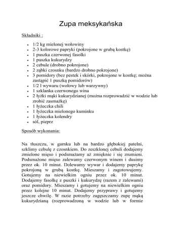 Zupa meksykańska Składniki : 1/2 kg mielonej wołowiny 2-3 kolorowe papryki (pokrojone w grubą kostkę) 1 puszka czerwonej fasolki 1 puszka kukurydzy 2 cebule (drobno pokrojone) 2 ząbki czosnku (bardzo drobno pokrojone) 3 pomidory (bez pestek i skórki, pokrojone w kostkę; można zastąpić 1 puszką pomidorów) 1/2 l wywaru (wołowy lub warzywny) 1 szklanka czerwonego wina 2 łyżki mąki kukurydzianej (można rozprowadzić w wodzie lub zrobić zasmażkę) 1 łyżeczka chili 1 łyżeczka mielonego kuminku 1 łyżeczka kolendry sól, pieprz Sposób wykonania: Na tłuszczu, w garnku lub na bardzo głębokiej patelni, szklimy cebulę z czosnkiem. Do zeszklonej cebuli dodajemy zmielone mięso i podsmażamy aż zmięknie i się zrumieni. Podsmażone mięso zalewamy czerwonym winem i dusimy przez ok. 10 minut. Dolewamy wywar i dodajemy paprykę pokrojoną w grubą kostkę. Mieszamy i zagotowujemy. Gotujemy na niewielkim ogniu przez ok. 10 minut. Dodajemy fasolkę z puszki i kukurydzę (razem z zalewami) oraz pomidory. Mieszamy i gotujemy na niewielkim ogniu przez kolejne 10 minut. Dodajemy przyprawy i gotujemy jeszcze chwilę. W razie potrzeby zagęszczamy zupę mąką kukurydzianą (rozprowadzoną w wodzie lub w formie zasmażki).