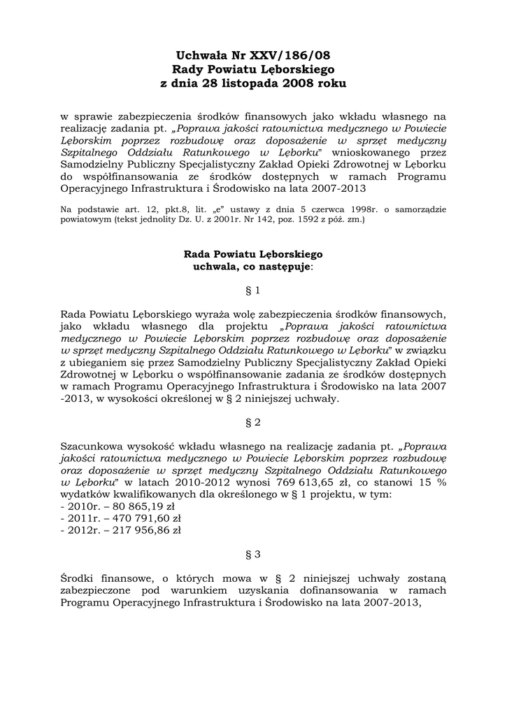 Uchwała Nr XXV/186/08 Rady Powiatu Lęborskiego z dnia 28 listopada 2008 roku w sprawie zabezpieczenia środków finansowych jako wkładu własnego na realizację zadania pt. „Poprawa jakości ratownictwa medycznego w Powiecie Lęborskim poprzez rozbudowę oraz doposażenie w sprzęt medyczny Szpitalnego Oddziału Ratunkowego w Lęborku” wnioskowanego przez Samodzielny Publiczny Specjalistyczny Zakład Opieki Zdrowotnej w Lęborku do współfinansowania ze środków dostępnych w ramach Programu Operacyjnego Infrastruktura i Środowisko na lata 2007-2013 Na podstawie art. 12, pkt.8, lit. „e” ustawy z dnia 5 czerwca 1998r. o samorządzie powiatowym (tekst jednolity Dz. U. z 2001r. Nr 142, poz. 1592 z póź. zm.) Rada Powiatu Lęborskiego uchwala, co następuje: §1 Rada Powiatu Lęborskiego wyraża wolę zabezpieczenia środków finansowych, jako wkładu własnego dla projektu „Poprawa jakości ratownictwa medycznego w Powiecie Lęborskim poprzez rozbudowę oraz doposażenie w sprzęt medyczny Szpitalnego Oddziału Ratunkowego w Lęborku” w związku z ubieganiem się przez Samodzielny Publiczny Specjalistyczny Zakład Opieki Zdrowotnej w Lęborku o współfinansowanie zadania ze środków dostępnych w ramach Programu Operacyjnego Infrastruktura i Środowisko na lata 2007 -2013, w wysokości określonej w § 2 niniejszej uchwały. §2 Szacunkowa wysokość wkładu własnego na realizację zadania pt. „Poprawa jakości ratownictwa medycznego w Powiecie Lęborskim poprzez rozbudowę oraz doposażenie w sprzęt medyczny Szpitalnego Oddziału Ratunkowego w Lęborku” w latach 2010-2012 wynosi 769 613,65 zł, co stanowi 15 % wydatków kwalifikowanych dla określonego w § 1 projektu, w tym: - 2010r. – 80 865,19 zł - 2011r. – 470 791,60 zł - 2012r. – 217 956,86 zł §3 Środki finansowe, o których mowa w § 2 niniejszej uchwały zostaną zabezpieczone pod warunkiem uzyskania dofinansowania w ramach Programu Operacyjnego Infrastruktura i Środowisko na lata 2007-2013, §4 Wykonanie uchwały powierza się Zarządowi Powiatu Lęborskiego. §5 Uchwała wchodzi w życie z dniem podjęcia. Uzasadnienie: Projektem, który SPS ZOZ w Lęborku planuje złożyć do dofinansowania w ramach Programu Operacyjnego Infrastruktura i Środowisko na lata 2007-2013 - priorytet XII. „Bezpieczeństwo zdrowotne i poprawa efektywności systemu ochrony zdrowia”, działanie 12.1 „Rozwój systemu ratownictwa medycznego” - jest „Poprawa jakości ratownictwa medycznego w Powiecie Lęborskim poprzez rozbudowę oraz doposażenie w sprzęt medyczny Szpitalnego Oddziału Ratunkowego w Lęborku” Zadaniem SPS ZOZ w Lęborku jest wykonywanie określonych przepisami prawa oraz statutem świadczeń zdrowotnych. W obliczu dynamicznych przemian społecznych, ekonomicznych i technologicznych, jakim podlega nasz kraj, w toku prowadzenia działalności statutowej jednostki, pojawiają się jednak trudności, które mogą być zniwelowane poprzez realizację projektu będącego przedmiotem niniejszego wniosku. Nadrzędnym celem projektu jest poprawa jakości ratownictwa medycznego poprzez rozbudowę oraz doposażenie w sprzęt medyczny Szpitalnego Oddziału Ratunkowego w Lęborku. W chwili obecnej SPS ZOZ w Lęborku zabezpiecza działania ratownicze na terenie całego Powiatu Lęborskiego. Szpitalny Oddział Ratunkowy odgrywa szczególną rolę w strukturze każdego szpitala. Szpitalny Oddział Ratunkowy udziela świadczeń opieki zdrowotnej polegających na wstępnej diagnostyce oraz podjęciu leczenia w zakresie niezbędnym dla stabilizacji funkcji życiowych osób, które znajdują się w stanie nagłego zagrożenia zdrowotnego. W szczególności dotyczy to wypadków, urazów, zatruć. Zgodnie z zasadą funkcjonowania SOR pacjenci są tam diagnozowani i leczeni max do 24 h. W tym czasie w stosunku do pacjentów są podejmowane decyzje w wyniku, których osoby leczone na SOR są wypisywane do domu i kierowane do dalszego leczenia w AOS, POZ lub ze względu na konieczność leczenia warunkach szpitalnych są kierowane do dalszego leczenia w oddziałach szpitalnych. Szpitalny Oddział Ratunkowy SPS ZOZ w Lęborku wchodzi w skład Zintegrowanego Systemu Ratownictwa Województwa Pomorskiego. Ze względu na fakt, iż jest to jedyny SOR we wschodniej części województwa pomorskiego (najbliższy znajduje się, bowiem w miejscowości Wejherowo, 30 km na zachód do miasta Lębork, natomiast miasto Słupsk leżące we wschodniej części województwa nie posiada szpitalnego oddziału ratunkowego), jego znaczenie nie sposób przecenić. Ze względu na liczbę potencjalnych pacjentów (mieszkańców Powiatu, turystów, użytkowników drogi krajowej nr 6), SOR w Lęborku stanowi newralgiczny element w strukturze szpitala i jako taki podlega szczególnej dbałości, zarówno w zakresie odpowiednich kwalifikacji personelu, jak i sprzętu wykorzystywanego na oddziale. W chwili obecnej, aby SOR w Lęborku spełnił wszelkie wymagania, jakie dla tego rodzaju oddziałów przewiduje ROZPORZĄDZENIE MINISTRA ZDROWIA z dnia 15 marca 2007 r. w sprawie szpitalnego oddziału ratunkowego, należy go rozbudować i odpowiednio doposażyć. Ze względu na szczególną rolę SOR, projekt związany z jego modernizacją i rozbudową należy uznać za priorytetowy. Realizacja projektu pozwoli ponadto na pełne włączenie się SPS ZOZ w Lęborku w system ratownictwa medycznego w Polsce. W ramach Programu Operacyjnego Infrastruktura i Środowisko na lata 2007-2013 istnieje możliwość uzyskania dofinansowania projektów związanych z przebudową, rozbudową i remontem obiektów związanych z infrastrukturą ochrony zdrowia w zakresie ratownictwa medycznego (szpitalne oddziały ratunkowe istniejące lub planowane do utworzenia zgodnie z wojewódzkim planem działania systemu) w taki sposób, aby dostosować je do wymogów określonych w obowiązujących przepisach prawa, zakupem wyrobów medycznych służących do diagnostyki lub 
