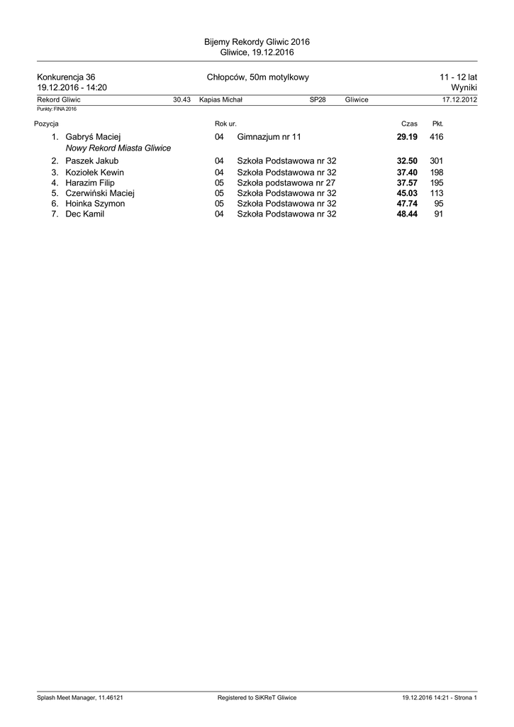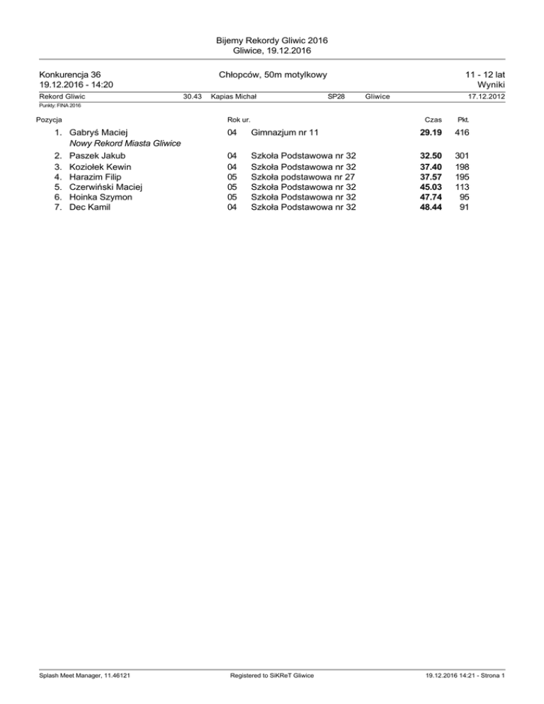 Bijemy Rekordy Gliwic 2016 Gliwice, 19.12.2016 Chłopców, 50m motylkowy Konkurencja 36 19.12.2016 - 14:20 Rekord Gliwic 30.43 Kapias Michał 11 - 12 lat Wyniki SP28 Gliwice 17.12.2012 Punkty: FINA 2016 Pozycja 1. Gabryś Maciej Nowy Rekord Miasta Gliwice 2. Paszek Jakub 3. Koziołek Kewin 4. Harazim Filip 5. Czerwiński Maciej 6. Hoinka Szymon 7. Dec Kamil Splash Meet Manager, 11.46121 Rok ur. Czas Pkt. 04 Gimnazjum nr 11 29.19 416 04 04 05 05 05 04 Szkoła Podstawowa nr 32 Szkoła Podstawowa nr 32 Szkoła podstawowa nr 27 Szkoła Podstawowa nr 32 Szkoła Podstawowa nr 32 Szkoła Podstawowa nr 32 32.50 37.40 37.57 45.03 47.74 48.44 301 198 195 113 95 91 Registered to SiKReT Gliwice 19.12.2016 14:21 - Strona 1