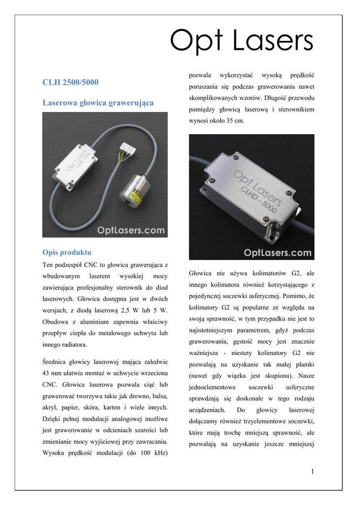Opt Lasers pozwala CLH 2500/5000 wykorzystać wysoką prędkość poruszania się podczas grawerowania nawet Laserowa głowica grawerująca skomplikowanych wzorów. Długość przewodu pomiędzy głowicą laserową i sterownikiem wynosi około 35 cm. Opis produktu Ten podzespół CNC to głowica grawerująca z mocy Głowica nie używa kolimatorów G2, ale zawierająca profesjonalny sterownik do diod innego kolimatora również korzystającego z laserowych. Głowica dostępna jest w dwóch pojedynczej soczewki asferycznej. Pomimo, że wersjach, z diodą laserową 2,5 W lub 5 W. kolimatory G2 są popularne ze względu na Obudowa z aluminium zapewnia właściwy swoją sprawność, w tym przypadku nie jest to przepływ ciepła do metalowego uchwytu lub najistotniejszym parametrem, gdyż podczas innego radiatora. grawerowania, gęstość mocy jest znacznie wbudowanym laserem wysokiej ważniejsza - niestety kolimatory G2 nie Średnica głowicy laserowej mająca zaledwie pozwalają na uzyskanie tak małej plamki 43 mm ułatwia montaż w uchwycie wrzeciona (nawet gdy wiązka jest skupiona). Nasze CNC. Głowica laserowa pozwala ciąć lub jednoelementowe grawerować tworzywa takie jak drewno, balsa, sprawdzają się doskonale w tego rodzaju akryl, papier, skóra, karton i wiele innych. urządzeniach. Dzięki pełnej modulacji analogowej możliwe dołączamy również trzyelementowe soczewki, jest grawerowanie w odcieniach szarości lub które mają trochę mniejszą sprawność, ale zmienianie mocy wyjściowej przy zawracaniu. pozwalają na uzyskanie jeszcze mniejszej soczewki Do głowicy asferyczne laserowej Wysoka prędkość modulacji (do 100 kHz) 1 Opt Lasers dzięki plamki, której osiągamy większą gęstość mocy. (rurka nie jest dołączana do zestawu). Uchwyt może być zamocowany do maszyny za W zależności od wybranej wersji, moduł pomocą śrub M6 (dwie śruby M6 o długości 30mm są w zestawie). posiada: a) 5W głowica laserową CLH - 5000 Nowa (osiągająca do 6W) dioda laserowa NUBM44 450. Możliwe jest uzyskanie mocy ponad 5W przy delikatnym Instrukcja podkręceniu sugeruje diody. podanie 3,5A prądu, my używamy 3,6 - 3,7A by uzyskać >5W przy użyciu jednosoczewkowego kolimatora. b) 2,5W głowica laserowa CLH - 2500 Nowa 1,6W (osiągająca do 3W) 445 nm dioda laserowa NDB7875 firmy Nichia. Instrukcja sugeruje podanie 1,6A prądu, my używamy 2A aby uzyskać 2,5W przy użyciu Dane techniczne 445 nm rzeczywistości bliska jest ona 5000 godzin. Długość fali Moc optyczna na wyjściu w temp. 25*C Sterowanie Maksymalna częstotliwość sygnału sterującego Napięcie zasilania Aby osiągnąć dłuższą żywotność należy Napięcie sygnału sterującego 0-5V zadbać o odpowiednie chłodzenie głowicy. Długość ogniskowej Do ustawienia Średnica głowicy laserowej 43 mm Możliwy Długość głowicy laserowej 50 mm jednosoczewkowego kolimatora. Żywotność diody laserowej podana przez producenta to 10000 godzin, jednak w jest również zakup wersji z 2,5 W 5W TTL lub analogowe Max 100kHz 7,5 - 12 V dodatkowym uchwytem aluminiowym, który pozwala na zamontowanie głowicy laserowej na ruchomej części maszyny. Pojedynczy otwór o średnicy 6 mm przeznaczony jest do instalacji rurki ze sprężonym powietrzem 2 Opt Lasers Sposób podłączenia głowicy Jak zasilać głowicę grawerującą grawerującej W zależności od wersji głowicy, wymagana jest odpowiednia wydajność zasilaczy: Wersja Zasilanie 2,5 W 445 nm 7,5 V 3 A 5 W 445 nm 7,5 V 5 A Ustawianie odległości skupienia Trudno jest zmierzyć dokładną odległość przewężenia wiązki od głowicy laserowej. Ustawianie odległości skupienia wiązki powinno się odbywać poprzez obracanie kolimatora. Po wstępnym ustawieniu kolimator należy zabezpieczyć przed obracaniem. Wżywając osi Z maszyny CNC dobieramy najoptymalniejszą odległość głowicy od materiału . Wielkość skupionej plamki zależy od używanego typu kolimatora i jego odległości od diody laserowej. Należy uważać przy wykręcaniu kolimatora, ponieważ może wypaść i zabrudzić trzysoczewkowych się/zniszczyć. kolimatorów Dla odległość skupienia wiązki powinna mieścić się w zakresie pomiędzy 120 i 40mm, a dla jednosoczewkowych powinna wynosić między Uwaga: 100 a 20mm. Niemniej jednak właściwa Należy używać obu przewodów GND. odległość skupienia powinna być ustawiona po wykonaniu testu na odpowiednim materiale. 3 Opt Lasers Uwaga! - Nigdy nie kieruj głowicy laserowej w stronę lub ludzi zwierząt - Zawsze używaj okularów ochronnych - Kolimator powinien być zawsze czysty - Ostrożnie obchodź się z urządzeniem - Używaj zestawu anty-ESD podczas montażu - Zawsze używaj odpowiednich osłon ochronnych przeciw odbitemu promieniowaniu laserowemu na światło o długości fali 430 - 480 instalowanych na maszynę CNC. nm, Zalecenia i wymagania Wejście modulacji może być stosowane jako wejście TTL z poziomami logicznymi 0V i 5V lub jako wejście analogowe. Analogowa modulacja oznacza, że za pomocą 2,5 V na wejściu analogowym otrzymuje się 50% mocy wyjściowej, analogicznie przy użyciu 4 V otrzymuje się 80% mocy wyjściowej, itd. Ponieważ bardzo ważne jest, aby zapewnić odpowiednie chłodzenie, głowica laserowa powinna zostać zamontowana w metalowej części, podobnej do części trzymającej wrzeciono. Maksymalna temperatura pracy głowicy laserowej to 35 stopni Celsjusza. Użytkownik powinien monitorować temperaturę i wyłączać głowicę lasera w przypadku przegrzania. Czyszczenie optyki jest istotnym aspektem, ponieważ zabrudzone części optyczne odbijają pewien procent energii z powrotem do diody, co może spowodować nieodwracalne szkody. 4 Opt Lasers Soczewki w razie potrzeby należy czyścić alkoholem propylowym lub innym preparatem dedykowanym do czyszczenia soczewek. Przepływ powietrza jest również bardzo ważny w procesie grawerowania, ponieważ wydmuchuje on ciemny dym, który powoduje o