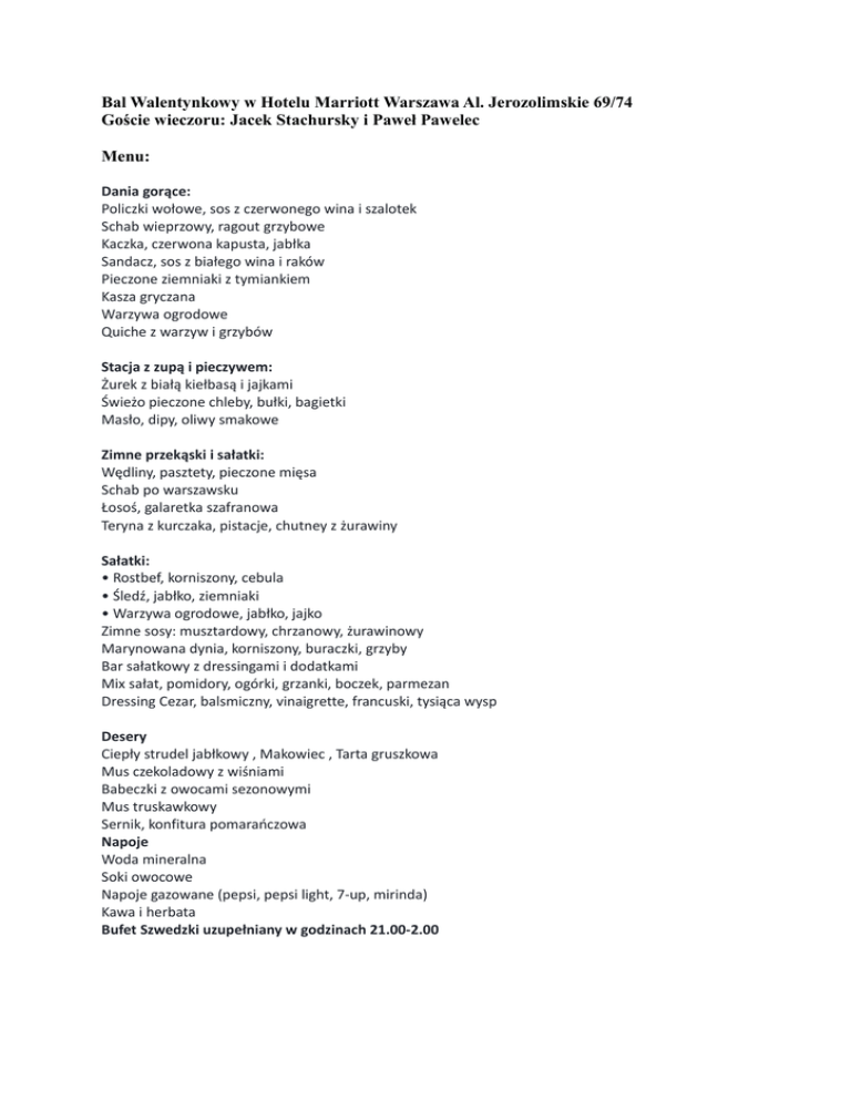 Bal Walentynkowy w Hotelu Marriott Warszawa Al. Jerozolimskie 69/74 Goście wieczoru: Jacek Stachursky i Paweł Pawelec Menu: Dania gorące: Policzki wołowe, sos z czerwonego wina i szalotek Schab wieprzowy, ragout grzybowe Kaczka, czerwona kapusta, jabłka Sandacz, sos z białego wina i raków Pieczone ziemniaki z tymiankiem Kasza gryczana Warzywa ogrodowe Quiche z warzyw i grzybów Stacja z zupą i pieczywem: Żurek z białą kiełbasą i jajkami Świeżo pieczone chleby, bułki, bagietki Masło, dipy, oliwy smakowe Zimne przekąski i sałatki: Wędliny, pasztety, pieczone mięsa Schab po warszawsku Łosoś, galaretka szafranowa Teryna z kurczaka, pistacje, chutney z żurawiny Sałatki: • Rostbef, korniszony, cebula • Śledź, jabłko, ziemniaki • Warzywa ogrodowe, jabłko, jajko Zimne sosy: musztardowy, chrzanowy, żurawinowy Marynowana dynia, korniszony, buraczki, grzyby Bar sałatkowy z dressingami i dodatkami Mix sałat, pomidory, ogórki, grzanki, boczek, parmezan Dressing Cezar, balsmiczny, vinaigrette, francuski, tysiąca wysp Desery Ciepły strudel jabłkowy , Makowiec , Tarta gruszkowa Mus czekoladowy z wiśniami Babeczki z owocami sezonowymi Mus truskawkowy Sernik, konfitura pomarańczowa Napoje Woda mineralna Soki owocowe Napoje gazowane (pepsi, pepsi light, 7-up, mirinda) Kawa i herbata Bufet Szwedzki uzupełniany w godzinach 21.00-2.00