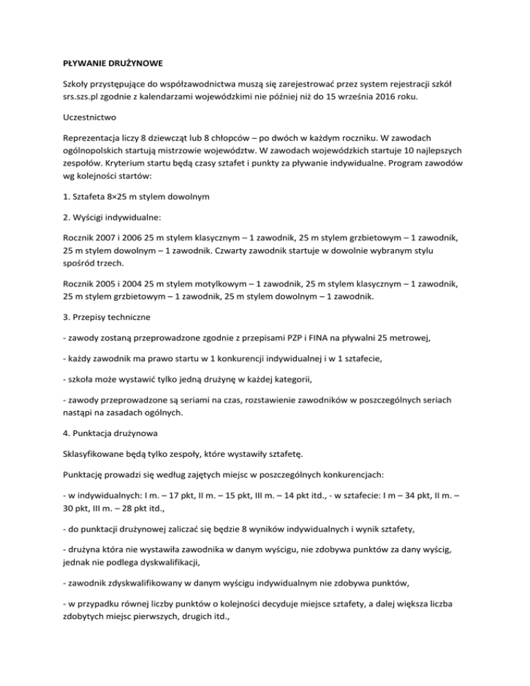 PŁYWANIE DRUŻYNOWE Szkoły przystępujące do współzawodnictwa muszą się zarejestrować przez system rejestracji szkół srs.szs.pl zgodnie z kalendarzami wojewódzkimi nie później niż do 15 września 2016 roku. Uczestnictwo Reprezentacja liczy 8 dziewcząt lub 8 chłopców – po dwóch w każdym roczniku. W zawodach ogólnopolskich startują mistrzowie województw. W zawodach wojewódzkich startuje 10 najlepszych zespołów. Kryterium startu będą czasy sztafet i punkty za pływanie indywidualne. Program zawodów wg kolejności startów: 1. Sztafeta 8×25 m stylem dowolnym 2. Wyścigi indywidualne: Rocznik 2007 i 2006 25 m stylem klasycznym – 1 zawodnik, 25 m stylem grzbietowym – 1 zawodnik, 25 m stylem dowolnym – 1 zawodnik. Czwarty zawodnik startuje w dowolnie wybranym stylu spośród trzech. Rocznik 2005 i 2004 25 m stylem motylkowym – 1 zawodnik, 25 m stylem klasycznym – 1 zawodnik, 25 m stylem grzbietowym – 1 zawodnik, 25 m stylem dowolnym – 1 zawodnik. 3. Przepisy techniczne - zawody zostaną przeprowadzone zgodnie z przepisami PZP i FINA na pływalni 25 metrowej, - każdy zawodnik ma prawo startu w 1 konkurencji indywidualnej i w 1 sztafecie, - szkoła może wystawić tylko jedną drużynę w każdej kategorii, - zawody przeprowadzone są seriami na czas, rozstawienie zawodników w poszczególnych seriach nastąpi na zasadach ogólnych. 4. Punktacja drużynowa Sklasyfikowane będą tylko zespoły, które wystawiły sztafetę. Punktację prowadzi się według zajętych miejsc w poszczególnych konkurencjach: - w indywidualnych: I m. – 17 pkt, II m. – 15 pkt, III m. – 14 pkt itd., - w sztafecie: I m – 34 pkt, II m. – 30 pkt, III m. – 28 pkt itd., - do punktacji drużynowej zaliczać się będzie 8 wyników indywidualnych i wynik sztafety, - drużyna która nie wystawiła zawodnika w danym wyścigu, nie zdobywa punktów za dany wyścig, jednak nie podlega dyskwalifikacji, - zawodnik zdyskwalifikowany w danym wyścigu indywidualnym nie zdobywa punktów, - w przypadku równej liczby punktów o kolejności decyduje miejsce sztafety, a dalej większa liczba zdobytych miejsc pierwszych, drugich itd., - prowadzi się oddzielnie punktację dla dziewcząt i chłopców, - dodatkowy wyścig po wyczerpaniu w/w kryteriów,