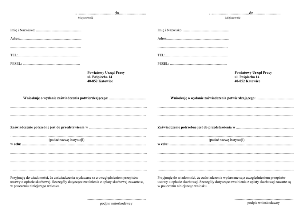 ….................................dn......................... Miejscowość ….................................dn......................... Miejscowość Imię i Nazwisko: .................................................. Imię i Nazwisko: .................................................. Adres:.................................................................... Adres:.................................................................... .............................................................................. .............................................................................. TEL:..................................................................... TEL:..................................................................... PESEL: ............................................................... PESEL: ............................................................... Powiatowy Urząd Pracy ul. Pośpiecha 14 40-852 Katowice Powiatowy Urząd Pracy ul. Pośpiecha 14 40-852 Katowice Wnioskuję o wydanie zaświadczenia potwierdzającego: ......................................... Wnioskuję o wydanie zaświadczenia potwierdzającego: ......................................... ....................................................................................................................................................... ....................................................................................................................................................... ...................................................................................................................................................... ...................................................................................................................................................... Zaświadczenie potrzebne jest do przedstawienia w ................................................................ Zaświadczenie potrzebne jest do przedstawienia w ................................................................ ….................................................................................................................................................. (podać nazwę instytucji) w celu: ......................................................................................................................................... ….................................................................................................................................................. (podać nazwę instytucji) w celu: ......................................................................................................................................... ....................................................................................................................................................... ....................................................................................................................................................... ....................................................................................................................................................... ....................................................................................................................................................... …................................................................................................................................................... …................................................................................................................................................... Przyjmuję do wiadomości, że zaświadczenia wydawane są z uwzględnieniem przepisów ustawy o opłacie skarbowej. Szczegóły dotyczące zwolnienia z opłaty skarbowej zawarte są w pouczeniu niniejszego wniosku. Przyjmuję do wiadomości, że zaświadczenia wydawane są z uwzględnieniem przepisów ustawy o opłacie skarbowej. Szczegóły dotyczące zwolnienia z opłaty skarbowej zawarte są w pouczeniu niniejszego wniosku. ................................................................. podpis wnioskodawcy ................................................................. podpis wnioskodawcy Nie podlega opłacie skarbowej: 1) dokonanie czynności urzędowej, wydanie zaświadczenia i zezwolenia (pozwolenia, koncesji) albo złożenie dokumentu stwierdzającego udzielenie pełnomocnictwa lub prokury albo jego odpisu, wypisu lub kopii w sprawach: a) alimentacyjnych, opieki, kurateli i przysposobienia, b) ubezpieczenia społecznego, ubezpieczenia zdrowotnego, rent strukturalnych, ulg określonych w przepisach szczególnych dla żołnierzy niezawodowych i osób odbywających służbę zastępczą oraz ich rodzin, a także uprawnień dla osób niepełnosprawnych i osób objętych przepisami o szczególnych uprawnieniach dla kombatantów, c) świadczeń socjalnych oraz w sprawach załatwianych na podstawie przepisów o pomocy społecznej, przepisów o wspieraniu rodziny i systemie pieczy zastępczej oraz przepisów o zatrudnieniu socjalnym, d) wyboru Prezydenta Rzeczypospolitej Polskiej, wyborów do Sejmu, Senatu, Parlamentu Europejskiego i organów samorządu terytorialnego oraz referendum, e) powszechnego obowiązku obrony, z wyjątkiem decyzji w sprawach udzielania zgody obywatelom polskim na służbę w obcym wojsku lub w obcej organizacji wojskowej, f) zatrudnienia, wynagrodzeń za pracę, g) nauki, szkolnictwa i oświaty pozaszkolnej oraz ochrony zdrowia, h) załatwianych na podstawie przepisów ustawy z dnia 21 sierpnia 1997 r. o gospodarce nieruchomościami, i) nabycia obywatelstwa polskiego w drodze repatriacji oraz stwierdzenia posiadania obywatelstwa polskiego nabytego w ten sposób, j) pobytu na terytorium Rzeczypospolitej Polskiej obywateli państw członkowskich Unii Europejskiej, państw członkowskich Europejskiego Porozumienia o Wolnym Handlu (EFTA) - stron umowy o Europejskim Obszarze Gospodarczym lub Konfederacji Szwajcarskiej, oraz członków ich ro