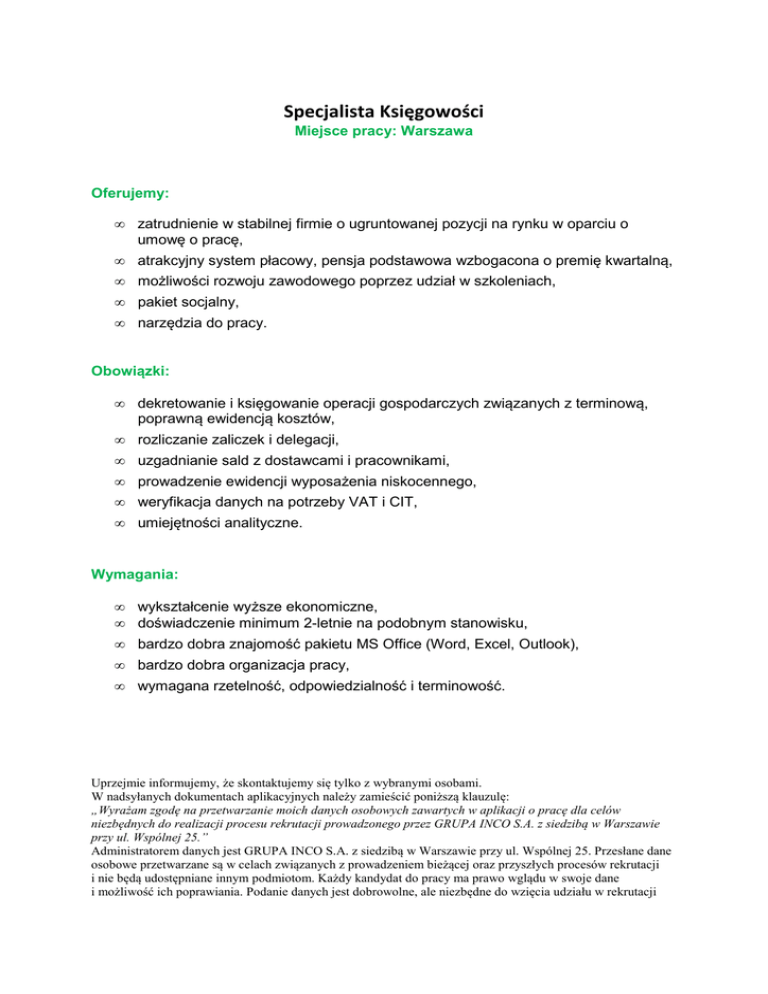 Specjalista Księgowości Miejsce pracy: Warszawa Oferujemy: • zatrudnienie w stabilnej firmie o ugruntowanej pozycji na rynku w oparciu o umowę o pracę, • atrakcyjny system płacowy, pensja podstawowa wzbogacona o premię kwartalną, • możliwości rozwoju zawodowego poprzez udział w szkoleniach, • pakiet socjalny, • narzędzia do pracy. Obowiązki: • dekretowanie i księgowanie operacji gospodarczych związanych z terminową, poprawną ewidencją kosztów, • rozliczanie zaliczek i delegacji, • uzgadnianie sald z dostawcami i pracownikami, • prowadzenie ewidencji wyposażenia niskocennego, • weryfikacja danych na potrzeby VAT i CIT, • umiejętności analityczne. Wymagania: • • wykształcenie wyższe ekonomiczne, doświadczenie minimum 2-letnie na podobnym stanowisku, • bardzo dobra znajomość pakietu MS Office (Word, Excel, Outlook), • bardzo dobra organizacja pracy, • wymagana rzetelność, odpowiedzialność i terminowość. Uprzejmie informujemy, że skontaktujemy się tylko z wybranymi osobami. W nadsyłanych dokumentach aplikacyjnych należy zamieścić poniższą klauzulę: „Wyrażam zgodę na przetwarzanie moich danych osobowych zawartych w aplikacji o pracę dla celów niezbędnych do realizacji procesu rekrutacji prowadzonego przez GRUPA INCO S.A. z siedzibą w Warszawie przy ul. Wspólnej 25.” Administratorem danych jest GRUPA INCO S.A. z siedzibą w Warszawie przy ul. Wspólnej 25. Przesłane dane osobowe przetwarzane są w celach związanych z prowadzeniem bieżącej oraz przyszłych procesów rekrutacji i nie będą udostępniane innym podmiotom. Każdy kandydat do pracy ma prawo wglądu w swoje dane i możliwość ich poprawiania. Podanie danych jest dobrowolne, ale niezbędne do wzięcia udziału w rekrutacji
