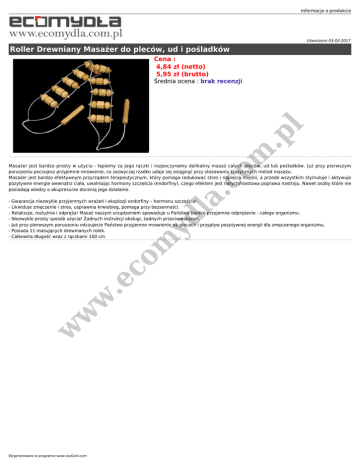 Informacje o produkcie Utworzono 03-03-2017 Roller Drewniany Masażer do pleców, ud i pośladków Cena : 4,84 zł (netto) 5,95 zł (brutto) co m .p l Średnia ocena : brak recenzji m yd la . Masażer jest bardzo prosty w użyciu - łapiemy za jego rączki i rozpoczynamy delikatny masaż całych pleców, ud lub pośladków. Już przy pierwszym poruszeniu poczujesz przyjemne mrowienie, co zazwyczaj rzadko udaje się osiągnąć przy stosowaniu klasycznych metod masażu. Masażer jest bardzo efektywnym przyrządem terapeutycznym, który pomaga redukować stres i napięcia mięśni, a przede wszystkim stymuluje i aktywuje pozytywne energie wewnątrz ciała, uwalniając hormony szczęścia (endorfiny), czego efektem jest natychmiastowa poprawa nastroju. Nawet osoby które nie posiadają wiedzy o akupresurze docenią jego działanie. w w w .e co - Gwarancja niezwykle przyjemnych wrażeń i eksplozji endorfiny – hormonu szczęścia! - Likwiduje zmęczenie i stres, usprawnia krwiobieg, pomaga przy bezsenności. - Relaksuje, rozluźnia i odpręża! Masaż naszym urządzeniem spowoduje u Państwa bardzo przyjemne odprężenie - całego organizmu. - Niezwykle prosty sposób użycia! Żadnych instrukcji obsługi, żadnych przeciwwskazań. - Już przy pierwszym poruszeniu odczujecie Państwo przyjemne mrowienie na plecach i przypływ pozytywnej energii dla zmęczonego organizmu. - Posiada 11 masujących drewnianych rolek. - Całkowita długość wraz z rączkami 100 cm Wygenerowano w programie www.oscGold.com