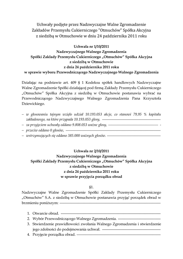 Uchwały podjęte przez Nadzwyczajne Walne Zgromadzenie Zakładów Przemysłu Cukierniczego "Otmuchów" Spółka Akcyjna z siedzibą w Otmuchowie w dniu 24 października 2011 roku Uchwała nr 1/10/2011 Nadzwyczajnego Walnego Zgromadzenia Spółki Zakłady Przemysłu Cukierniczego „Otmuchów” Spółka Akcyjna z siedzibą w Otmuchowie z dnia 24 października 2011 roku w sprawie wyboru Przewodniczącego Nadzwyczajnego Walnego Zgromadzenia Działając na podstawie art. 409 § 1 Kodeksu spółek handlowych Nadzwyczajne Walne Zgromadzenie Spółki działającej pod firmą Zakłady Przemysłu Cukierniczego „Otmuchów” Spółka Akcyjna z siedzibą w Otmuchowie postanawia wybrać na Przewodniczącego Nadzwyczajnego Walnego Zgromadzenia Pana Krzysztofa Dziewickiego. w głosowaniu tajnym wzięło udział 10.193.053 akcje, co stanowi 79,95 % kapitału zakładowego, na które przypada 10.193.053 głosy, ----------------------------------------------- za przyjęciem uchwały oddano 9.808.053 ważne głosy, ----------------------------------------- przeciw oddano 0 głosów, ----------------------------------------------------------------------------- wstrzymujących się oddano 385.000 ważnych głosów. -------------------------------------------- Uchwała nr 2/10/2011 Nadzwyczajnego Walnego Zgromadzenia Spółki Zakłady Przemysłu Cukierniczego „Otmuchów” Spółka Akcyjna z siedzibą w Otmuchowie z dnia 24 października 2011 roku w sprawie przyjęcia porządku obrad §1. Nadzwyczajne Walne Zgromadzenie Spółki Zakłady Przemysłu Cukierniczego „Otmuchów” S.A. z siedzibą w Otmuchowie postanawia przyjąć porządek obrad w brzmieniu poniższym: ----------------------------------------------------------------------------------1. Otwarcie obrad. ---------------------------------------------------------------------------------2. Wybór Przewodniczącego Walnego Zgromadzenia. ----------------------------------3. Stwierdzenie prawidłowości zwołania Walnego Zgromadzenia i stwierdzenie jego zdolności do podejmowania uchwał. -----------------------------------------------4. Przyjęcie porządku obrad. --------------------------------------------------------------------- 5. Podjęcie uchwały w sprawie wyrażenia zgody na zbycie zorganizowanej części przedsiębiorstwa Spółki do spółki zależnej od Spółki. -----------------------6. Podjęcie uchwały w sprawie zmiany Statutu Spółki. ---------------------------------7. Podjęcie uchwały w sprawie upoważnienia Rady Nadzorczej do ustalenia tekstu jednolitego Statutu Spółki. ----------------------------------------------------------8. Podjęcie uchwały w sprawie zmiany Regulaminu Obrad Walnego Zgromadzenia Zakłady Przemysłu Cukierniczego „Otmuchów” S.A. z siedzibą w Otmuchowie. ---------------------------------------------------------------------9. Podjęcie uchwały w sprawie upoważnienia Rady Nadzorczej do ustalenia tekstu jednolitego Regulaminu Obrad Walnego Zgromadzenia Zakłady Przemysłu Cukierniczego „Otmuchów” S.A. z siedzibą w Otmuchowie. -------10. Rozpatrzenie i zatwierdzenie rocznego skonsolidowanego sprawozdania finansowego grupy kapitałowej w rozumieniu przepisów o rachunkowości za 2010 rok. -------------------------------------------------------------------------------------------11. Rozpatrzenie i zatwierdzenie sprawozdania Zarządu z działalności grupy kapitałowej w rozumieniu przepisów o rachunkowości za 2010 rok. ------------12. Podjęcie uchwały w sprawie odwołania Członka Rady Nadzorczej. ------------13. Podjęcie uchwały w sprawie powołania Członka Rady Nadzorczej. -------------14. Zamknięcie obrad. ------------------------------------------------------------------------------§2. Uchwała wchodzi w życie z dniem podjęcia. ---------------------------------------------------- w głosowaniu wzięło udział 10.193.053 akcje, co stanowi 79,95 % kapitału zakładowego, na które przypada 10.193.053 głosy, ---------------------------------------------------------------- za przyjęciem uchwały oddano 10.193.053 ważne głosy, --------------------------------------- przeciw oddano 0 głosów, ----------------------------------------------------------------------------- wstrzymujących się 0 głosów. ------------------------------------------------------------------------Uchwała nr 3/10/2011 Nadzwyczajnego Walnego Zgromadzenia Spółki Zakłady Przemysłu Cukierniczego „Otmuchów” Spółka Akcyjna z siedzibą w Otmuchowie z dnia 24 października 2011 roku w sprawie wyrażenia zgody na zbycie zorganizowanej części przedsiębiorstwa Spółki do spółki zależnej od Spółki §1 1. Nadzwyczajne Walne Zgromadzenie Spółki Zakłady Przemysłu Cukierniczego „Otmuchów” S.A. z siedzibą w Otmuchowie postanawia wyrazić zgodę na zbycie zorganizowanej części przedsiębiorstwa Spółki, określonej w ustępach 2, 3, 4 i 5 tego paragrafu niniejszej uchwały, do spółki zależnej, a to poprzez wniesienie przez Spółkę wkładu niepieniężnego w postaci wskazanej zorganizowanej części przedsiębiorstwa Spółki do Spółki MW Legal 8 Spółki z o.o. z siedzibą w Warszawie, ul. Mokotowska 15A/17, 00-640 Warszawa, wpisanej do rejestru przedsiębiorców Krajowego Rejestru Sądowego prowadzonego przez Sąd Rejonowy dla m.st. Warszawy w Warszawie - XII Wydział Gospodarczy KRS pod numerem KRS 0000374377, NIP: 701-027-55-29, REGON: 142751791, kapitał zakładowy w wysokości 5.000 zł w całości opłacony, co nastąpi na pokrycie objętych przez Spółkę nowoutworzonych udziałów lub podwyższonej wartości nominalnej dotychczasowych udziałów w podwyższonym kapitale zakładowym przywołanej powyżej MW Legal 8 Spółki z o.o. z siedzibą w Warszawie. -------2. Zorganizowana część przedsiębiorstwa Spółki, o której mowa w ustępie poprzedzającym tego paragrafu niniejszej uchwały, obejmuje Dział Marketingu i Zarządzania Własnością Intelektualną, wyodrębn
