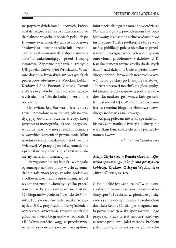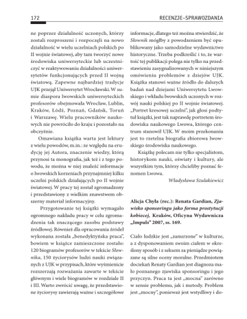 172 ne poprzez działalność uczonych, którzy zostali rozproszeni i rozpoczęli na nowo działalność w wielu uczelniach polskich po II wojnie światowej, aby tam tworzyć nowe środowiska uniwersyteckie lub uczestniczyć w reaktywowaniu działalności uniwersytetów funkcjonujących przed II wojną światową. Zapewne najbardziej tradycje UJK przejął Uniwersytet Wrocławski. W sumie diaspora lwowskich uniwersyteckich profesorów obejmowała Wrocław, Lublin, Kraków, Łódź, Poznań, Gdańsk, Toruń i Warszawę. Wielu pracowników naukowych nie powróciło do kraju i pozostało na obczyźnie. Omawiana książka warta jest lektury z wielu powodów, m.in.: ze względu na erudycję jej Autora, znaczenie wiedzy, którą przynosi ta monografia, jak też i z tego powodu, że można w niej znaleźć informacje o lwowskich korzeniach przynajmniej kilku uczelni polskich działających po II wojnie światowej. W pracy tej został zgromadzony i przedstawiony z wielkim znawstwem obszerny materiał informacyjny. Przygotowanie tej książki wymagało ogromnego nakładu pracy w celu zgromadzenia tak znaczącego zasobu podstawy źródłowej. Również dla opracowania źródeł wykonana została „benedyktyńska praca”, bowiem w książce zamieszczone zostało: 120 biogramów profesorów w tekście Słownika, 150 życiorysów ludzi nauki związanych z UJK w przypisach, które wyśmienicie rozszerzają rozważania zawarte w tekście głównym i wiele biogramów w rozdziale II i III. Warto zwrócić uwagę, że przedstawione życiorysy zawierają ważne i szczegółowe RECENZJE–SPRAWOZDANIA informacje, dlatego też można stwierdzić, że Słownik mógłby z powodzeniem być opublikowany jako samodzielne wydawnictwo historyczne. Trzeba podkreślić i to, że wartość tej publikacji polega nie tylko na przedstawieniu zasygnalizowanych w niniejszym omówieniu problemów z dziejów UJK. Książka stanowi ważne źródło do dalszych badań nad dziejami Uniwersytetu Lwowskiego i wkładu lwowskich uczonych w rozwój nauki polskiej po II wojnie światowej. „Portret kresowej uczelni”, jak głosi podtytuł książki, jest tak naprawdę portretem środowiska naukowego Lwowa, którego centrum stanowił UJK. W moim przekonaniu jest to rzetelna biografia zbiorowa lwowskiego środowiska naukowego. Książkę polecam nie tylko specjalistom, historykom nauki, oświaty i kultury, ale wszystkim tym, którzy chcieliby poznać fenomen Lwowa. Władysława Szulakiewicz Alicja Chyła (rec.): Renata Gardian, Zjawisko sponsoringu jako forma prostytucji kobiecej, Kraków, Oficyna Wydawnicza „Impuls” 2007, ss. 169. Ciało ludzkie jest „zanurzone” w kulturze, a z dysponowaniem swoim ciałem w określony sposób i z seksem za pieniądze powiązane są silne oceny moralne. Przedmiotem dociekań Renaty Gardian jest diagnoza mało poznanego zjawiska sponsoringu i jego przyczyn. Praca ta jest „mocna” zarówno w sensie problemu, jak i metody. Problem jest „mocny”, ponieważ jest wstydliwy i do- RECENZJE–SPRAWOZDANIA tyka kwestii, które mogą wskazywać społecznie istotne zagadnienia. Jest to książka idąca trochę „szlakiem” Barbary Fatygi czy Jacka Kurzępy1, poruszająca sprawy zapomniane, niechciane, nieestetyczne. Jeśli chodzi o metodę, to jest „mocna”, ponieważ takie badanie może skutkować etycznymi problemami, które omówię dalej. Podstawą tej książki była praca magisterska – o czym pisze jej autrka – ale i co widać w strukturze i stylu narracji. Jest skonstruowana typowo – dwie pierwsze części to zagadnienia terminologiczne związane z definiowaniem prostytucji, jej etiologii i z definiowaniem sponsoringu. Kolejna to metodologia badań i interpretacja wyników. Część terminologiczna zaczyna się od przytoczenia różnych definicji prostytucji. W wielu podkreślone jest, że cechą prostytucji jest brak więzi emocjonalnej z klientem oraz posiadanie większej liczby klientów niż jeden. Jak wynika z dalszej części książki nie jest to cechą sponsoringu. W następnej kolejności omówione są regulacje prawne dotyczące prostytucji w Polsce. Następnie autorka opisuje historię prostytucji. Wspomina o wykształconych, wpływowych, utalentowanych heterach i kurtyzanach, do których można porównać sponsorowane 1 B. Fatyga, Młodość bez skrzydeł: nastolatki w małym mieście: raport z badań i diagnoza sytuacji społeczno-kulturalnej, Warszawa 2001, B. Fatyga, J. Rogala-Obłękowska, Style życia młodzieży a narkotyki. Wyniki badań empirycznych, Warszawa 2002, J. Kurzępa, Młodzież pogranicza – „świnki” czyli o prostytucji nieletnich, Kraków 2005, J. Kurzępa, Socjopatologia pogranicza, Zielona Góra 2007; J. Kurzępa, Zagrożona niewinność: zakłócenia seksualności współczesnej młodzieży, Kraków 2007. 173 kobiety. Dalej opisuje etiologię prostytucji według różnych nurtów: biologiczno-psychologicznego, społeczno-ekonomicznego i kulturowo-środowiskowego. Część z opisywanych teorii dziś wydaje się wręcz komiczna – na przykład teoria z nurtu biologicznego Cesare Lombroso opisująca typ „urodzonej prostytutki”, którą miały charakteryzować nadmiernie rozwinięte szczęki i ogromne łechtaczki (s. 33–34). Niestety, autorka nie sytuuje tych teorii czasowo, nie jesteśmy więc w stanie się z książki dowiedzieć, że Lombroso pracował w drugiej połowie XIX wieku2. Cenne jest przywołanie zdania Jacka Kurzępy, który twierdzi, że wśród młodzieży dają się zauważyć postawy konsumpcyjne, które skutkują wzrostem potrzeb, kreowanych przez reklamę i media (s. 38). Szkoda, że zostało to jedynie zasygnalizowane, „ledwie muśnięte”, zaś Gardian nie opatrzyła tego własnym komentarzem. Nie ustosunkowuje się zresztą w żaden sposób do przywoływanych teorii. Na wątek kultury zwracam szczególną uwagę, ponieważ brakuje mi w tej książce osadzenia badanych zjawisk w kontekście społeczno-kulturowy