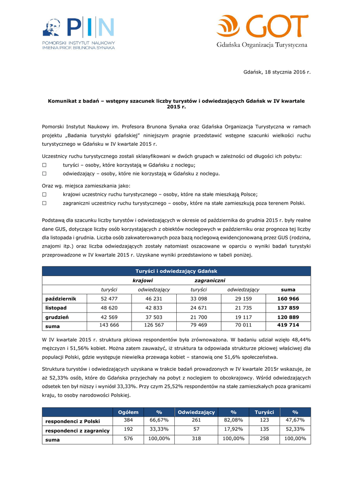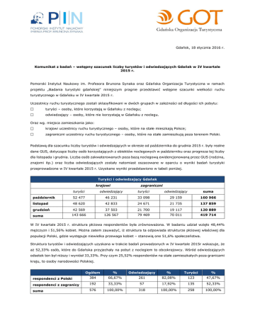 Gdańsk, 18 stycznia 2016 r. Komunikat z badań – wstępny szacunek liczby turystów i odwiedzających Gdańsk w IV kwartale 2015 r. Pomorski Instytut Naukowy im. Profesora Brunona Synaka oraz Gdańska Organizacja Turystyczna w ramach projektu „Badania turystyki gdańskiej” niniejszym pragnie przedstawić wstępne szacunki wielkości ruchu turystycznego w Gdańsku w IV kwartale 2015 r. Uczestnicy ruchu turystycznego zostali sklasyfikowani w dwóch grupach w zależności od długości ich pobytu: turyści – osoby, które korzystają w Gdańsku z noclegu; odwiedzający – osoby, które nie korzystają w Gdańsku z noclegu. Oraz wg. miejsca zamieszkania jako: krajowi uczestnicy ruchu turystycznego – osoby, które na stałe mieszkają Polsce; zagraniczni uczestnicy ruchu turystycznego – osoby, które na stałe zamieszkują poza terenem Polski. Podstawą dla szacunku liczby turystów i odwiedzających w okresie od października do grudnia 2015 r. były realne dane GUS, dotyczące liczby osób korzystających z obiektów noclegowych w październiku oraz prognoza tej liczby dla listopada i grudnia. Liczba osób zakwaterowanych poza bazą noclegową ewidencjonowaną przez GUS (rodzina, znajomi itp.) oraz liczba odwiedzających zostały natomiast oszacowane w oparciu o wyniki badań turystyki przeprowadzone w IV kwartale 2015 r. Uzyskane wyniki przedstawiono w tabeli poniżej. Turyści i odwiedzający Gdańsk krajowi zagraniczni turyści odwiedzający turyści odwiedzający suma październik 52 477 46 231 33 098 29 159 160 966 listopad 48 620 42 833 24 671 21 735 137 859 42 569 37 503 21 700 19 117 120 889 143 666 126 567 79 469 70 011 419 714 grudzień suma W IV kwartale 2015 r. struktura płciowa respondentów była zrównoważona. W badaniu udział wzięło 48,44% mężczyzn i 51,56% kobiet. Można zatem zauważyć, iż struktura ta odpowiada strukturze płciowej właściwej dla populacji Polski, gdzie występuje niewielka przewaga kobiet – stanowią one 51,6% społeczeństwa. Struktura turystów i odwiedzających uzyskana w trakcie badań prowadzonych w IV kwartale 2015r wskazuje, że aż 52,33% osób, które do Gdańska przyjechały na pobyt z noclegiem to obcokrajowcy. Wśród odwiedzających odsetek ten był niższy i wyniósł 33,33%. Przy czym 25,52% respondentów na stałe zamieszkałych poza granicami kraju, to osoby narodowości Polskiej. Ogółem % Odwiedzający % Turyści % respondenci z Polski 384 66,67% 261 82,08% 123 47,67% respondenci z zagranicy 192 33,33% 57 17,92% 135 52,33% suma 576 100,00% 318 100,00% 258 100,00% Zgodnie z uzyskanymi wynikami badania sondażowego, 40,9% respondentów z Polski pochodziła z województwa pomorskiego, zaś 12,0% z województwa mazowieckiego. 74,4% respondentów z tych dwóch województw deklarowało natomiast, iż ich pobyt w Gdańsku nie obejmował noclegu. województwo %turystów z Polski pomorskie 40,9% mazowieckie 12,0% podlaskie 9,1% warmińsko-mazurskie 8,9% Wśród respondentów z zagranicy dominowali goście z Wielkiej Brytanii. Na drugim miejscu uplasowały się osoby na stałe zamieszkujące w Niemczech, a na kolejnych miejscach respondenci z Holandii i Norwegii. Hiszpania 7,8% Norwegia 10,9% Holandia 10,9% Niemcy Wielka Brytania 14,1% 17,7% Przyjmując iż liczba powrotów stanowi pośredni wskaźnik zadowolenia respondentów z pobytu, miasto Gdańsk podobnie jak w dwóch poprzednich kwartałach, uzyskało bardzo korzystną notę. Wśród ogółu respondentów, aż 73,6% osób przyjechało do Gdańska po raz kolejny, w tym najliczniejszą grupę stanowiły osoby, które podobnie jak w III kwartale 2015 r. deklarowały, iż przyjeżdżają do Gdańska często, choć nieregularnie (36,8%). Pełne opracowanie wyników badania przeprowadzonego w IV kwartale 2015 r. dostępne będzie w Raporcie Turystyka Gdańska, którzy ukaże się już niedługo.