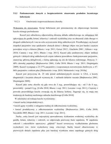 Plan Zarządzania Ryzykiem dla produktów generycznych zawierających cytrynian butamiratu. Wersja 1.2 VI.2 Podsumowanie danych o bezpieczeństwie stosowania produktu leczniczego Infectussic VI.2.1 Omówienie rozpowszechnienia choroby Wskazania do stosowania: Syrop Infectussic jest przeznaczony do objawowego leczenia kaszlu różnego pochodzenia Kaszel jest odruchową odpowiedzią obronną układu oddechowego na zalegającą lub spływającą do gardła, krtani, tchawicy i oskrzeli wydzielinę oraz na obecność ciała obcego w drogach oddechowych i ma na celu oczyszczenie dróg oddechowych. Przedłużający się kaszel niepokoi pacjentów oraz opiekunów chorych dzieci i dlatego objaw ten jest bardzo częstym powodem wizyt u lekarza [Blasio i wsp. 2011; Geiser 2012 ; Giachetto 2001 ; Gibson i wsp. 2010; Catania i wsp. 2011; Blasio i wsp. 2011]. Kaszel jako podstawowy objaw infekcji górnych i dolnych dróg oddechowych często zaburza prawidłowe funkcjonowanie pacjentów, stanowiąc główną dolegliwość, z którą zgłaszają się oni do lekarza rodzinnego. Dotyczy 3– 40% dorosłej populacji [Bręborowicz 2001; Cofta 2010; Blasio i wsp. 2011; Dicpinigatis 2009]. Kaszel występuje u 23-37% pacjentów z rozpoznanym nowotworem złośliwym, u 4786% pacjentów z rakiem płuc [Molassiotis i wsp. 2010; Molassiotis i wsp. 2010a]. Kaszel jest przyczyną ok. 25 mln porad ambulatoryjnych rocznie w USA, a koszty diagnostyki i leczenia chorych wynoszą ok. 1 miliarda dolarów rocznie [Bręborowicz 2001; Dicpinigatis 2009]. Kaszel jako ostry określa się gdy trwa do 3 tyg., przewlekający się - od 3 do 8 tyg., przewlekły - ponad 8 tyg. [Cofta 2010; Blasio i wsp. 2011; Leconte i wsp. 2011]. Częściej z powodu przewlekłego kaszlu zwracają się do lekarzy kobiety. Sugeruje się, że mają one tendencję do bardziej nasilonego odruchu kaszlowego [Cofta 2010]. W zależności od rodzaju kaszlu wyróżniamy: • kaszel suchy (nieproduktywny), • kaszel gęsty wynikły z zalegania trudnej do odkrztuszenia wydzieliny, • kaszel produktywny z odkrztuszaniem wydzieliny [Bręborowicz 2001; Cofta 2010; Szczeklik 2005; Blasio i wsp. 2011; Leconte i wsp. 2011]. Suchy, ostry kaszel jest najczęściej spowodowany ściekaniem wodnistej wydzieliny do gardła, krtani, tchawicy i oskrzeli, co odpowiada pierwszej fazie zapalenia. W zapaleniu oskrzeli i oskrzelików uporczywy „głęboki” kaszel towarzyszy wydłużonemu głośnemu wydechowi tzw. świst wydechowy (ang. wheezing). Suchy kaszel obserwowany w pierwszych dniach zapalenia płuc jest bardziej wynikiem stanu zapalnego górnych dróg Plan Zarządzania Ryzykiem dla produktów generycznych zawierających cytrynian butamiratu. Wersja 1.2 oddechowych niż procesu zapalnego w miąższu płuc, w którym nie wstępują receptory kaszlowe. Choć kaszel jest ważnym mechanizmem obronnym i według zasad klasycznej pulmonologii nie należy go tłumić, to lekarz praktyk leczący zakażenia dróg oddechowych (ZDO) spotyka się często z męczącym, a niekiedy nawet powodującym ból kaszlem, który wyczerpuje chorego, utrudnia pojenie lub karmienie dziecka, przyjmowanie leków, a także poważnie zaburza sen. Objawy te upośledzają proces zdrowienia i dlatego u takich chorych należy zmniejszyć nasilenie kaszlu. Z tego względu w pierwszych dniach ZDO, oprócz ochłodzenia wdychanego powietrza, można zastosować leki hamujące odruch kaszlowy [Hryniewicz i wsp. 2010; [Blasio i wsp. 2011; Catania i wsp. 2011]. U ponad 90% pacjentów istnieje możliwość określenia przyczyny kaszlu oraz podjęcia skutecznej terapii [Cofta 2010; Dicpinigatis 2009]. Kaszel jest jednym z podstawowych – obok oczyszczania śluzowo-rzęskowego – mechanizmów obronnych układu oddechowego, umożliwiających oczyszczanie dróg oddechowych z wydzieliny oraz ciał obcych, a zarazem jednym z podstawowych objawów chorób układu oddechowego. Jest skutkiem stymulacji zapalnej, mechanicznej, chemicznej. Polega na nagłym, eksplozywnym wydechu następującym po zaczerpnięciu głębokiego wdechu. Sekwencja wydarzeń podczas kaszlu obejmuje: głęboki wdech, zamknięcie głośni z rozluźnieniem przepony, skurcz mięśni wydechowych ze wzrostem ciśnienia w klatce piersiowej do 300 mm Hg oraz gwałtowne otwarcie głośni z wypchnięciem powietrza z prędkością równą 4/5 prędkości dźwięku. Kaszel może być zapoczątkowany zależnie od woli; możliwa jest również stymulacja pochodzenia centralnego [Blasio i wsp. 2011; Chung 2003; Dicpinigatis 1998; Leconte i wsp. 2011; Nosalova i wsp. 2007]. Podstawą odruchu kaszlowego jest łuk odruchowy, który składa się z 5 elementów: receptora kaszlu, włókien dośrodkowych (aferentnych), nerwów czuciowych (w nerwie błędnym i nerwach międzyżebrowych, krtaniowych twarzowych, górnych, trójdzielnych, także w nerwach podjęzykowych), przeponowych, ośrodka kaszlu (prawdopodobnie w rdzeniu przedłużonym), włókien odśrodkowych (eferentnych), efektora mięśniowego (mięśnie górnych i dolnych dróg oddechowych, przepona, mięśnie międzyżebrowe, brzuszne, lędźwiowe, dodatkowe mięśnie oddechowe) [Catania i wsp. 2011; Bręborowicz 2001; Blasio i wsp. 2011]. Kaszel zapoczątkowany jest stymulacją receptorów kaszlowych (typu RAR-s - rapidly adapting receptor, C – związane z włóknami C, SAR - slowly adapiting receptor); drogi aferentne wiodą szlakiem nerwu trójdzielnego, nerwu językowo-gardłowego, krtaniowego górnego oraz włóknami nerwu błędnego. Ośrodek kaszlowy znajduje się w rdzeniu Plan Zarządzania Ryzykiem dla produktów generycznych zawierających cytrynian butamiratu. Wersja 1.2 przedłużonym; drogi aferentne wiodą przez włókna nerwu krtaniowego dolnego – końcowa gałąź nerwu krtaniowego wstecznego (zamykającego szparę głośni) oraz nerwów rdzeniowych kurczących mięśnie klatki piersiowej i brzucha [Blasio i wsp. 2011; Chung 2003; Dicpinigatis 1998]. Receptory kaszlowe usytuowane są w
