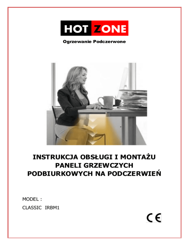 Ogrzewanie Podczerwone INSTRUKCJA OBSŁUGI I MONTAŻU PANELI GRZEWCZYCH PODBIURKOWYCH NA PODCZERWIEŃ MODEL : CLASSIC IRBM1 Szanowny kliencie, Gratulujemy trafnego wyboru i dziękujemy za zakup wydajnych, niezawodnych i estetycznie wykonanych paneli grzewczych na podczerwień. Panele marki iREDheat® są produktem europejskim, wykonanym według najwyższych standardów i norm, a tym samym produktem bezpiecznym w użytkowaniu. Zapewniamy 100% gwarancji jakości. Wybierając panele grzewcze w technologii podczerwieni, wybrali Państwo zdrowe, komfortowe i ekologiczne ogrzewanie dla siebie i swoich bliskich. Mamy nadzieję, że produkty firmy iREDheat® będą dla Państwa nie tylko źródłem ciepła, ale i satysfakcji z dokonanego zakupu na wiele lat. UWAGA: ZE WZGLĘDÓW BEZPIECZEŃSTWA, W CELU UNIKNIĘCIA USZKODZENIA URZĄDZENIA I INNYCH PRZEDMIOTÓW, ORAZ ABY W PEŁNI WYKORZYSTAĆ ZALETY NASZEGO PRODUKTU, PROSIMY PRZED ROZPOCZĘCIEM INSTALACJI ZAPOZNAĆ SIĘ UWAŻNIE Z PONIŻSZĄ INSTRUKCJĄ. NALEŻY BEZWZGLĘDNIE PRZESTRZEGAĆ ZASAD BEZPIECZEŃSTWA PODCZAS INSTALOWANIA URZĄDZENIA. Generalny dystrybutor firmy iREDheat® Ogrzewanie Podczerwone-Michał Obal OGÓLNE INFORMACJE O PRODUKCIE Podbiurkowy panel grzewczy marki iREDheat®, jest urządzeniem działającym w technologii podczerwieni i stosowany jest głównie jako ogrzewanie dodatkowe. Zamontowany pod blatem stołu, biurka w domu lub w biurze, czy stolika w restauracji, staje się nie zajmującym miejsca, prawie niewidocznym, przyjemnym źródłem ciepła. Stanowi nowatorską alternatywę dla wszelkich urządzeń grzewczych, uzupełniającą ogrzewanie główne, a w okresach przejściowych, wiosną bądź jesienią, panel podbiurkowy dostarcza nam komfortu cieplnego, bez konieczności kosztownego i czasochłonnego uruchamiania ogrzewania zasadniczego. Panel podbiurkowy marki iREDheat®, poza dostarczaniem nam kojącego ciepła, służy nam również jako osobiste urządzenie rehabilitacyjne. Od wielu lat, naświetlanie promieniami podczerwonymi stosowane jest przez rehabilitantów sportowych, czy sanatoryjnych, jako zabiegi wspomagające leczenie wszelkiego rodzaju urazów mięśni, ścięgien, przy bólach reumatycznych, artrozie, czy artretyzmie. Ogrzewanie w technologii podczerwieni stymuluje nasz układ krwionośny, szczególnie naczynek włosowatych naszego krwobiegu i dzięki temu, uczucie tzw. „zimnych stóp”, szczególnie uciązliwe dla osób o siedzącym trybie pracy, znika bez śladu. Panele podbiurkowe firmy iREDheat® zostały wykonane z najwyższej jakości materiałów i komponentów. Urządzenie osadzone jest w estetycznym profilu aluminiowym, jest wyjątkowo lekkie i charakteryzuje się znakomitą izolacją cieplną tylnej powierzchni grzejnika. Dzięki swojej niewielkiej wadze, może być zamontowane pod niemal każdym biurkiem, czy stołem. Każde urządzenie wyposażone jest przewód zasilający z przełącznikiem. Wszystkie panele modelu CLASSIC IRBM1 (panel grzewczy podbiurkowy) firmy iREDheat®, są przeznaczone wyłącznie do ogrzewania pomieszczeń wewnętrznych. Jakiekolwiek, niezgodne z przeznaczeniem użytkowym panelu grzewczego zastosowanie, może prowadzić do uszkodzeń lub powodować straty dla osób, zwierząt bądź przedmiotów. Producent i importer nie ponoszą odpowiedzialności za ewentualne szkody wynikające z niewłaściwego podłączenia, zamontowania i używania urządzenia. SPECYFIKACJA TECHNICZNA Model Wymiar Moc Waga Classic IRBM1 35 x 63 x 3,2 cm 130 W 3 kg Panele grzewcze Classic IRBM1 firmy iREDheat® działają w oparciu o napięcie elektryczne 230V / 50Hz Temperatura powierzchniowa panelu wynosi ok.80°C. Urządzenie wykonane jest zgodnie z wymaganiami norm Unii Europejskiej CE PRZED MONTAŻEM Po rozpakowaniu urządzenia, należy upewnić się, że nie jest ono uszkodzone, a w razie wątpliwości nie należy podłączać panelu i niezwłocznie skontaktować się ze sprzedawcą. Podłączenie uszkodzonego grzejnika grozi porażeniem prądem lub pożarem. Prosimy dopilnować, aby elementy opakowania typu folie torebki, śruby itp. nie znalazły się w zasięgu dzieci. Jeżeli panel zostanie podłączony do sieci o innym niż wskazane na nalepce fabrycznej napięciu, sprzedawca nie będzie ponosił odpowiedzialności za uszkodzenia z tego tytułu. Należy pamiętać, aby panele grzewcze na podczerwień marki iREDheat®, podłączać wyłącznie do uziemionej instalacji elektrycznej. Należy wybrać odpowiednie miejsce do montażu panelu, odpowiadające możliwościom bezpiecznego i zgodnego z przepisami podłączenia elektrycznego, jak i możliwie maksymalnego wykorzystania urządzenia grzewczego. SPOSÓB MONTAŻU Uchwyt mocujący śrubka zaczep Montaż urządzenia jest bardzo prosty i nie wymaga specjalnych umiejętności. Panel przytwierdzamy za pomocą załączonych uchwytów mocujących i odpowiednich śrubek (w zestawie), lub dwustronnej taśmy przylepnej, którą należy nabyć oddzielnie. Znajdująca się na uchwytach montażowych taśma samoprzylepna służy jedynie jako pomoc dla przytrzymania uchwytu przed przykręceniem go śrubką do blatu. W żadnym wypadku nie może ona służyć jako docelowe mocowanie uchwytu. Po przykręceniu uchwytów należy wsunąć w nie panel, zgodnie z załączonym rysunkiem montażowym. BLAT STOLU / BIURKA śrubka Profil przesuwny zaczep Uwaga: Po przymocowaniu uchwytów nalezy poziomo wsunac panel do zaczepów, tak jak pokazano na górnym rysunku ZASADY BEZPIECZEŃSTWA Nie zakrywać urządzenia grzewczego podczas jego pracy. Zabrania się wykonywania jakichkolwiek nawierceń w urządzeniu grzewczym. Zabrania się zdejmowania naklejki technicznej producenta umieszczonej po wewnętrznej stronie ramy urządzenia grzewczego – utrata gwarancji. Zabrania się wystawiania panelu na bezpośrednie działanie wody (śniegu, gradu, deszczu). Zabrania się wystawiania panelu na bezpośrednie działanie silnego światła słonecznego lub mrozu. W pr