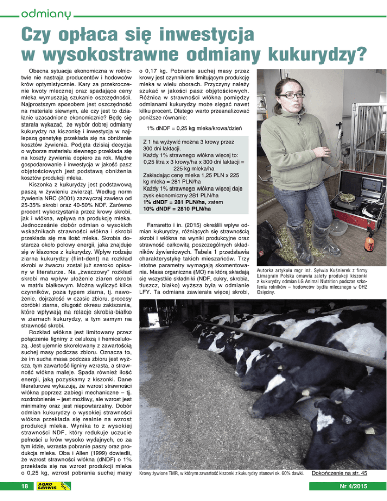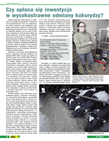 odmiany Czy opłaca się inwestycja w wysokostrawne odmiany kukurydzy? Obecna sytuacja ekonomiczna w rolnictwie nie nastraja producentów i hodowców krów optymistycznie. Kary za przekroczenie kwoty mlecznej oraz spadające ceny mleka wymuszają szukanie oszczędności. Najprostszym sposobem jest oszczędność na materiale siewnym, ale czy jest to działanie uzasadnione ekonomicznie? Będę się starała wykazać, że wybór dobrej odmiany kukurydzy na kiszonkę i inwestycja w najlepszą genetykę przekłada się na obniżenie kosztów żywienia. Podjęta dzisiaj decyzja o wyborze materiału siewnego przekłada się na koszty żywienia dopiero za rok. Mądre gospodarowanie i inwestycja w jakość pasz objętościowych jest podstawą obniżenia kosztów produkcji mleka. Kiszonka z kukurydzy jest podstawową paszą w żywieniu zwierząt. Według norm żywienia NRC (2001) zazwyczaj zawiera od 25-35% skrobi oraz 40-50% NDF. Zarówno procent wykorzystania przez krowy skrobi, jak i włókna, wpływa na produkcję mleka. Jednocześnie dobór odmian o wysokich wskaźnikach strawności włókna i skrobi przekłada się ma ilość mleka. Skrobia dostarcza około połowy energii, jaka znajduje się w kiszonce z kukurydzy. Wpływ rodzaju ziarna kukurydzy (flint-dent) na rozkład skrobi w żwaczu został już szeroko opisany w literaturze. Na „żwaczowy” rozkład skrobi ma wpływ ułożenie ziaren skrobi w matrix białkowym. Można wyliczyć kilka czynników, poza typem ziarna, tj. nawożenie, dojrzałość w czasie zbioru, procesy obróbki ziarna, długość okresu zakiszania, które wpływają na relacje skrobia-białko w ziarnach kukurydzy, a tym samym na strawność skrobi. Rozkład włókna jest limitowany przez połączenie ligniny z celulozą i hemicelulozą. Jest ujemnie skorelowany z zawartością suchej masy podczas zbioru. Oznacza to, że im sucha masa podczas zbioru jest wyższa, tym zawartość ligniny wzrasta, a strawność włókna maleje. Spada również ilość energii, jaką pozyskamy z kiszonki. Dane literaturowe wykazują, że wzrost strawności włókna poprzez zabiegi mechaniczne – tj. rozdrobnienie – jest możliwy, ale wzrost jest minimalny oraz jest niepowtarzalny. Dobór odmian kukurydzy o wysokiej strawności włókna przekłada się realnie na wzrost produkcji mleka. Wynika to z wysokiej strawności NDF, który redukuje uczucie pełności u krów wysoko wydajnych, co za tym idzie, wzrasta pobranie paszy oraz produkcja mleka. Oba i Allen (1999) dowiedli, że wzrost strawności włókna (dNDF) o 1% przekłada się na wzrost produkcji mleka o 0,25 kg, wzrost pobrania suchej masy 18 o 0,17 kg. Pobranie suchej masy przez krowy jest czynnikiem limitującym produkcję mleka w wielu oborach. Przyczyny należy szukać w jakości pasz objętościowych. Różnica w strawności włókna pomiędzy odmianami kukurydzy może sięgać nawet kilku procent. Dlatego warto przeanalizować poniższe równanie: 1% dNDF = 0,25 kg mleka/krowa/dzień Z 1 ha wyżywić można 3 krowy przez 300 dni laktacji. Każdy 1% strawnego włókna więcej to: 0,25 litra x 3 krowy/ha x 300 dni laktacji = 225 kg mleka/ha Zakładając cenę mleka 1,25 PLN x 225 kg mleka = 281 PLN/ha Każdy 1% strawnego włókna więcej daje zysk ekonomiczny 281 PLN/ha 1% dNDF = 281 PLN/ha, zatem 10% dNDF = 2810 PLN/ha Farraretto i in. (2015) określili wpływ odmian kukurydzy, różniących się strawnością skrobi i włókna na wyniki produkcyjne oraz strawność całkowitą poszczególnych składników żywieniowych. Tabela 1 przedstawia charakterystykę takich mieszańców. Trzy istotne parametry wymagają skomentowania. Masa organiczna (MO) na którą składają się wszystkie składniki (NDF, cukry, skrobia, tłuszcz, białko) wyższa była w odmianie LFY. Ta odmiana zawierała więcej skrobi, Autorka artykułu mgr inż. Sylwia Kuśnierek z firmy Limagrain Polska omawia zalety produkcji kiszonki z kukurydzy odmian LG Animal Nutrition podczas szkolenia rolników – hodowców bydła mlecznego w OHZ Osięciny. Krowy żywione TMR, w którym zawartość kiszonki z kukurydzy stanowi ok. 60% dawki. Dokończenie na str. 45 Nr 4/2015 informacje CZY OPŁACA SIĘ INWESTYCJA W WYSOKOSTRAWNE ODMIANY KUKURYDZY? Dokończenie ze str. 18 również strawność skrobi (IVstarchD) była wyższa. Natomiast odmiana BMR zawierała więcej NDF-u, a różnice w strawności NDF-u (IVDNDF) wynosiły nawet 10%. Tabela 1. Skład chemiczny oraz strawność skrobi i włókna w kiszonce z kukurydzy, in vitro. (Farraretto i in., 2015) Pobranie paszy kg/dzień s.m. MO % s.m. BO, % s.m. NDF, % s.m. IVDNDF Skrobia, % s.m. IVstarchD, % skrobi BMR 37,7 94,4 8,7 38,2 67,9 30,6 69,9 LFY 36,0 95,8 8,7 36,0 57,2 32,2 75,6 s.m. – sucha masa MO – masa organiczna BO – białko ogólne NDF – włókno neutralne detergentowo IVDNDF – rozkład żwaczowy NDF metodą in vitro, po 30 godzinach IVstarchD – rozkład żwaczowy skrobi in vitro po 7 godzinach Tabela 2 przedstawia wyniki produkcyjne krów, żywionych paszą zawierającą kiszonkę z kukurydzy. Dawka różniła się jedynie odmianą kukurydzy. TMR oparty był na kiszonkach z kukurydzy (41,8%), lucerny (20,6%) i słomie (2,4%) z dodatkiem paszy treściwej (w ilości 35,2%). Wyższa strawność włókna wpłynęła na wyższe pobranie suchej masy i na wzrost wydajności mleka o 2 litry. Tabela 2. Wpływ doboru odmiany na pobranie paszy i produkcję mleka (Farraretto i in., 2015) Pobranie paszy kg/dzień wydajność BMR 28,1 49,0 LFY 26,4 46,8 W omawianym doświadczeniu wyższymi strawnościami skrobi charakteryzowała się odmiana LFY. Natomiast wyższa strawność NDF-u przełożyła się na wyniki produkcyjne, powodowała szybsze wykorzystanie paszy, zmniejszała uczucie wypełnienia krów i wpłynęła pozytywnie na wzrost pobrania. Każdy dodatkowy procent strawnego włókna to przy obecnych cenach mleka zysk 281 PLN. Powyższe badania wskazywały na różnicę w strawności włókna, dochodz