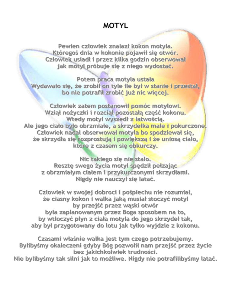 MOTYL PPeew wiieenn cczzłłoow wiieekk zznnaallaazzłł kkookkoonn m moottyyllaa.. KKttóórreeggoośś ddnniiaa w w kkookkoonniiee ppoojjaaw wiiłł ssiięę oottw wóórr.. CCzzłłoow wiieekk uussiiaaddłł ii pprrzzeezz kkiillkkaa ggooddzziinn oobbsseerrw woow waałł jjaakk m moottyyll pprróóbbuujjee ssiięę zz nniieeggoo w wyyddoossttaaćć.. PPootteem m pprraaccaa m moottyyllaa uussttaałłaa W Wyyddaaw waałłoo ssiięę,, żżee zzrroobbiiłł oonn ttyyllee iillee bbyyłł w w ssttaanniiee ii pprrzzeessttaałł,, bboo nniiee ppoottrraaffiiłł zzrroobbiićć jjuużż nniicc w wiięęcceejj.. CCzzłłoow wiieekk zzaatteem m ppoossttaannoow wiiłł ppoom móócc m moottyylloow wii.. W Wzziiąąłł nnoożżyycczzkkii ii rroozzcciiąąłł ppoozzoossttaałłąą cczzęęśśćć kkookkoonnuu.. W woośścciiąą.. wyysszzeeddłł zz łłaattw moottyyll w Wtteeddyy m A maałłee ii ppookkuurrcczzoonnee.. miiaałłee,, aa sskkrrzzyyddeełłkkaa m Allee jjeeggoo cciiaałłoo bbyyłłoo oobbrrzzm CCzzłłoow waałł ssiięę,, moottyyllaa bboo ssppooddzziieew waałł m woow wiieekk nnaaddaall oobbsseerrw żżee sskkrrzzyyddłłaa ssiięę rroozzpprroossttuujjąą ii ppoow wiięękksszząą ii żżee uunniioossąą cciiaałłoo,, kkttóórree zz cczzaasseem m ssiięę oobbkkuurrcczzyy.. N Niicc ttaakkiieeggoo ssiięę nniiee ssttaałłoo.. RReesszzttęę ssw moottyyll ssppęęddzziiłł ppeełłzzaajjąącc weeggoo żżyycciiaa m zz oobbrrzzm mii.. mii sskkrrzzyyddłłaam m ii pprrzzyykkuurrcczzoonnyym m cciiaałłeem miiaałłyym N Niiggddyy nniiee nnaauucczzyyłł ssiięę llaattaaćć.. CCzzłłoow miiaałł,, woojjeejj ddoobbrrooccii ii ppoośśppiieecchhuu nniiee rroozzuum w ssw wiieekk w żżee cciiaassnnyy kkookkoonn ii w moottyyll muussiiaałł ssttoocczzyyćć m waallkkaa jjaakkąą m bbyy pprrzzeejjśśćć pprrzzeezz w wóórr wąąsskkii oottw bbyyłłaa zzaappllaannoow waannyym m pprrzzeezz BBooggaa ssppoossoobbeem m nnaa ttoo,, bbyy w wttłłoocczzyyćć ppłłyynn zz cciiaałłaa m moottyyllaa ddoo jjeeggoo sskkrrzzyyddeełł ttaakk,, aabbyy bbyyłł pprrzzyyggoottoow waannyy ddoo lloottuu jjaakk ttyyllkkoo w wyyjjddzziiee zz kkookkoonnuu.. CCzzaassaam mii w włłaaśśnniiee w waallkkaa jjeesstt ttyym m cczzeeggoo ppoottrrzzeebbuujjeem myy.. BByylliibbyyśśm myy ookkaalleecczzeennii ggddyybbyy BBóógg ppoozzw woolliiłł nnaam m pprrzzeejjśśćć pprrzzeezz żżyycciiee bbeezz jjaakkiicchhkkoollw wiieekk ttrruuddnnoośśccii.. N myy llaattaaćć.. wee.. N Niiggddyy nniiee ppoottrraaffiilliibbyyśśm moożżlliiw myy ttaakk ssiillnnii jjaakk ttoo m Niiee bbyylliibbyyśśm