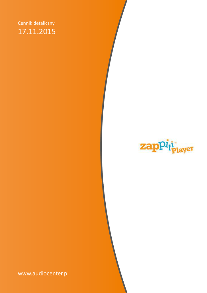 Cennik detaliczny 17.11.2015 www.audiocenter.pl ZAPPITI 4K MINI - Odtwarzacz mulimedialny 999 zł cena detaliczna Odtwarzacz 4K HD 3D z moソliwo彡iケ podpi鹹ia dysku zewn黎rznego USB lub SATA o pojemno彡i do 8 TB z pr鹽ko彡iケ przesyウu danych do 6 Gbit/s za pomocケ zウケcza SATA , komplet zウケcz USB, czytnik kart pami鹹i i wbudowanケ kart・sieci LAN i WiFi oraz dodatkowe wej彡ie HDMI. Zbudowany w oparciu o najnowszy procesor Realtek zapewniajケcy sprz黎owe dekodowanie formatu HVEC (h265) stosowanego materiaウach wideo 4K oraz skalowanie obrazu SD i HD do rozdzielczo彡i UHD i 4K. Urzケdzenie odtwarza wszystkie najwaソniejsze formaty wideo HD i SD w 2D i 3D. Obsウuguje popularne, oraz audiofilskie bezstratne formaty audio w rozdzielczo彡i do 192kHz/24bit i wielokanaウowe formaty d毆i麑u AudioHD. Sprawnie pracuje w sieci LAN (100/1000Mbit), zapewnia dostęp do internetowych zasobów audio i wideo. Dedykowane oprogramowanie Zappiti Media Center oraz Zappiti Explorer odpowiadają za wygodne katalogowanie filmów i muzyki, uzupełnianie opisów i pobieranie okładek z internetu. Dzięki dostępowi do marketu Google Play i opcji instalowania aplikacji dla systemu Android funkcjonalność urządzenia może być rozszerzana niemal bez ograniczeń. 1229 zł ZAPPITI 4K - Odtwarzacz mulimedialny cena detaliczna Odtwarzacz 4K HD 3D wyposażony w kieszeń na dysk twardy SATA 3.5" o pojemności do 8TB, komplet złącz USB, czytnik kart pamięci i wbudowaną kartę sieci LAN i WiFi oraz dodatkowe wejście HDMI. Zbudowany w oparciu o najnowszy procesor Realtek zapewniający sprzętowe dekodowanie formatu HVEC (h265) stosowanego materiałach wideo 4K oraz skalowanie obrazu SD i HD do rozdzielczości UHD i 4K. Urządzenie odtwarza wszystkie najważniejsze formaty wideo HD i SD w 2D i 3D. Obsługuje popularne, oraz audiofilskie bezstratne formaty audio w rozdzielczości do 192kHz/24bit i wielokanałowe formaty dźwięku AudioHD. Sprawnie pracuje w sieci LAN (100/1000Mbit), zapewnia dostęp do internetowych zasobów audio i wideo. Dedykowane oprogramowanie Zappiti Media Center oraz Zappiti Explorer odpowiadają za wygodne katalogowanie filmów i muzyki, uzupełnianie opisów i pobieranie okładek z internetu. Dzięki dostępowi do marketu Google Play i opcji instalowania aplikacji dla systemu Android funkcjonalność urządzenia może być rozszerzana niemal bez ograniczeń. ZAPPITI 4K DUO - Odtwarzacz mulimedialny 1539 zł cena detaliczna Odtwarzacz 4K HD 3D wyposażony w podwójną kieszeń na dyski twarde 3.5" o całkowitej pojemność do 16TB , komplet złącz USB, czytnik kart pamięci i wbudowaną kartę sieci LAN i WiFi oraz dodatkowe wejście HDMI. Zbudowany w oparciu o najnowszy procesor Realtek zapewniający sprzętowe dekodowanie formatu HVEC (h265) stosowanego materiałach wideo 4K oraz skalowanie obrazu SD i HD do rozdzielczości UHD i 4K. Urządzenie odtwarza wszystkie najważniejsze formaty wideo HD i SD w 2D i 3D. Obsługuje popularne, oraz audiofilskie bezstratne formaty audio w rozdzielczości do 192kHz/24bit i wielokanałowe formaty dźwięku AudioHD. Sprawnie pracuje w sieci LAN (100/1000Mbit), zapewnia dostęp do internetowych zasobów audio i wideo. Dedykowane oprogramowanie Zappiti Media Center oraz Zappiti Explorer odpowiadają za wygodne katalogowanie filmów i muzyki, uzupełnianie opisów i pobieranie okładek z internetu. Dzięki dostępowi do marketu Google Play i opcji instalowania aplikacji dla systemu Android funkcjonalność urządzenia może być rozszerzana niemal bez ograniczeń. AUDIO CENTER POLAND ul. Sucharskiego 49, 30-898 Kraków | www.audiocenter.pl Dystrybucja ul. Sucharskiego 49 30-898 Kraków tel.: 12 265 02 85 e-mail: [email protected] www.audiocenter.pl Ceny podane są w PLN i zawierają podatek VAT