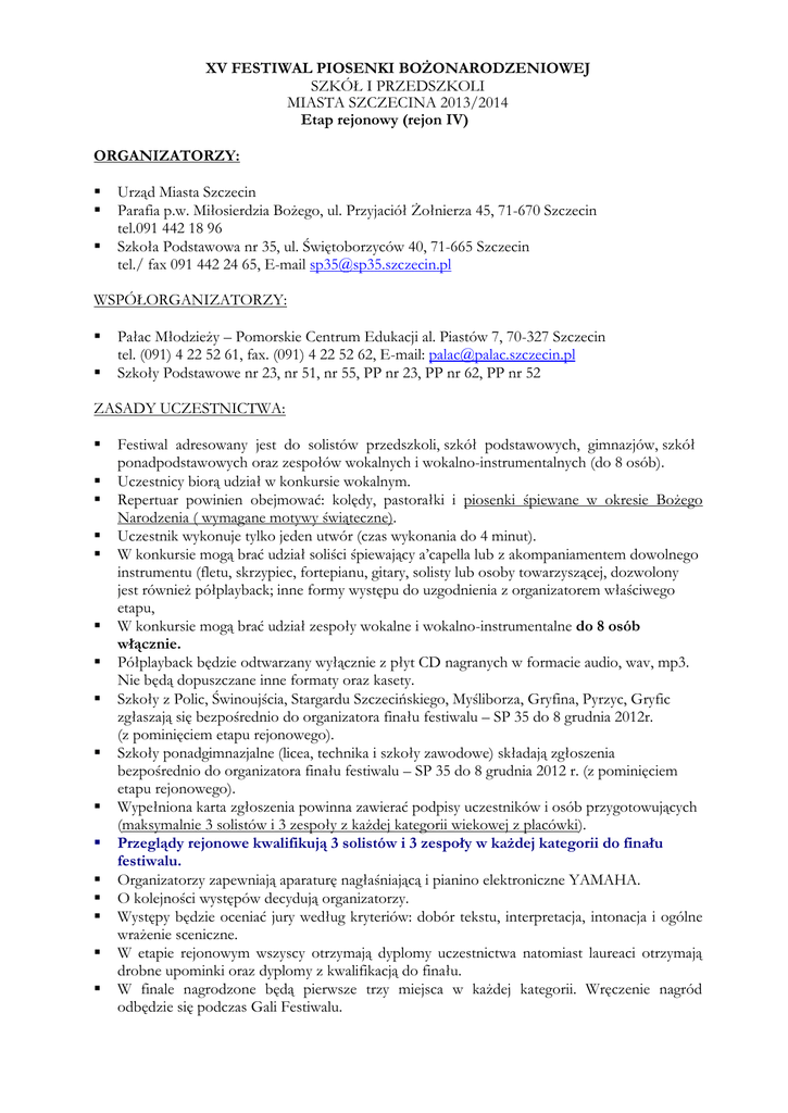 XV FESTIWAL PIOSENKI BOŻONARODZENIOWEJ SZKÓŁ I PRZEDSZKOLI MIASTA SZCZECINA 2013/2014 Etap rejonowy (rejon IV) ORGANIZATORZY: Urząd Miasta Szczecin Parafia p.w. Miłosierdzia Bożego, ul. Przyjaciół Żołnierza 45, 71-670 Szczecin tel.091 442 18 96 Szkoła Podstawowa nr 35, ul. Świętoborzyców 40, 71-665 Szczecin tel./ fax 091 442 24 65, E-mail [email protected] WSPÓŁORGANIZATORZY: Pałac Młodzieży – Pomorskie Centrum Edukacji al. Piastów 7, 70-327 Szczecin tel. (091) 4 22 52 61, fax. (091) 4 22 52 62, E-mail: [email protected] Szkoły Podstawowe nr 23, nr 51, nr 55, PP nr 23, PP nr 62, PP nr 52 ZASADY UCZESTNICTWA: Festiwal adresowany jest do solistów przedszkoli, szkół podstawowych, gimnazjów, szkół ponadpodstawowych oraz zespołów wokalnych i wokalno-instrumentalnych (do 8 osób). Uczestnicy biorą udział w konkursie wokalnym. Repertuar powinien obejmować: kolędy, pastorałki i piosenki śpiewane w okresie Bożego Narodzenia ( wymagane motywy świąteczne). Uczestnik wykonuje tylko jeden utwór (czas wykonania do 4 minut). W konkursie mogą brać udział soliści śpiewający a’capella lub z akompaniamentem dowolnego instrumentu (fletu, skrzypiec, fortepianu, gitary, solisty lub osoby towarzyszącej, dozwolony jest również półplayback; inne formy występu do uzgodnienia z organizatorem właściwego etapu, W konkursie mogą brać udział zespoły wokalne i wokalno-instrumentalne do 8 osób włącznie. Półplayback będzie odtwarzany wyłącznie z płyt CD nagranych w formacie audio, wav, mp3. Nie będą dopuszczane inne formaty oraz kasety. Szkoły z Polic, Świnoujścia, Stargardu Szczecińskiego, Myśliborza, Gryfina, Pyrzyc, Gryfic zgłaszają się bezpośrednio do organizatora finału festiwalu – SP 35 do 8 grudnia 2012r. (z pominięciem etapu rejonowego). Szkoły ponadgimnazjalne (licea, technika i szkoły zawodowe) składają zgłoszenia bezpośrednio do organizatora finału festiwalu – SP 35 do 8 grudnia 2012 r. (z pominięciem etapu rejonowego). Wypełniona karta zgłoszenia powinna zawierać podpisy uczestników i osób przygotowujących (maksymalnie 3 solistów i 3 zespoły z każdej kategorii wiekowej z placówki). Przeglądy rejonowe kwalifikują 3 solistów i 3 zespoły w każdej kategorii do finału festiwalu. Organizatorzy zapewniają aparaturę nagłaśniającą i pianino elektroniczne YAMAHA. O kolejności występów decydują organizatorzy. Występy będzie oceniać jury według kryteriów: dobór tekstu, interpretacja, intonacja i ogólne wrażenie sceniczne. W etapie rejonowym wszyscy otrzymają dyplomy uczestnictwa natomiast laureaci otrzymają drobne upominki oraz dyplomy z kwalifikacją do finału. W finale nagrodzone będą pierwsze trzy miejsca w każdej kategorii. Wręczenie nagród odbędzie się podczas Gali Festiwalu. KATEGORIE WIEKOWE: przedszkola i „zerówki” szkoły podstawowe – klasy I – III szkoły podstawowe – klasy IV – VI gimnazja TERMINY: Organizatorzy etapu szkolnego są zobowiązani dostarczyć do 28 listopada 2013r. wypełnioną kartę zgłoszenia (z podpisami uczestników i osoby przygotowującej) do: Pałacu Młodzieży – PCE al. Piastów 7, 70-327 Szczecin, tel.091 422 52 61, wew. 31 , fax. 422 52 62 E-mail: [email protected] Z dopiskiem: “XV Festiwal Piosenki Bożonarodzeniowej” Przesłuchania uczestników dla rejonu IV odbędą się 04 grudnia 2013 r. w Pałacu Młodzieży – PCE w Szczecinie. Szczegółowy harmonogram zostanie zamieszczony na stronie internetowej www.palac.szczecin.pl. Szkoły ponadgimnazjalne składają zgłoszenia bezpośrednio do organizatora finału festiwalu - Szkoła Podstawowa nr 35 do 06 grudnia 2013 r. z pominięciem etapu rejonowego. Finał Festiwalu 11-13 grudnia 2013 r. Aula Szkoły Podstawowej nr 35, ul. Świętoborzyców 40 (os. Książąt Pomorskich). O Gali Festiwalu zostaną Państwo powiadomieni przez głównego organizatora. Finału. UWAGI KOŃCOWE: Zgłoszenia przyjmuje i informacji udziela: Dział Organizacyjny Pałacu Młodzieży - pok. 3. al. Piastów 7, 70-327 Szczecin, tel. 091 422 52 61 wew. 31 lub 25 E-mail: [email protected] Organizator udostępnia uczestnikom konkursu wspólną salę prób i garderobę. Prosimy o zwrócenie uwagi na swoje rzeczy osobiste, (w szczególności przedmioty wartościowe). Za rzeczy pozostawione bez nadzoru Pałac Młodzieży nie odpowiada. Zgodnie z art. 23 ust. 1 pkt. 1 ustawy z 29.08.1997 r. o ochronie danych osobowych (Dz. U. Nr 133, poz. 883 z późn. zm.) dane osobowe wykorzystywane będą jedynie do celów statutowych Pałacu Młodzieży – PCE w Szczecinie. Zgłoszenie dziecka na konkurs, jest jednoznaczne z wyrażeniem zgody na publikację zdjęć na stronie internetowej oraz w publikacjach i folderach Pałacu Młodzieży. Niniejsza zgoda dotyczy wyłącznie publikacji w celach niekomercyjnych.
