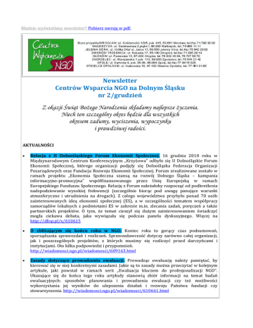 Błędnie wyświetlany newsletter? Pobierz wersję w pdf. Newsletter Centrów Wsparcia NGO na Dolnym Śląsku nr 2/grudzień Z okazji Świąt Bożego Narodzenia składamy najlepsze życzenia. Niech ten szczególny okres będzie dla wszystkich okresem zadumy, wyciszenia, wypoczynku i prawdziwej radości. AKTUALNOŚCI Relacja z II Dolnośląskiego Forum Ekonomii Społecznej. 16 grudnia 2010 roku w Międzynarodowym Centrum Konferencyjnym „Krzyżowa” odbyło się II Dolnośląskie Forum Ekonomii Społecznej, którego organizacji podjęły się Dolnośląska Federacja Organizacji Pozarządowych oraz Fundacja Rozwoju Ekonomii Społecznej. Forum zrealizowane zostało w ramach projektu „Ekonomia Społeczna szansą na rozwój Dolnego Śląska – kampania informacyjno-promocyjna” współfinansowanego przez Unię Europejską w ramach Europejskiego Funduszu Społecznego. Relację z Forum należałoby rozpocząć od podkreślenia nadspodziewanie wysokiej frekwencji (szczególnie biorąc pod uwagę panujące warunki atmosferyczne i utrudnienia na drogach). Z całego województwa przybyło ponad 70 osób zainteresowanych ideą ekonomii społecznej (ES), a w szczególności tematem współpracy samorządów lokalnych z podmiotami ES w zakresie m.in. zlecania zadań, poręczeń a także partnerskich projektów. O tym, że temat cieszył się dużym zainteresowaniem świadczyć mogła ciekawa debata, jaka wywiązała się podczas panelu dyskusyjnego. Więcej na http://dfop.pl/x/610615 O zbliżającym się końcu roku w NGO. Koniec roku to gorący czas podsumowań, sporządzania sprawozdań i rozliczeń. Sprawozdawczość dotyczy zarówno całej organizacji, jak i poszczególnych projektów, z których musimy się rozliczyć przed darczyńcami i instytucjami. Oto kilka podpowiedzi i przypomnień. http://wiadomosci.ngo.pl/wiadomosci/609163.html Zasady dotyczące prowadzenia ewaluacji. Prowadząc ewaluację należy pamiętać, by kierować się w niej konkretnymi zasadami. Jakie są to zasady można przeczytać w kolejnym artykule, jaki powstał w ramach serii „Ewaluacja kluczem do profesjonalizacji NGO”. Ukazujące się do końca tego roku artykuły stanowią zbiór informacji na temat badań ewaluacyjnych: sposobów planowania i prowadzenia ewaluacji czy też możliwości wykorzystania jej wyników do ulepszenia działań i rozwoju Państwa fundacji czy stowarzyszenia. http://wiadomosci.ngo.pl/wiadomosci/610661.html Kogo nie ma na liście OPP? Na liście organizacji pożytku publicznego uprawnionych do otrzymywania 1% podatku dochodowego za 2010 r. zabrakło około 2,5 tys. OPP. Część z nich nie znalazła się na liście dlatego, że nie przesłały do Departamentu Pożytku Publicznego w terminie swojego sprawozdania finansowego i merytorycznego. http://wiadomosci.ngo.pl/wiadomosci/610436.html Wolność pieczenia ciasta. Ledwo przeszliśmy przez nowelizację Ustawy o działalności pożytku publicznego i o wolontariacie, a już szykują się zmiany w kolejnym, jeśli nie ważniejszym od UDPPiW, akcie prawnym - Prawie o stowarzyszeniach. W zamyśle parlamentarzystów, Prawo o stowarzyszeniach miałoby zostać zastąpione ustawą o zrzeszeniach, radykalnie zmieniającą dotychczasowy stan prawny. Cały artykuł na http://wiadomosci.ngo.pl/wiadomosci/609955.html Obcokrajowiec to twój sąsiad. W Polsce imigranci stanowią niecałe 3% ogółu ludności, ale ten odsetek szybko się zwiększa. Również Polacy wyjeżdżają. Szacuje się, że około 600 tys. polskich obywateli żyje w Wielkiej Brytanii i Niemczech, 100 tys. w Holandii. To pokazuje, że problem migracji wcale nie omija naszego kraju. Z danych ONZ wynika, że co 35. obywatel Ziemi żyje poza miejscem swojego pochodzenia, a więc jest migrantem. W 1990 r. dla upamiętnienia wejścia w życie „Międzynarodowej Konwencji o Ochronie Praw Wszystkich Pracowników - Migrantów i Członków Ich Rodzin” Organizacja Narodów Zjednoczonych ustanowiła dzień 18. grudnia Międzynarodowym Dniem Migrantów. Więcej na http://wiadomosci.ngo.pl/wiadomosci/610130.html Urzędy stosują ustawę o przeciwdziałaniu praniu pieniędzy. "Nasza fundacja ma kłopoty z powodu niedostosowania swoich działań do ustawy o przeciwdziałaniu praniu brudnych pieniędzy oraz finansowaniu terroryzmu. Możliwe, że nasza fundacja zostanie ukarana (karą więzienia lub grzywny!) za niedopełnienie wynikających z niej obowiązków. To zadziwiające, czemu mają służyć te przepisy". http://wiadomosci.ngo.pl/wiadomosci/607370.html Program Centrum Pro Bono dla dolnośląskich organizacji pozarządowych. Centrum Pro Bono to program, którego głównym celem jest pośrednictwo w zakresie bezpłatnej pomocy prawnej pomiędzy kancelariami prawnymi a organizacjami pozarządowymi. Organizacja, za pomocą internetowego formularza opisuje problem prawny, i za pośrednictwem Centrum Pro Bono – może otrzymać bezpłatną pomoc od prawników z najlepszych kancelarii w Polsce. Od maja tego roku – Regionalne Centrum Wspierania Inicjatyw Pozarządowych we Wrocławiu realizuje program Centrum Pro Bono na obszarze Dolnego Śląska. Szczegółowa oferta Centrum Pro Bono w załączeniu. SZKOLENIA/WARSZTATY Zarządzanie i rozwój w organizacji pozarządowej - bezpłatny cykl edukacyjny dla dolnośląskich NGO. Regionalne Centrum Wspierania Inicjatyw Pozarządowych, Dolnośląska Federacja Organizacji Pozarządowych i Opolskie Centrum Wspierania Organizacji Pozarządowych zapraszają wszystkie dolnośląskie organizacje do udziału w bezpłatnym cyklu edukacyjnym, realizowanym w ramach projektu „Centra Wsparcia NGO – projekt długofalowej pomocy dla organizacji pozarządowych” współfinansowanego ze środków Europejskiego Funduszu Społecznego. W ramach cyklu odbędą się szkolenia, coaching, doradztwo oraz przyznawana będzie tzw. pula rozwojowa. Uczestnicy wezmą udział w 5 zjazdach edukacyjnych (trzech, trzydniowych szkoleniach wyjazdowych i dwóch, dwudniowych sz