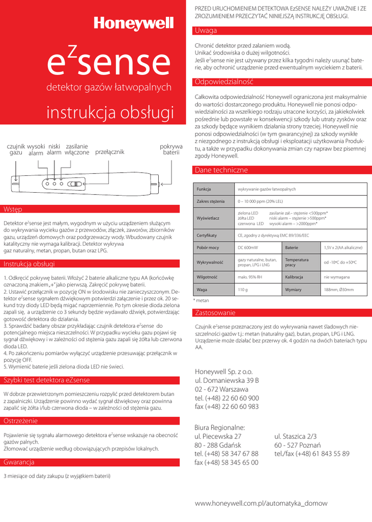 PRZED URUCHOMIENIEM DETEKTOWA EzSENSE NALEŻY UWAŻNIE I ZE ZROZUMIENIEM PRZECZYTAĆ NINIEJSZĄ INSTRUKCJĘ OBSŁUGI. Uwaga e sense Z detektor gazów łatwopalnych instrukcja obsługi czujnik wysoki niski zasilanie gazu alarm alarm włączone przełącznik pokrywa baterii Chronić detektor przed zalaniem wodą. Unikać środowiska o dużej wilgotności. Jeśli eZsense nie jest używany przez kilka tygodni należy usunąć baterie, aby ochronić urządzenie przed ewentualnym wyciekiem z baterii. Odpowiedzialność Całkowita odpowiedzialność Honeywell ograniczona jest maksymalnie do wartości dostarczonego produktu. Honeywell nie ponosi odpowiedzialności za wszelkiego rodzaju utracone korzyści, za jakiekolwiek pośrednie lub powstałe w konsekwencji szkody lub utraty zysków oraz za szkody będące wynikiem działania strony trzeciej. Honeywell nie ponosi odpowiedzialności (w tym gwarancyjnej) za szkody wynikłe z niezgodnego z instrukcją obsługi i eksploatacji użytkowania Produktu, a także w przypadku dokonywania zmian czy napraw bez pisemnej zgody Honeywell. Dane techniczne Funkcja wykrywanie gazów łatwopalnych Zakres stężenia 0 – 10 000 ppm (20% LEL) Wyświetlacz zielona LED żółta LED czerwona LED Certyfikaty CE, zgodny z dyrektywą EMC 89/336/EEC Pobór mocy DC 600mW Baterie 1,5V x 2(AA alkaliczne) Instrukcja obsługi Wykrywalność gazy naturalne, butan, propan, LPG i LNG Temperatura pracy od -10ºC do +50ºC 1. Odkręcić pokrywę baterii. Włożyć 2 baterie alkaliczne typu AA (końcówkę oznaczoną znakiem „+” jako pierwszą. Zakręcić pokrywę baterii. 2. Ustawić przełącznik w pozycję ON w środowisku nie zanieczyszczonym. Detektor eZsense sygnałem dźwiękowym potwierdzi załączenie i przez ok. 20 sekund trzy diody LED będą migać naprzemiennie. Po tym okresie dioda zielona zapali się, a urządzenie co 3 sekundy będzie wydawało dźwięk, potwierdzając gotowość detektora do działania. 3. Sprawdzić badany obszar przykładając czujnik detektora eZsense do potencjalnego miejsca nieszczelności. W przypadku wycieku gazu pojawi się sygnał dźwiękowy i w zależności od stężenia gazu zapali się żółta lub czerwona dioda LED. 4. Po zakończeniu pomiarów wyłączyć urządzenie przesuwając przełącznik w pozycję OFF. 5. Wymienić baterie jeśli zielona dioda LED nie świeci. Wilgotność maks. 95% RH Kalibracja nie wymagana Waga 110 g Wymiary 188mm, Ǿ30mm Wstęp Detektor eZsense jest małym, wygodnym w użyciu urządzeniem służącym do wykrywania wycieku gazów z przewodów, złączek, zaworów, zbiorników gazu, urządzeń domowych oraz podgrzewaczy wody. Wbudowany czujnik katalityczny nie wymaga kalibracji. Detektor wykrywa gaz naturalny, metan, propan, butan oraz LPG. Szybki test detektora eZsense W dobrze przewietrzonym pomieszczeniu rozpylić przed detektorem butan z zapalniczki. Urządzenie powinno wydać sygnał dźwiękowy oraz powinna zapalić się żółta i/lub czerwona dioda – w zależności od stężenia gazu. Ostrzeżenie Pojawienie się sygnału alarmowego detektora eZsense wskazuje na obecność gazów palnych. Złomować urządzenie według obowiązujących przepisów lokalnych. Gwarancja zasilanie zał.– stężenie <500ppm* niski alarm – stężenie >500ppm* wysoki alarm – >2000ppm* * metan Zastosowanie Czujnik eZsense przeznaczony jest do wykrywania nawet śladowych nieszczelności gazów t.j.: metan (naturalny gaz), butan, propan, LPG i LNG. Urządzenie może działać bez przerwy ok. 4 godzin na dwóch bateriach typu AA. Honeywell Sp. z o.o. ul. Domaniewska 39 B 02 - 672 Warszawa tel. (+48) 22 60 60 900 fax (+48) 22 60 60 983 Biura Regionalne: ul. Piecewska 27 80 - 288 Gdańsk tel. (+48) 58 347 67 88 fax (+48) 58 345 65 00 ul. Staszica 2/3 60 - 527 Poznań tel./fax (+48) 61 843 55 89 3 miesiące od daty zakupu (z wyjątkiem baterii) www.honeywell.com.pl/automatyka_domow