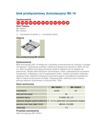 blok przełączeniowy (komutacyjny) BK-19 Zastosowania Kod Towaru BK-19/24/1 BK-19/24/2 (1 - mocowanie przednie, 2 - mocowanie tylne) Zdjęcia blok przełączeniowy BK-19/24/2 Zastosowanie Blok komutacyjny BK-19 składa się z obudowy przeznaczonej do montażu w stojaku 19-calowym i wysuwanej szuflady z listwą komutacyjną na łączniki E-2000, SC lub LC. Blok umożliwia komutację pomiędzy dwiema wiązkami po 24 pigtaile lub patchcordy. Wiązki kabli stacyjnych wychodzące z bloku zabezpieczone są wężem suwakowym znajdującym się na wyposażeniu bloku. System prowadnic wewnątrz obudowy bloku zapewnia bezpieczne promienie gięcia i prawidłowe prowadzenie kabli w trakcie przesuwania szuflady. Obudowa bloku wykonana jest z blachy pokrytej lakierem proszkowym w kolorze RAL 7035. Dane techniczne mocowanie ilość pól komutacji standard złączy BK-19/24/1 BK-19/24/2 przód tył 24 E-2000, SC, LC zalecana długość patchcordów [m] 3 - 4 m w zależności od wysokości stojaka wymiary szer./wys./głęb. [mm] masa [kg] Przykład zamówienia blok komutacyjny BK-19/24/1 483/44 (1U)/280 1,5