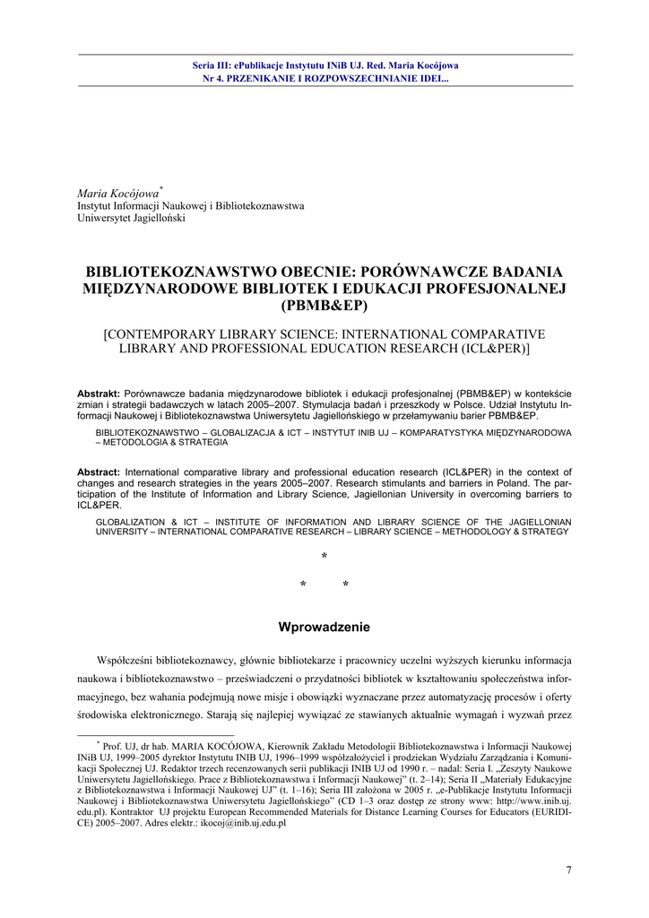 Seria III: ePublikacje Instytutu INiB UJ. Red. Maria Kocójowa Nr 4. PRZENIKANIE I ROZPOWSZECHNIANIE IDEI... Maria Kocójowa* Instytut Informacji Naukowej i Bibliotekoznawstwa Uniwersytet Jagielloński BIBLIOTEKOZNAWSTWO OBECNIE: PORÓWNAWCZE BADANIA MIĘDZYNARODOWE BIBLIOTEK I EDUKACJI PROFESJONALNEJ (PBMB&EP) [CONTEMPORARY LIBRARY SCIENCE: INTERNATIONAL COMPARATIVE LIBRARY AND PROFESSIONAL EDUCATION RESEARCH (ICL&PER)] Abstrakt: Porównawcze badania międzynarodowe bibliotek i edukacji profesjonalnej (PBMB&EP) w kontekście zmian i strategii badawczych w latach 2005–2007. Stymulacja badań i przeszkody w Polsce. Udział Instytutu Informacji Naukowej i Bibliotekoznawstwa Uniwersytetu Jagiellońskiego w przełamywaniu barier PBMB&EP. BIBLIOTEKOZNAWSTWO – GLOBALIZACJA & ICT – INSTYTUT INIB UJ – KOMPARATYSTYKA MIĘDZYNARODOWA – METODOLOGIA & STRATEGIA Abstract: International comparative library and professional education research (ICL&PER) in the context of changes and research strategies in the years 2005–2007. Research stimulants and barriers in Poland. The participation of the Institute of Information and Library Science, Jagiellonian University in overcoming barriers to ICL&PER. GLOBALIZATION & ICT – INSTITUTE OF INFORMATION AND LIBRARY SCIENCE OF THE JAGIELLONIAN UNIVERSITY – INTERNATIONAL COMPARATIVE RESEARCH – LIBRARY SCIENCE – METHODOLOGY & STRATEGY * * * Wprowadzenie Współcześni bibliotekoznawcy, głównie bibliotekarze i pracownicy uczelni wyższych kierunku informacja naukowa i bibliotekoznawstwo – przeświadczeni o przydatności bibliotek w kształtowaniu społeczeństwa informacyjnego, bez wahania podejmują nowe misje i obowiązki wyznaczane przez automatyzację procesów i oferty środowiska elektronicznego. Starają się najlepiej wywiązać ze stawianych aktualnie wymagań i wyzwań przez * Prof. UJ, dr hab. MARIA KOCÓJOWA, Kierownik Zakładu Metodologii Bibliotekoznawstwa i Informacji Naukowej INiB UJ, 1999–2005 dyrektor Instytutu INIB UJ, 1996–1999 współzałożyciel i prodziekan Wydziału Zarządzania i Komunikacji Społecznej UJ. Redaktor trzech recenzowanych serii publikacji INIB UJ od 1990 r. – nadal: Seria I. „Zeszyty Naukowe Uniwersytetu Jagiellońskiego. Prace z Bibliotekoznawstwa i Informacji Naukowej” (t. 2–14); Seria II „Materiały Edukacyjne z Bibliotekoznawstwa i Informacji Naukowej UJ” (t. 1–16); Seria III założona w 2005 r. „e-Publikacje Instytutu Informacji Naukowej i Bibliotekoznawstwa Uniwersytetu Jagiellońskiego” (CD 1–3 oraz dostęp ze strony www: http://www.inib.uj. edu.pl). Kontraktor UJ projektu European Recommended Materials for Distance Learning Courses for Educators (EURIDICE) 2005–2007. Adres elektr.: [email protected] 7 Seria III: ePublikacje Instytutu INiB UJ. Red. Maria Kocójowa Nr 4. PRZENIKANIE I ROZPOWSZECHNIANIE IDEI... społeczeństwo informacyjne, wśród których międzynarodowe porównawcze badań bibliotek i profesjonalnej edukacji [dalej PBMB&EP] przynoszą ważne rezultaty i wskazują na konieczność ich poszerzenia. Potwierdzają to wyniki badań i postępy praktyki omawiane dorocznie na Światowych Kongresach IFLA. Najnowsze –73. spotkanie tego typu planowane na rok sierpień 2007 ma się nawet odbyć pod hasłem: „Libraries for the future: progress, development and partnership”. Celem jest próba odpowiedzi na najważniejsze pytania globalne: „What difference does the LIS sector really make to these different worlds? Are the services to these different worlds watertight and isolated from one another or should there be more creative cross-fertilization of service delivery to the different worlds? What relationship should there be between these different worlds? What creative and leadership role can IFLA play within world community and what impact should the LIS sector play in this regard?” [IFLANET: 73rd IFLA General Conference, dok. elektr.]. Wyjaśnienie postawionych znaków zapytania ściśle się wiąże z prowadzeniem porównawczych międzynarodowych badań, dążących do poznania znaczenia i udziału bibliotek i profesjonalnej edukacji oraz kooperujących z nimi organizacji – w życiu społecznym w jak najszerszym przekroju międzynarodowym. Szeroka perspektywa, oparta o płaszczyznę międzynarodową jest niezbędną podstawą prawdopodobieństwa wyników o postępie w usprawnianiu praktyki oraz o nowoczesności i efektywności edukacji. Odpowiedzialność tych badań jest tym większa, że w oparciu o nie – należy też wnioskować o nadchodzących przemianach nie tylko every day life, ale i mentalnych, tak ważnych dla przyszłości globalnego społeczeństwa. Uzyskiwane sukcesywnie wyniki PBMB& EP są zatem jednym ze środków najlepiej sprzyjających pokonaniu braku wiary w niezbędność bibliotek w społeczeństwie oraz przyczyniającym się do podnoszenia ich statusu profesjonalnego i uznania społecznego. Mają duży wpływ na kształtowanie pozytywnego wizerunku bibliotek w 21 wieku, oraz na przekształcanie modelu samych badań, ich tematyki i metodologii, sprzyjają tworzeniu godnych naśladowania wzorców. To pozytywne oddziaływanie wyraźnie odczuwa się na przykładach polskich. Badania te wkraczają w sferę zarówno praktyki, jak i teorii bibliotekoznawstwa, w myśl znanego ogólnie wytłumaczenia różnic między dyscypliną a praktyką na przykładzie następującego porównania: „bibliotekoznawstwo” należy traktować jak „medycynę” (czyli teoria i praktyka), a „bibliotekarstwo” – to odpowiednik „praktyki lekarskiej”, zależnej od kompetencji i umiejętności konkretnego lekarza. Zależność w obu przykładach jest prosta: im wyższy poziom wiedzy teoretycznej, tym lepsze aplikacje (WIKI, dok. elektr.]. Im szerszy zasięg przestrzenny międzynarodowy badań, okres chronologiczny pozwalający na poznanie dynamiki przemian, tym łatwiej w badaniach wyjść naprzeciw potrzebom skomputeryzowanego społeczeństwa nas