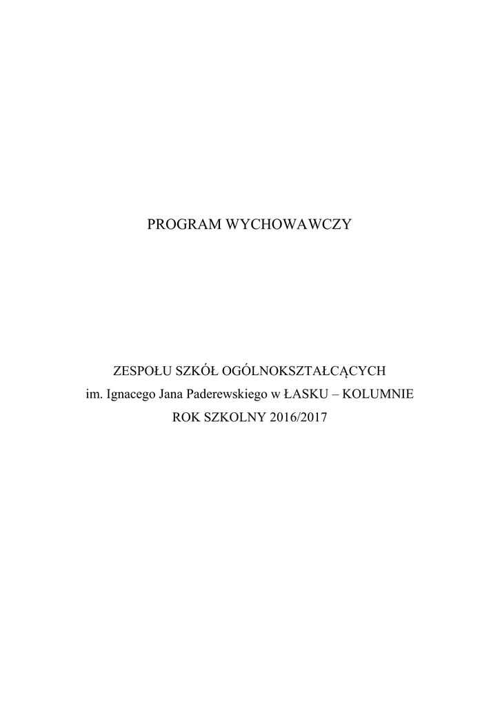 PROGRAM WYCHOWAWCZY ZESPOŁU SZKÓŁ OGÓLNOKSZTAŁCĄCYCH im. Ignacego Jana Paderewskiego w ŁASKU – KOLUMNIE ROK SZKOLNY 2016/2017 PODSTAWA PRAWNA: Powszechna Deklaracja Praw Człowieka z dnia 10 grudnia 1948 r. Europejska Konwencja o Ochronie Praw Człowieka i Podstawowych Wolności z dnia 4 listopada 1950 r. Deklaracja Praw Dziecka z 20 listopada 1959 r. Konwencja o Prawach Dziecka Narodów Zjednoczonych z 20 listopada 1989 r. Konstytucja Rzeczypospolitej Polskiej z 1997 r. (art. 48, 53, 70) Ustawa o systemie oświaty z dn. 7.09.1991 r. (art. 1, 5, 33, 34a, 40) Ustawa z dn. 26.01.1982 r. Karta Nauczyciela (art. 6) Statut ZSO w Łasku - Kolumnie Podstawa Programowa Kształcenia Ogólnego - Rozporządzenie Ministra Edukacji Narodowej z dnia 30.05.2014r. Zespół Szkół Ogólnokształcących im. I. J. Paderewskiego w Łasku - Kolumnie to szkoła przyjazna dla uczniów, dająca poczucie bezpieczeństwa, stwarzająca optymalne warunki do wszechstronnego rozwoju uczniów, gwarantująca dobre i skuteczne nauczanie i wychowanie. W trosce o wszechstronny rozwój osobowy ucznia, który jest najbardziej ogólnym celem procesu wychowania, a także w trosce o to, by dziecko znajdowało w rodzinie i szkole środowisko rozwoju osobowego w wymiarze intelektualnym, psychicznym, społecznym, duchowym, moralnym, estetycznym oraz zdrowotnym, rozwijało w sobie dociekliwość poznawczą poszukując prawdy, dobra i piękna w świecie, by zyskiwało przekonanie o życiowej użyteczności edukacji szkolnej, by uczyło się szacunku dla dobra wspólnego oraz przygotowywało się do życia w rodzinie, społeczności lokalnej i państwie w duchu przekazu dziedzictwa kulturowego i kształtowania postaw patriotyzmu, ustanawia się niniejszy program wychowawczy szkoły. Postanowienia ogólne Uznaje się, że pierwotne i największe prawa wychowawcze w stosunku do swoich dzieci mają rodzice (opiekunowie prawni). Nauczyciele wspierają rodziców w dziele wychowania. Uznaje się zatem, że kierunki działań wychowawczych szkoły nie mogą być sprzeczne z wolą rodziców, a nauczyciele nie ponoszą całkowitej i wyłącznej odpowiedzialności za efekty wychowania. Uznaje się, że zarówno rodzice jak i szkoła w działaniach wychowawczych uznają nawzajem własne oczekiwania i oczekiwania dziecka. Program wychowawczy szkoły jest uchwalany przez Radę Rodziców w porozumieniu z Radą Pedagogiczną. Uznaje się, że wychowanie stanowi jeden z podstawowych wymiarów pracy każdego nauczyciela zatrudnionego w szkole i opiera się w dużej mierze na indywidualnych relacjach nauczyciel – uczeń. Uznaje się, że na każdym etapie edukacji nauczyciele dostosują przekazywanie wiedzy, kształtowanie umiejętności i postaw do naturalnej dla wieku dziecka aktywności, umożliwią poznanie świata w jego jedności i złożoności, będą wspomagać samodzielność uczenia się, inspirować do wyrażania własnych myśli i przeżyć, rozbudzać ciekawość poznawczą oraz motywację do dalszej nauki na miarę możliwości rozwojowych dziecka, zakładając jednocześnie, że dokonywane postępy mogą mieć indywidualne tempo. CELE OGÓLNE I. II. Zapewnienie poczucia bezpieczeństwa wszystkim uczniom. Kształtowanie umiejętności uczenia się jako sposobu zaspokajania naturalnej ciekawości świata, odkrywania swoich zainteresowań i przygotowania do dalszej edukacji. III. Kształtowanie u indywidualnemu uczniów i cech społecznemu, sprzyjających ich takich uczciwość, jak: dalszemu rozwojowi wiarygodność, odpowiedzialność, wytrwałość, poczucie własnej wartości, szacunek dla innych ludzi, ciekawość poznawcza, kreatywność, przedsiębiorczość, wysoka kultura osobista, gotowość do uczestnictwa w kulturze, umiejętność podejmowania inicjatyw oraz pracy zespołowej. IV. Kształtowanie człowieka zdrowego, wolnego od uzależnień, żyjącego w zgodzie z przyrodą. Kształtowanie postawy obywatelskiej, postawy poszanowania tradycji i kultury V. własnego narodu, a także postawy poszanowania dla innych kultur, narodów, religii i tradycji. Zapobieganie wszelkiej dyskryminacji. VI. Kształtowanie u uczniów postaw warunkujących sprawne i odpowiedzialne funkcjonowanie we współczesnym świecie. CELE SZCZEGÓŁOWE I PRIORYTET Upowszechnianie czytelnictwa, rozwijanie kompetencji czytelniczych wśród dzieci i młodzieży Zadania: 1. Ukazywanie wartości literatury. 2. Wspieranie i promowanie czytelnictwa wśród uczniów. 3. Organizowanie imprez literacko - czytelniczych integrujących szkołę ze środowiskiem lokalnym. 4. Kształtowanie świadomego odbiorcy kultury. Działania: Spotkania z ciekawymi ludźmi (działaczami, twórcami kultury). Obchody uroczystości i imprez szkolnych. Przedsięwzięcia szkolne poświęcone rocznicom różnych wydarzeń historyczno – literackich. Realizacja w/w tematyki na godzinach wychowawczych i innych zajęciach edukacyjnych. Wyjazdy uczniów na koncerty, przedstawienia, filmy do instytucji kultury. Organizacja głośnego czytania dla uczniów. Organizacja spotkań autorskich, konkursów we współpracy z biblioteką szkolną i publiczną. Spodziewane efekty: Uczeń: będzie szanował polskie dziedzictwo kulturowe i język ojczysty, pozna polską, a także europejską i światową literaturę i sztukę, będzie uważnie słuchał czytanego tekstu, będzie czytał ulubione książki, wskaże i nazwie ulubionych bohaterów literackich, poprawi jakość czytania, umiejętność opowiadania, recytowania, wzbogaci swoje słownictwo, weźmie udział w konkursach związanych z literaturą, czytelnictwem, posiądzie wiedzę o zasobach i działalności biblioteki szkolnej/publicznej, zgromadzi książki w swojej biblioteczce domowej/ klasowej i będzie dbał o nie, będzie umiał zachować się podczas imprez kulturalnych, np. wieczorków poetyckich, spotkań z autorami. Termin realizacji: zgodnie z kalendarzem działań wychowawczych i profilaktycznych 2016/2017 II PRIORYTET 