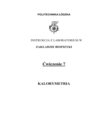 POLITECHNIKA ŁÓDZKA INSTRUKCJA Z LABORATORIUM W ZAKŁADZIE BIOFIZYKI Ćwiczenie 7 KALORYMETRIA Kalorymetria I. WSTĘP TEORETYCZNY Kalorymetria jest działem fizyki zajmującym się metodami pomiaru ciepła wydzielanego bądź pochłanianego w trakcie procesów fizycznych (np. zamiana pracy na ciepło), chemicznych (np. ciepło reakcji chemicznych) lub biologicznych. Przekazywaniem ciepła rządzą trzy zasady: 1. Ilość ciepła Q, potrzebna do ogrzania ciała o masie m o ∆T, wyraża się wzorem: Q = c m ∆T Współczynnik c nazywamy ciepłem właściwym i jest ilością ciepła potrzebną go ogrzania 1 kg dowolnego ciała o jeden Kelwin. Jednostką ciepła właściwego jest J · kg-1· K-1 2. Ilość ciepła oddanego przez ciało jest równa ilości ciepła pobranego przez ciała otaczające. 3. Ilość ciepła pobrana przez ciało przy podgrzewaniu od temperatury T1 do T2 jest równa ilości ciepła oddanego przy chłodzeniu w tym samym Zakresie temperatur, jeżeli ciało przechodzi przez te same stany pośrednie w odwrotnej kolejności. Ostatnie dwie zasady wynikają z zasady zachowania energii. W wyniku przemiany materii w organizmach żywych powstaje ciepło, które zostaje zużyte przez organizm na endotermiczne reakcje chemiczne, na pracę mechaniczną, energię elektryczną oraz energię fal elektromagnetycznych. Część ciepła zostaje różnymi drogami odprowadzona na zewnątrz organizmu. Wydzielenie ciepła przez organizm jest podstawowym czynnikiem utrzymywania odpowiedniej temperatury organizmu i stanowi składową część procesów termoregulacji. Poniżej podany jest bilans energii cieplnej przeciętnego organizmu ludzkiego w ciągu 24 godzin. 1 Kalorymetria Pokarm pobrany g kJ Razem kJ Białka 57,8 992 Tłuszcze 140,5 5 472 Węglowodany 81,7 1 403 7 867 Rozchód energii kJ sposoby oddawania ciepła ciepło oddawane z powierzchni ciała 5 753 ciepło wydychanego powietrza 180 ciepło wydalane z moczem i kałem 96 ciepło zużyte na wyparowanie wody przez płuca 758 ciepło zużyte na wyparowanie wody przez skórę 950 poprawki 46 Różnica między całkowitą ilością razem kJ ciepła uzyskanego 7 783 w organizmie i wydzielonego wynika z niedokładności pomiarów. II. OPIS BUDOWY STANOWISKA Pomiary ciepła wykonuje się w kalorymetrach (rys.1.). W celu ograniczenia wymiany ciepła z otoczeniem powleka się zewnętrzne ścianki warstwą srebra lub chromu, a sam kalorymetr stawia się na podstawce izolacyjnej w osłonie przykrytej pokrywką. Niekiedy osłona posiada podwójne ścianki i wypełniona jest wodą. Aby do minimum ograniczyć wymianę ciepła z otoczeniem, stosuje się kalorymetr z termosem ( naczynie Dewara). 2 Kalorymetria termometr mieszadło pojemnik wewnętrzny kalorymetru nr 1 pojemnik zewnętrzny warstwa izolacyjna pojemnik wewnętrzny kalorymetru nr 2 pojemnik z materiału izolacyjnego Rys.1. Schemat układu pomiarowego III. PRZEBIEG ĆWICZENIA A. WYZNACZANIE CIEPŁA TOPNIENIA LODU 1. Wyznaczyć masę m1 osuszonego wewnętrznego naczynia kalorymetru. 2. Nalać wodę do połowy objętości kalorymetru. 3. Wyznaczyć masę m2 naczynia z wodą. 4. Obliczyć masę wody mw mw = m 2 – m 1 5. Naczynie wewnętrzne wstawić do kalorymetru i mierzyć temperaturę wody co 1min. Trzeba pamiętać o mieszaniu. 6. Temperaturę należy odczytywać aż do momentu ustalenia się równowagi cieplnej (stałej temperatury). 7. Osuszyć bibułą kawałki kawałki lodu i wrzucić do kalorymetru mieszając cały czas wodę. 8. Mierzyć temperaturę wody co 1 min. do chwili, gdy temperatura zacznie równomiernie wzrastać. 9. Wyznaczyć masę mk kalorymetru z wodą, a następnie masę stopionego lodu ml = mk – m2. 3 Kalorymetria 10. Wyniki pomiarów przedstawić w tabeli. mk ck mw cw To T1 T2 ∆T m1 [kg] J kg ⋅ K [kg] J kg ⋅ K [K] [K] [K] [K] [kg] 11. Obliczyć ciepło topnienia lodu. 12. Maksymalny błąd bezwzględny ∆c , popełniony przy wyznaczaniu ciepła właściwego topnienia lodu, obliczyć ze wzoru: 2(mk c k + mw c w ) ∆c = + c w ∆T ml 13. Wykonać wykres zależności temperatury wody od czasu. B. WYZNACZANIE ILOŚCI CIEPŁA WYDZIELANEGO PRZEZ ORGANIZM CZŁOWIEKA PRZY WYDYCHANIU 1. Wyznaczyć masę mkw1 wewnętrznego naczynia kalorymetru nr 1. 2. Wyznaczyć masę mw2 wewnętrznego naczynia kalorymetru nr 2. 3. Pojemnik nr 3 (wykonany z tworzywa sztucznego) wypełnić drobno potłuczonym i możliwie suchym lodem i umieścić go w kalorymetrze nr1. Całość umieścić w osłonie i szczelnie zamknąć pokrywą. 4. Na wystającą część rurki pojemnika nałożyć wąż gumowy wraz z ustnikiem. 5. Po upływie 15 minut szybko wymienić wewnętrzne naczynie kalorymetru nr1 na wewnętrzne naczynie nr 2 i w ciągu 15 minut wydychać powietrze do kalorymetru przez wąż gumowy. 4 Kalorymetria Należy pamiętać, aby oddech był jak najbardziej zbliżony do normalnego, a wydychane powietrze było w całości wtłoczone do kalorymetru. 6. Po ukończeniu wydychania wyjąć pojemnik wraz z pozostałą częścią lodu. 7. Wyznaczyć masę mkw1 kalorymetru nr 1 z wodą. 8. Obliczyć masę wody mw1 powstałej ze stopionego lodu w temperaturze otoczenia. 9. Wyznaczyć masę mkw2 kalorymetru nr 2 z wodą. 10. Obliczyć masę mw2 wody powstałej w kalorymetrze podczas wydychania powietrza. 11. Obliczyć masę wody mw powstałej przez wydychanie powietrza przy ochłodzeniu się do temperatury topnienia lodu (to = 0oC) ( m w = m w2 − m1w − m wp ) gdzie: mwp – masa wody powstałej w wyniku skroplenia się pary wodnej zawartej w wydychanym powietrzu; mwp = 5g 12. Odczytać temperaturę otoczenia tp. 13. Znając masę mw obliczyć całkowite ciepło stracone (Qo) Qo = mw٠L gdzie: L – ciepło topnienia lodu; L = 335٠103 J/kg ( ) Q = mw2 − m1w − m wp ⋅ L 14. Ciepło Qo jest równe ciepłu jakie traciłby organizm przez oddychania Gdyby temperatura wydychanego powietrz była 0oC. Ponieważ doświadczenia jest przeprowadzane w temperaturze pokojowej, więc 