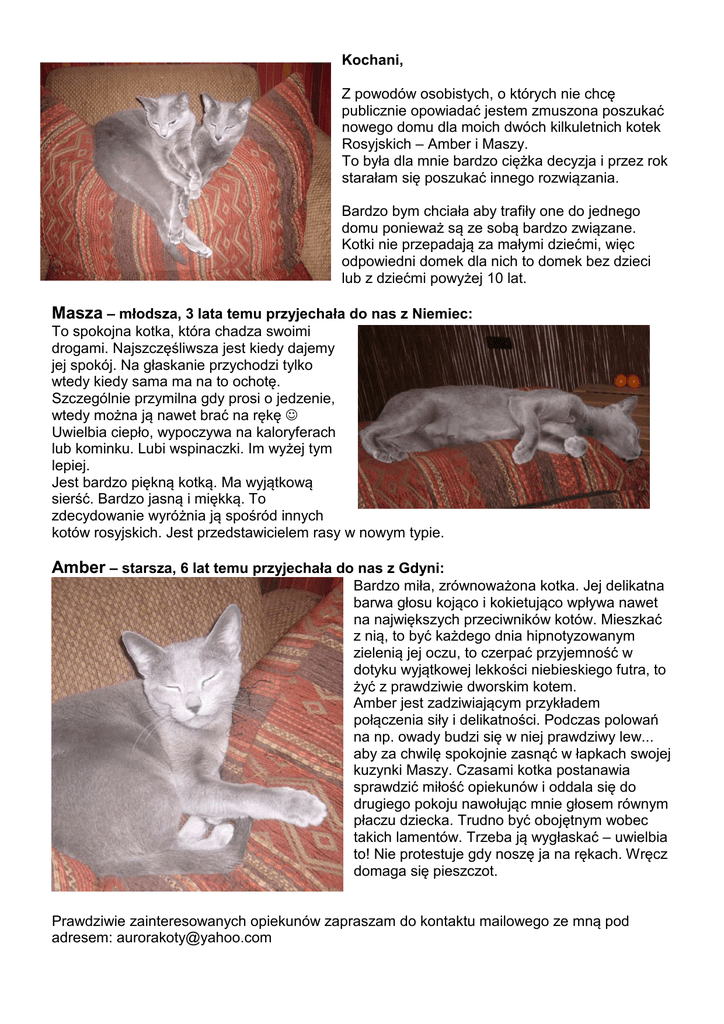 Kochani, Z powodów osobistych, o których nie chcę publicznie opowiadać jestem zmuszona poszukać nowego domu dla moich dwóch kilkuletnich kotek Rosyjskich – Amber i Maszy. To była dla mnie bardzo ciężka decyzja i przez rok starałam się poszukać innego rozwiązania. Bardzo bym chciała aby trafiły one do jednego domu ponieważ są ze sobą bardzo związane. Kotki nie przepadają za małymi dziećmi, więc odpowiedni domek dla nich to domek bez dzieci lub z dziećmi powyżej 10 lat. Masza – młodsza, 3 lata temu przyjechała do nas z Niemiec: To spokojna kotka, która chadza swoimi drogami. Najszczęśliwsza jest kiedy dajemy jej spokój. Na głaskanie przychodzi tylko wtedy kiedy sama ma na to ochotę. Szczególnie przymilna gdy prosi o jedzenie, wtedy można ją nawet brać na rękę ☺ Uwielbia ciepło, wypoczywa na kaloryferach lub kominku. Lubi wspinaczki. Im wyżej tym lepiej. Jest bardzo piękną kotką. Ma wyjątkową sierść. Bardzo jasną i miękką. To zdecydowanie wyróżnia ją spośród innych kotów rosyjskich. Jest przedstawicielem rasy w nowym typie. Amber – starsza, 6 lat temu przyjechała do nas z Gdyni: Bardzo miła, zrównoważona kotka. Jej delikatna barwa głosu kojąco i kokietująco wpływa nawet na największych przeciwników kotów. Mieszkać z nią, to być każdego dnia hipnotyzowanym zielenią jej oczu, to czerpać przyjemność w dotyku wyjątkowej lekkości niebieskiego futra, to żyć z prawdziwie dworskim kotem. Amber jest zadziwiającym przykładem połączenia siły i delikatności. Podczas polowań na np. owady budzi się w niej prawdziwy lew... aby za chwilę spokojnie zasnąć w łapkach swojej kuzynki Maszy. Czasami kotka postanawia sprawdzić miłość opiekunów i oddala się do drugiego pokoju nawołując mnie głosem równym płaczu dziecka. Trudno być obojętnym wobec takich lamentów. Trzeba ją wygłaskać – uwielbia to! Nie protestuje gdy noszę ja na rękach. Wręcz domaga się pieszczot. Prawdziwie zainteresowanych opiekunów zapraszam do kontaktu mailowego ze mną pod adresem: [email protected]