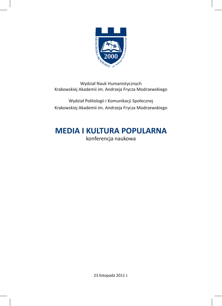 Wydział Nauk Humanistycznych Krakowskiej Akademii im. Andrzeja Frycza Modrzewskiego Wydział Politologii i Komunikacji Społecznej Krakowskiej Akademii im. Andrzeja Frycza Modrzewskiego MEDIA I KULTURA POPULARNA konferencja naukowa 23 listopada 2011 r. Media i kultura popularna konferencja naukowa Krakowskiej Akademii im. Andrzeja Frycza Modrzewskiego Kraków, 23 listopada 2011 r. Miejsce konferencji: Kampus Krakowskiej Akademii im. Andrzeja Frycza Modrzewskiego ul. Gustawa Herlinga – Grudzińskiego 1, Kraków PROGRAM 09.30-10.00 rejestracja uczestników, hol w budynku A 10.00-11.00 otwarcie konferencji z wykładem wprowadzającym prof. nadzw. dr hab. Zbigniewa Pucka, sala A 153 11.00-11.20 przerwa kawowa 11.20-12.50 obrady w sekcjach 12.50-13.50 obiad 13.50-15.50 obrady w sekcjach 15.50 kawa na zakończenie Panel 1. cz. 1, sala A 153, 11.20-12.50 moderator: prof. nadzw. dr hab. Zbigniew Pucek 1. prof. nadzw. dr hab. Bartosz Korzeniewski, Współczesne inscenizacje historyczne w kontekście zagadnienia medializacji pamięci 2. prof. nadzw. dr hab. Stanisław Galata, Urszula Pietrzyk, Kulturowe uwarunkowania działań zespołowych - na przykładzie sztuki 3. dr Marcin Sala – Szczypiński, Granice ekspresji artystycznej i krytyki wyznaczane ochroną dóbr osobistych 4. mgr Karolina Dudek, Przeciw-dyskursy fotografii ślubnej. O polityce reprezentacji 5. mgr Karol Kwiatkowski, Czym jest album „Biophilia” Björk i kim jest jego odbiorca? Immersja skrajnie aktywizująca w kulturze popularnej Panel 1. cz. 2, sala A 153, 13.50-15.50 moderator: prof. nadzw. dr hab. Zbigniew Pucek 1. dr Tadeusz Pawlus, Kultura popularna a kultura medialna – wybrane problemy teorii i rzeczywistości 2. dr Marta Raczek, Remiksowane historie – czyli czego uczy nas dzisiaj kino Douglasa Sirka 3. mgr Katarzyna Jaskulska – Dwuraźna, Kultura popularna – kultura społeczeństwa ponowoczesnego 4. mgr Agnieszka Klepek-Drozd, Intermedialność cechą charakterystyczną współczesnej kultury 5. mgr Samuel Nowak, Brytyjskie studia kulturowe a współczesne badania nad kulturą popularną 6. lic. Małgorzata Kromka, Tabloidyzacja mediów w kulturze pierwszych stron Panel 2. cz. 1, sala C 143, 11.20-12.50 moderator: prof. nadzw. dr hab. Ignacy S. Fiut 1. prof. nadzw. dr hab. Ignacy S. Fiut, Gry komputerowe a rozwój kultury popularnej 2. dr Katarzyna Plebańczyk, Gry masowe – alienacja czy integracja? 3. dr Marcin Zabawa, Subkultura Internetu: slang internetowy, Internet slangowy 4. dr Anita Basińska, Rekonstruowanie sieci społecznych. Komunikacja w nowych mediach na przykładzie analizy forów internetowych 5. mgr Joanna Pastuszka, Elektroniczne rysunki na ścianie – rola obrazkowych memów internetowych w procesie komunikacji i socjalizacji. Analiza treściowa wybranych polskich portali rozrywkowych Panel 2. cz. 2, sala A 136, 13.50-15.50 moderator: prof. nadzw. dr hab. Ignacy S. Fiut 1. dr Dariusz Baran, Czy internet niszczy kulturę? Rozważania na temat. wpływu rewolucji technologicznej na sposób odbioru muzyki 2. dr Jan Werszowiec Płazowski, dr Marek Suwara, Konwergencja mediów a granice kultury 3. dr Nina Stepnicka, Paulina Bąkowska, Kultura 2.0 i jej znaczenie w kształtowaniu zachowań społecznych na przykładzie wybranych serwisów internetowych w Polsce i na świecie 4. mgr Ilona Godlewska, Polski reportaż literacki w epoce Google 5. mgr Magdalena Oleszkowicz, Platformy internetowe największych nadawców telewizyjnych w Polsce – czyli jak telewizje walczą o widza w Internecie? 6. lic. Barbara Maria Kulesza, Znaczenie Internetu w rozwoju fan fiction, czyli – twórczość fanowska i nowe media Panel 3. cz. 1, sala A 217, 11.20-12.50 moderator: prof. nadzw. dr hab. Katarzyna Pokorna Ignatowicz 1. dr Artur Trudzik, Z eteru do cyberprzestrzeni. Radiowa „Trójka” w Internecie 2. mgr Agnieszka Garcarek, Czy w polskich komercyjnych rozgłośniach radiowych jest miejsce na kulturę? 3. mgr Kinga Zdrojewska, Format stacji radiowej jako element kultury popularnej 4. mgr Anna Deredas, Telewizja w życiu codziennym – życie codzienne w telewizji. O kreacji rzeczywistości przez media 5. mgr Przybysława Tomiczek, Magia telewizji – odrealniona rzeczywistość czy realna ułuda? Panel 3. cz. 2, sala A 217, 13.50-15.50 moderator: prof. nadzw. dr hab. Katarzyna Pokorna Ignatowicz 1. mgr Karolina Śmigiel, Współczesna telewizja newsowa – obiektywizm czy transparentność? 2. mgr Anna Woźniak, Co to znaczy być aktywnym odbiorcą telewizji? Relacja z antropologicznych badań nad relacją media – odbiorcy na wsi polskiej 3. dr Katarzyna Brataniec, Rola mediów i kultury popularnej w kształtowaniu współczesnej rzeczywistości społeczeństw arabskich 4. mgr Paulina Habas, Populistyczne zachowania partii politycznych w epoce mediów 5. mgr Edyta Żyrek, Pipolizacja polityki w kontekście polskiej sceny politycznej 6. dr Stanisław Sorys, Łemkowska tożsamość w świetle współczesnej kultury popularnej Panel 4. sala C 337, 11.20-12.50 moderator: dr Joanna Aksman 1. prof. dr hab. Andrzej Szyszko-Bohusz, Media i kultura popularna w przestrzeni wyobraźni współczesnego człowieka ze szczególnym uwzględnieniem Jego tożsamości kulturowej, postawy społeczno-moralnej, obywatelskiej, politycznej jak również wrażliwości estetycznej 2. dr Agnieszka Belcer, Kultura popularna jako jeden z czynników socjalizacji młodego pokolenia 3. dr Bożena Majerek, Media a poczucie niepewności współczesnego człowieka 4. mgr Katarzyna Małgorzata Stępkowska, Media i kultura popularna a rozwiązłość płciowa i erotomania 5. mgr Jacek Burski, Kibol w mediach – Moral panic w polskim dyskursie medialnym w kontekście zjawiska kibicowania Panel 5. sala A 243, 13.50-15.50 moderator: dr Grażyna Piechota 1. dr Marzena Barańska, Lokowanie produktu jako forma działań marketingowych w przekazach audiowizualnych 2. dr Anna Czerniak, Wizerunki mężczyzn w polskich reklamach telewizyjnych – 