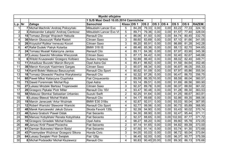 L.p. Nr Załoga 1 7 Michał Machnik/ Andrzej Połczyński 3 Aleksander Łabędź/ Andrzej Cienkosz 2 3 15 Tomasz Zbroja/ Wojciech Habuda 4 30 Marcin Głuszczyk/ Rafał Radoń 5 26 Krzysztof Rybka/ Ireneusz Kocoń 47 Rafał Dudek/ Patryk Kotarba 6 7 24 Tomasz Musiał/ Katarzyna Jantos 8 37 Łukasz Sawicki/ Mirosław Wieczorek 9 6 Witold Kruszewski/ Grzegorz Kolbiarz 10 11 Arkadiusz Buczek/ Marcin Borycki 38 Marcin Korczyk/ Kazimierz Gargas 11 12 14 Kamil Bolek/ Mateusz Baszczyński 13 18 Tomasz Głowacki/ Paulina Warykiewicz 14 60 Paweł Mika/ Katarzyna Ciupińska 15 73 Dawid Foremniak/ Michał Rup 16 27 Łukasz Mrożek/ Bartosz Trojanowski 17 20 Grzegorz Pękala/ Piotr Miller 18 58 Mateusz Słomka/ Sebastian Urbaniec 19 9 Łukasz Bławut/ Michał Wabik 20 19 Marcin Janeczek/ Artur Woźniak 21 12 Robert Wanicki/ Sławomir Wanicki 22 48 Marek Karczewski/ Jakub Dziura 23 46 Sylwia Graboń/ Paweł Oślak 24 95 Mariusz Kobyliński/ Renata Kobylińska 25 10 Grzegorz Gniadek/ Michał Kotaś 26 49 Janusz Król/ Paweł Pociecha 27 61 Damian Bukowiec/ Marcin Bzdyl 28 43 Przemysław Woźnica/ Grzegorz Sikora 29 64 Łukasz Świątek/ Piotr Świątek 8 Michał Podsiadło/ Michał Kluziewicz 30 Wyniki oficjalne 1 SJS Maxi Oes5 10.05.2014 Czernichów Samochód Klasa OS 1 OS 2 OS 3 OS 4 OS 5 OS 6 RAZEM: Mitsubishi Lancer Evo 5 84,28 79,33 0,00 0,00 83,22 77,33 324,16 Mitsubishi Lancer Evo VI 5 89,71 79,36 0,00 0,00 81,57 77,40 328,04 Renault Clio 4 86,06 81,50 0,00 0,00 84,74 80,45 332,75 Citroen Saxo 3 88,60 83,69 0,00 0,00 87,10 81,66 341,05 Citroen Saxo 3 88,20 85,91 0,00 0,00 86,89 81,28 342,28 BMW 318 IS 4 88,46 85,36 0,00 0,00 88,13 82,70 344,65 Renault Clio 4 89,11 84,38 0,00 0,00 87,97 83,90 345,36 Citroen Saxo 3 87,17 84,42 0,00 0,00 92,40 82,67 346,66 Subaru Impreza 5 92,89 86,40 0,00 0,00 88,02 82,40 349,71 Opel Astra Gsi 4 89,41 86,82 0,00 0,00 91,59 84,64 352,46 Citroen Saxo 3 90,07 88,34 0,00 0,00 90,87 86,05 355,33 Renault Clio Sport 4 90,62 91,09 0,00 0,00 87,97 85,86 355,54 Renault Clio 4 92,32 87,26 0,00 0,00 90,47 86,70 356,75 Fiat Cinquecento 2 89,59 86,35 10,00 0,00 88,59 86,04 360,57 Opel Astra 4 93,14 89,51 0,00 0,00 91,69 86,56 360,90 Citroen Saxo 3 92,37 89,78 0,00 0,00 90,37 88,50 361,02 Renault Clio 16V 4 93,47 90,48 0,00 0,00 91,28 88,30 363,53 Suzuki Swift 2 92,25 91,64 0,00 0,00 91,25 88,67 363,81 Renault Clio 4 94,17 89,68 0,00 0,00 92,86 89,35 366,06 BMW E30 318is 4 92,87 92,01 0,00 0,00 93,03 90,04 367,95 Renault Clio Sport 4 92,77 99,56 0,00 0,00 90,73 85,89 368,95 Skoda Favorit 135L 2 92,39 94,90 0,00 0,00 93,43 90,02 370,74 Fiat Seicento 2 94,30 88,90 0,00 0,00 92,47 95,44 371,11 Fiat Seicento 2 92,37 88,65 0,00 0,00 102,93 87,77 371,72 Opel Astra 4 98,27 88,20 0,00 0,00 89,80 95,78 372,05 Fiat Seicento 2 97,14 91,65 0,00 0,00 94,82 89,39 373,00 Fiat Seicento 2 97,50 91,14 0,00 0,00 93,74 91,30 373,68 Honda Civic 3 94,05 93,03 0,00 0,00 96,72 90,04 373,84 Fiat 126p 1 96,45 92,00 0,00 0,00 96,37 90,77 375,59 Renault Clio 4 90,83 90,40 20,00 0,00 89,30 86,13 376,66 31 32 33 34 35 36 37 38 39 40 41 42 43 44 45 46 47 48 49 50 51 52 53 54 55 56 57 58 59 60 61 62 63 4 13 63 39 70 53 62 52 57 21 55 29 33 51 31 54 40 34 25 32 28 16 1 94 42 56 41 50 45 44 59 23 17 Kamil Sermak/ Agata Sermak Kajetan Tatar/ Martyna Maciusiak Łukasz Kotowicz/ Robert Talarek Szymon Żorłok/ Damian Goryczka Konrad Dukat/ Grzegorz Kubis Maciej Panuś/ Magda Panuś Dariusz Lamot/ Szymon Ber Michał Michalczyk/ Marcin Godyń Adam Brańka/ Paweł Duniewicz Marcin Gawlik/ Maciej Masełko Wojciech Rozwadowski/ Michał Kosałka Krzysztof Bednarski/ Mirosław Bednarski Józef Oleś/ Robert Tatarczyk Łukasz Wojtal/ Łukasz Skwara Łukasz Przybyła/ Tomasz Latosiński Paweł Szot/ Kamil Waśniowski Bartłomiej Bogucki/ Łukasz Błażowski Eliasz Mazurek/ Paweł Janicki Michał Lisowski/ Piotr Kuźniarski Tomasz Dziedzic/ Kamil Nestorowicz Marcin Popiela/ Artur Jaszczyński Krzysztof Wawrzuta/ Arkadiusz Piela Tomasz Lichowski/ Jan Strażyński Marek Miller/ Grzegorz Gajda Szymon Kalczyński/ Rafał Goldman Marek Mendela/ Robert Krzyża Jakub Stawiarski/ Grzegorz Wilusz Paweł Pawlik/ Sławek Żubrowski Karol Chramęga/ Dominika Rachtan Paweł Bernard/ Paweł Stelmachowski Łukasz Wójtowicz/ Piotr Wójtowicz Dominik Momola/ Kamil Momola Filip Mich/ Marek Mich Peugeot 207 Fiat CC Sporting Fiat 126p Honda Civic Honda Civic Fiat Seicento Fiat Seicento Fiat Seicento Opel Corsa Honda Civi type R Fiat Seicento Peugeot 106 Honda Civic Fiat Cinquecento Peugeot 106 Fiat Cinquecento Renault Clio Sport Peugeot 106 Toyota Celica Opel Astra Citroen C2 Ford Sierra Subaru Impreza GT Fiat Seicento Honda Civic Fiat Seicento Peugeot 106 Suzuki Swift GTI Fiat Cinquecento Fiat SCS Fiat Cinquecento Opel Astra Honda Civic EG3 5 2 1 3 3 2 2 2 2 4 2 3 3 2 3 2 4 3 4 3 3 4 5 2 3 2 3 2 2 2 2 4 4 94,35 97,88 94,55 96,98 97,36 100,12 97,72 99,89 102,08 99,02 101,95 97,03 109,19 100,72 98,92 101,16 108,57 109,00 105,21 111,06 104,14 103,85 88,48 107,67 104,04 94,78 222,89 132,10 97,13 218,45 237,94 96,34 713,56 96,54 93,40 90,98 91,62 93,38 96,50 99,29 94,89 97,46 93,82 96,62 96,07 96,59 100,10 96,50 94,22 88,86 94,16 100,94 97,48 97,03 101,85 86,44 105,87 95,04 90,85 84,35 159,65 98,20 106,86 108,83 92,88 87,03 0,00 0,00 95,29 93,00 0,00 0,00 96,75 91,31 10,00 0,00 95,09 89,08 0,00 10,00 92,75 88,58 0,00 0,00 99,94 94,45 0,00 0,00 96,55 93,00 0,00 0,00 95,89 94,23 0,00 0,00 98,18 95,08 0,00 0,00 96,90 92,03 10,00 0,00 93,93 93,47 0,00 0,00 98,95 93,49 0,00 10,00 99,18 90,03 0,00 0,00 94,33 92,89 0,00 0,00 98,60 94,77 10,00 0,00 96,83 94,34 0,00 0,00 109,22 93,81 0,00 0,00 105,67 96,67 0,00 0,00 106,19 91,77 0,00 0,00 99,88 96,47 0,00 0,00 100,66 99,08 10,00 10,00 95,93 92,99 10,00 0,00 101,72 96,42 0,00 60,00 100,29 82,25 0,00 0,00 109,19 99,63 0,00 50,00 96,39 90,32 0,00 0,00 94,58 157,60 0,00 0,00 86,08 80,89 0,00 0,00 112,86 93,75 0,00 120,00 95,77 93,04 0,00 0,00 110,93 101,85 0,00 0,00 120,66 99,17 0,00 0,00 349,74 91,50 0,00 0,0