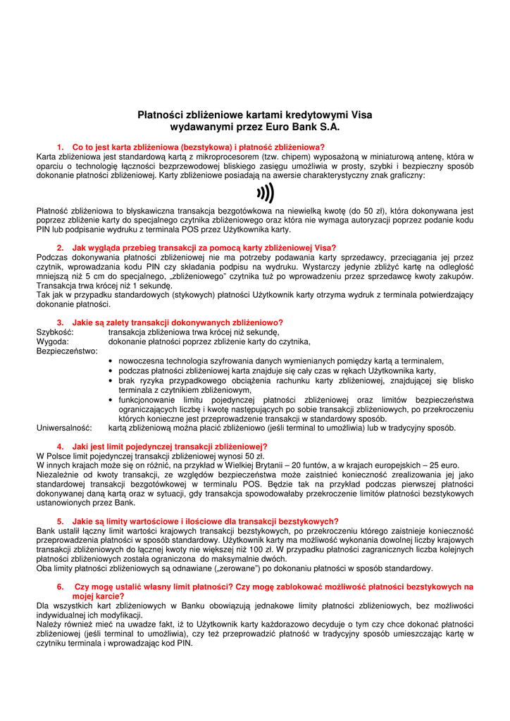 Płatności zbliżeniowe kartami kredytowymi Visa wydawanymi przez Euro Bank S.A. 1. Co to jest karta zbliżeniowa (bezstykowa) i płatność zbliżeniowa? Karta zbliżeniowa jest standardową kartą z mikroprocesorem (tzw. chipem) wyposażoną w miniaturową antenę, która w oparciu o technologię łączności bezprzewodowej bliskiego zasięgu umożliwia w prosty, szybki i bezpieczny sposób dokonanie płatności zbliżeniowej. Karty zbliżeniowe posiadają na awersie charakterystyczny znak graficzny: Płatność zbliżeniowa to błyskawiczna transakcja bezgotówkowa na niewielką kwotę (do 50 zł), która dokonywana jest poprzez zbliżenie karty do specjalnego czytnika zbliżeniowego oraz która nie wymaga autoryzacji poprzez podanie kodu PIN lub podpisanie wydruku z terminala POS przez Użytkownika karty. 2. Jak wygląda przebieg transakcji za pomocą karty zbliżeniowej Visa? Podczas dokonywania płatności zbliżeniowej nie ma potrzeby podawania karty sprzedawcy, przeciągania jej przez czytnik, wprowadzania kodu PIN czy składania podpisu na wydruku. Wystarczy jedynie zbliżyć kartę na odległość mniejszą niż 5 cm do specjalnego, „zbliżeniowego” czytnika tuż po wprowadzeniu przez sprzedawcę kwoty zakupów. Transakcja trwa krócej niż 1 sekundę. Tak jak w przypadku standardowych (stykowych) płatności Użytkownik karty otrzyma wydruk z terminala potwierdzający dokonanie płatności. 3. Jakie są zalety transakcji dokonywanych zbliżeniowo? Szybkość: transakcja zbliżeniowa trwa krócej niż sekundę, Wygoda: dokonanie płatności poprzez zbliżenie karty do czytnika, Bezpieczeństwo: • nowoczesna technologia szyfrowania danych wymienianych pomiędzy kartą a terminalem, • podczas płatności zbliżeniowej karta znajduje się cały czas w rękach Użytkownika karty, • brak ryzyka przypadkowego obciążenia rachunku karty zbliżeniowej, znajdującej się blisko terminala z czytnikiem zbliżeniowym, • funkcjonowanie limitu pojedynczej płatności zbliżeniowej oraz limitów bezpieczeństwa ograniczających liczbę i kwotę następujących po sobie transakcji zbliżeniowych, po przekroczeniu których konieczne jest przeprowadzenie transakcji w standardowy sposób. Uniwersalność: kartą zbliżeniową można płacić zbliżeniowo (jeśli terminal to umożliwia) lub w tradycyjny sposób. 4. Jaki jest limit pojedynczej transakcji zbliżeniowej? W Polsce limit pojedynczej transakcji zbliżeniowej wynosi 50 zł. W innych krajach może się on różnić, na przykład w Wielkiej Brytanii – 20 funtów, a w krajach europejskich – 25 euro. Niezależnie od kwoty transakcji, ze względów bezpieczeństwa może zaistnieć konieczność zrealizowania jej jako standardowej transakcji bezgotówkowej w terminalu POS. Będzie tak na przykład podczas pierwszej płatności dokonywanej daną kartą oraz w sytuacji, gdy transakcja spowodowałaby przekroczenie limitów płatności bezstykowych ustanowionych przez Bank. 5. Jakie są limity wartościowe i ilościowe dla transakcji bezstykowych? Bank ustalił łączny limit wartości krajowych transakcji bezstykowych, po przekroczeniu którego zaistnieje konieczność przeprowadzenia płatności w sposób standardowy. Użytkownik karty ma możliwość wykonania dowolnej liczby krajowych transakcji zbliżeniowych do łącznej kwoty nie większej niż 100 zł. W przypadku płatności zagranicznych liczba kolejnych płatności zbliżeniowych została ograniczona do maksymalnie dwóch. Oba limity płatności zbliżeniowych są odnawiane („zerowane”) po dokonaniu płatności w sposób standardowy. 6. Czy mogę ustalić własny limit płatności? Czy mogę zablokować możliwość płatności bezstykowych na mojej karcie? Dla wszystkich kart zbliżeniowych w Banku obowiązują jednakowe limity płatności zbliżeniowych, bez możliwości indywidualnej ich modyfikacji. Należy również mieć na uwadze fakt, iż to Użytkownik karty każdorazowo decyduje o tym czy chce dokonać płatności zbliżeniowej (jeśli terminal to umożliwia), czy też przeprowadzić płatność w tradycyjny sposób umieszczając kartę w czytniku terminala i wprowadzając kod PIN. 7. Czy kartą zbliżeniową można też płacić w sposób tradycyjny oraz przez Internet? Karta zbliżeniowa pozwala również na dokonywanie tradycyjnych płatności potwierdzanych kodem PIN lub podpisem we wszystkich terminalach oznaczonych logo VISA, a także płatności za towary i usługi zamawiane przez Internet. W razie potrzeby kartą można także wypłacać pieniądze z bankomatu. 8. Gdzie mogę płacić kartą zbliżeniową? Transakcji zbliżeniowej można dokonać w każdym punkcie handlowo-usługowym wyposażonym w specjalny czytnik zbliżeniowy oznaczony charakterystycznym znakiem graficznym: Funkcjonalność zbliżeniowa jest zaletą szczególnie przydatną w miejscach, gdzie ważna jest szybkość dokonywania transakcji, takich jak bary szybkiej obsługi, stacje benzynowe, sklepy z artykułami pierwszej potrzeby, kawiarnie, kioski z prasą, automaty czy kasy biletowe. Przede wszystkim w takich miejscach znaleźć można terminale pozwalające na dokonanie płatności zbliżeniowej. Jednak ze względu na praktyczność i prostotę tej funkcjonalności, są one instalowane także w wielu innych miejscach, a sieć punktów umożliwiających dokonywanie płatności zbliżeniowych stale się powiększa. Wykaz punktów akceptujących płatności zbliżeniowe dla kart Visa w Polsce znajduje się na stronie www.visa.pl). 9. Czy są jakieś dodatkowe opłaty w związku z posiadaniem karty zblizeniowej? Z nową funkcjonalnością karty nie wiążą się żadne dodatkowe opłaty. 10. Czy karta zbliżeniowa jest bezpieczna? Co jeśli zgubię kartę? Dzięki zastosowaniu nowoczesnej technologii szyfrowania transmisji danych pomiędzy kartą a terminalem oraz mechanizmom zapobiegającym przypadkowym i niechcianym płatnościom, korzystanie z karty bezstykowej jest tak samo b