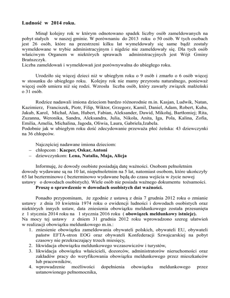 Ludność w 2014 roku. Minął kolejny rok w którym odnotowano spadek liczby osób zameldowanych na pobyt stałych w naszej gminie. W porównaniu do 2013 roku o 50 osób. W tych osobach jest 26 osób, które na przestrzeni kilku lat wymeldowały się same bądź zostały wymeldowane w trybie administracyjnym i nigdzie nie zameldowały się. Dla tych osób właściwym Organem w niektórych sprawach administracyjnych jest Wójt Gminy Brańszczyk. Liczba zameldowań i wymeldowań jest porównywalna do ubiegłego roku. Urodziło się więcej dzieci niż w ubiegłym roku o 9 osób i zmarło o 6 osób więcej w stosunku do ubiegłego roku. Kolejny rok nie mamy przyrostu naturalnego, ponieważ więcej osób umiera niż się rodzi. Wzrosła liczba osób, który zawarły związek małżeński o 31 osób. Rodzice nadawali imiona dzieciom bardzo różnorodnie m.in. Kasjan, Ludwik, Natan, Kazimierz, Franciszek, Piotr, Filip, Wiktor, Grzegorz, Kamil, Daniel, Adam, Robert, Kuba, Jakub, Karol, Michał, Alan, Hubert, Fabian, Aleksander, Dawid, Mikołaj, Bartłomiej; Rita, Zuzanna, Weronika, Sandra, Aleksandra, Julia, Nikola, Anita, Iga, Pola, Kalina, Zofia, Emilia, Amelia, Michalina, Jagoda, Oliwia, Laura, Gabriela,Izabela. Podobnie jak w ubiegłym roku dość zdecydowanie przeważa płeć żeńska: 43 dziewczynki na 36 chłopców. Najczęściej nadawane imiona dzieciom: chłopcom : Kacper, Oskar, Antoni dziewczynkom: Lena, Natalia, Maja, Alicja Informuję, że dowody osobiste posiadają datę ważności. Osobom pełnoletnim dowody wydawane są na 10 lat, niepełnoletnim na 5 lat, natomiast osobom, które ukończyły 65 lat bezterminowo ( bezterminowo wydawane będą do czasu wejścia w życie nowej ustawy o dowodach osobistych). Wiele osób nie posiada ważnego dokumentu tożsamości. Proszę o sprawdzenie w dowodach osobistych dat ważności. Ponadto przypominam, że zgodnie z ustawą z dnia 7 grudnia 2012 roku o zmianie ustawy z dnia 10 kwietnia 1974 roku o ewidencji ludności i dowodach osobistych oraz niektórych innych ustaw, data zniesienia obowiązku meldunkowego została przesunięta z 1 stycznia 2014 roku na 1 stycznia 2016 roku ( obowiązek meldunkowy istnieje). Na mocy tej ustawy z dniem 31 grudnia 2012 roku wprowadzono szereg ułatwień w realizacji obowiązku meldunkowego m.in.: 1. zniesienie obowiązku zameldowania obywateli polskich, obywateli EU, obywateli państw EFTA-stron EOG oraz obywateli Konfederacji Szwajcarskiej na pobyt czasowy nie przekraczający trzech miesięcy, 2. likwidacja obowiązku meldunkowego wczasowiczów i turystów, 3. likwidacja obowiązku właścicieli, dozorców, administratorów nieruchomości oraz zakładów pracy do weryfikowania obowiązku meldunkowego przez mieszkańców lub pracowników, 4. wprowadzenie możliwości dopełnienia obowiązku meldunkowego przez ustanowionego pełnomocnika, 5. wprowadzenie możliwości automatycznego wymeldowania przy zameldowaniu w nowym miejscu, 6. wydłużenie terminu na realizację obowiązku meldunkowego z 4 do 30 dni, 7. zniesienie sankcji karnych dla obywateli polskich, obywateli UE, obywateli EFTAstron EOG oraz obywateli Konfederacji Szwajcarskiej za niedopełnienie obowiązku meldunkowego, 8. odstąpienie od konieczności zgłaszania przy dopełnieniu obowiązku meldunkowego informacji o wykształceniu, obowiązku wojskowym oraz przedkładaniu wojskowego dokumentu osobistego, 9. wydłużenie okresów wyjazdów zagranicznych polegających zgłoszeniu w organie ewidencji ludności z 3 do 6 miesięcy. Szczegółowe dane znajdują się na stronie internetowej www.branszczyk.pl w zakładce „Dane Statystyczne”. Teresa Kasprowicz Kierownik USC