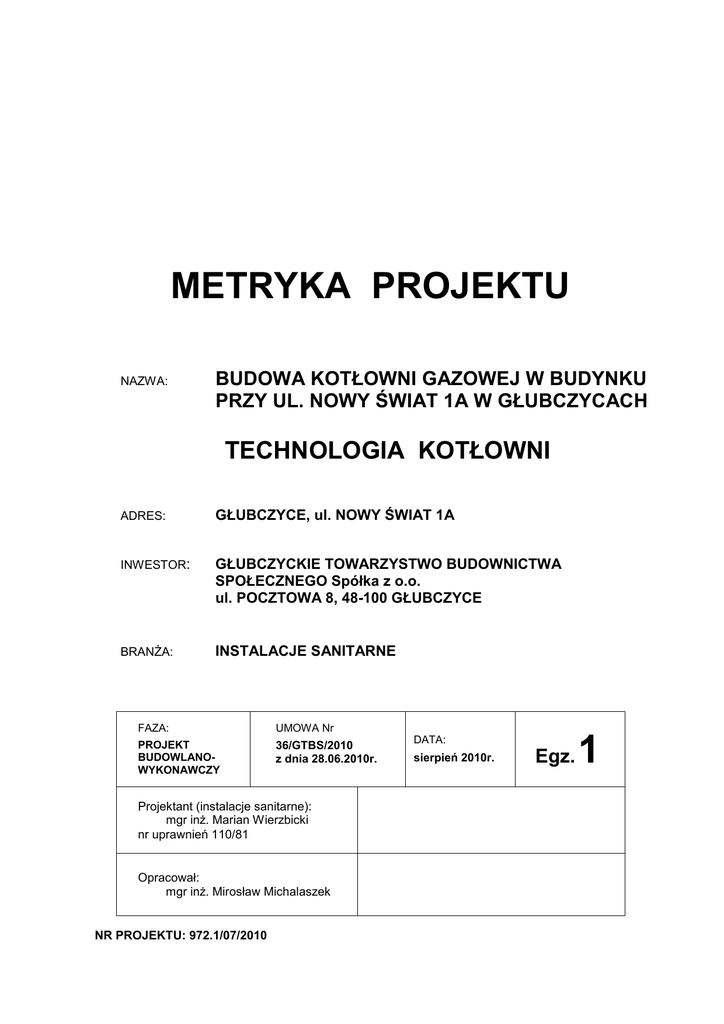 METRYKA PROJEKTU NAZWA: BUDOWA KOTŁOWNI GAZOWEJ W BUDYNKU PRZY UL. NOWY ŚWIAT 1A W GŁUBCZYCACH TECHNOLOGIA KOTŁOWNI ADRES: GŁUBCZYCE, ul. NOWY ŚWIAT 1A INWESTOR: GŁUBCZYCKIE TOWARZYSTWO BUDOWNICTWA SPOŁECZNEGO Spółka z o.o. ul. POCZTOWA 8, 48-100 GŁUBCZYCE BRANśA: INSTALACJE SANITARNE FAZA: UMOWA Nr PROJEKT BUDOWLANOWYKONAWCZY 36/GTBS/2010 z dnia 28.06.2010r. Projektant (instalacje sanitarne): mgr inŜ. Marian Wierzbicki nr uprawnień 110/81 Opracował: mgr inŜ. Mirosław Michalaszek NR PROJEKTU: 972.1/07/2010 DATA: sierpień 2010r. Egz. 1 Budowa kotłowni gazowej w budynku przy ul. Nowy Świat 1a w Głubczycach TECHNOLOGIA KOTŁOWNI SPIS ZAWARTOŚCI PROJEKTU CZĘŚĆ OPISOWA 1 OŚWIADCZENIE, UPRAWNIENIA I WPIS DO IZBY ........................................................................ 4 2 PODSTAWA OPRACOWANIA .......................................................................................................... 7 3 PRZEDMIOT OPRACOWANIA ......................................................................................................... 7 4 CEL I ZAKRES OPRACOWANIA ...................................................................................................... 7 5 PROJEKTY ZWIĄZANE .................................................................................................................... 7 6 LOKALIZACJA I STAN PRAWNY TERENU ..................................................................................... 7 7 KOTŁOWNIA GAZOWA .................................................................................................................... 8 7.1 Przewody w kotłowni ................................................................................................................... 8 7.2 Odprowadzenie spalin................................................................................................................. 9 7.3 Wentylacja kotłowni ..................................................................................................................... 9 7.4 Odprowadzenie ścieków ........................................................................................................... 10 7.5 Napełniania zładu ...................................................................................................................... 10 8 WEWNĘTRZNA INSTALACJA GAZOWA ....................................................................................... 10 9 WARUNKI WYKONANIA I ODBIORU KOTŁOWNI......................................................................... 11 10 WYTYCZNE ELEKTRYCZNE ......................................................................................................... 11 11 ADAPTACJA POMIESZCZENIA Z PRZEZNACZENIEM NA KOTŁOWNIĘ ................................... 11 12 PRZEPISY PRAWNE UWZGLĘDNIONE W OPRACOWANIU ...................................................... 12 13 ZESTAWIENIE MATERIAŁÓW ....................................................................................................... 14 14 INFORMACJA DOTYCZĄCA BEZPIECZEŃSTWA I OCHRONY ZDROWIA ................................ 19 14.1 Nazwa i adres obiektu budowlanego ........................................................................................ 19 14.2 Nazwa inwestora oraz jego adres ............................................................................................. 19 14.3 Imię i nazwisko oraz adres projektanta sporządzającego informację ....................................... 19 14.4 Cel opracowania ....................................................................................................................... 19 14.5 Zakres prac do wykonania podczas realizacji przedmiotowej inwestycji .................................. 19 14.6 Elementy robót stanowiące zagroŜenie dla bezpieczeństwa i zdrowia .................................... 20 14.7 Szkolenie i instruktaŜ pracowników .......................................................................................... 20 14.8 Środki organizacyjno – techniczne zapobiegające niebezpieczeństwom wynikającym z wykonywania robót budowlanych w strefach szczególnego zagroŜenia lub w ich sąsiedztwie .......... 20 14.9 Obowiązujące przepisy prawne uwzględnione w opracowaniu ................................................ 21 15. UZGODNIENIA: − Warunki przyłączenia do sieci gazowej wg TR4-440-130/07/10 z dnia 19 lipca 2010r, wydane przez GSG sp. z o.o. Oddział Zakład Gazowniczy w Opolu, ul. Armii Krajowej 2; − Informacja dot. zabudowy kotłowni gazowej, opracowana dnia 16 lipca 2010r. przez Usługi Kominiarskie Lucjan Wilk, Głubczyce, ul. Ogrodowa 3. CZEŚĆ GRAFICZNA 1. 2. PLAN REALIZACYJNY SCHEMAT TECHNOLOGICZNY Projekt budowlano-wykonawczy RYS. NR 01 RYS. NR 02 2 Budowa kotłowni gazowej w budynku przy ul. Nowy Świat 1a w Głubczycach TECHNOLOGIA KOTŁOWNI 3. 4. 5. 6. 7. 8. 9. 10. 11. 12. 13. RZUT KOTŁOWNI PRZEKRÓJ A – A WENTYLACJA I ODPROWADZENIE SPALIN - PRZEKROJE INSTALACJA ŚCIEKOWA – RZUT INSTALACJA ŚCIEKOWA – STUDZIENKA SCHŁADZAJĄCA PRACE BUDOWLANE INSTALACJA GAZOWA - RZUT INSTALACJA GAZOWA - ROZWINIĘCIE INSTALACJA GAZOWA – SKRZYNKA GAZOWA INSTALACJA GAZOWA – SCHEMAT DETEKCJI GAZU PRZEJŚCIE PRZEWODU GAZOWEGO PRZEZ PRZEGRODY Projekt budowlano-wykonawczy RYS. NR 03 RYS. NR 04 RYS. NR 05 RYS. NR 06 RYS. NR 07 RYS. NR 08 RYS. NR 09 RYS. NR 10 RYS. NR 11 RYS. NR 12 RYS. NR 13 3 Budowa kotłowni gazowej w budynku przy ul. Nowy Świat 1a w Głubczycach TECHNOLOGIA KOTŁOWNI 1 OŚWIADCZENIE, UPRAWNIENIA I WPIS DO IZBY Biuro Projektów PROFIM s.c. ul. Środkowa 5 47-400 Racibórz …………………………………… (Wykonawca) Racibórz, sierpień 2010r. OŚWIADCZENIE Zgodnie z art. 20 ust. 4 Ustawy z dnia 7 lipca 1994r. Prawo budowlane (Dz.U. Nr 156 poz. 1118 z 2006r. z późniejszymi zmianami) oświadczam, Ŝe niniejszy projekt budowlanowykonawczy pn. „Budowa kotłowni gazowej w budynku przy ul. Nowy Świat 1a w Głubczy