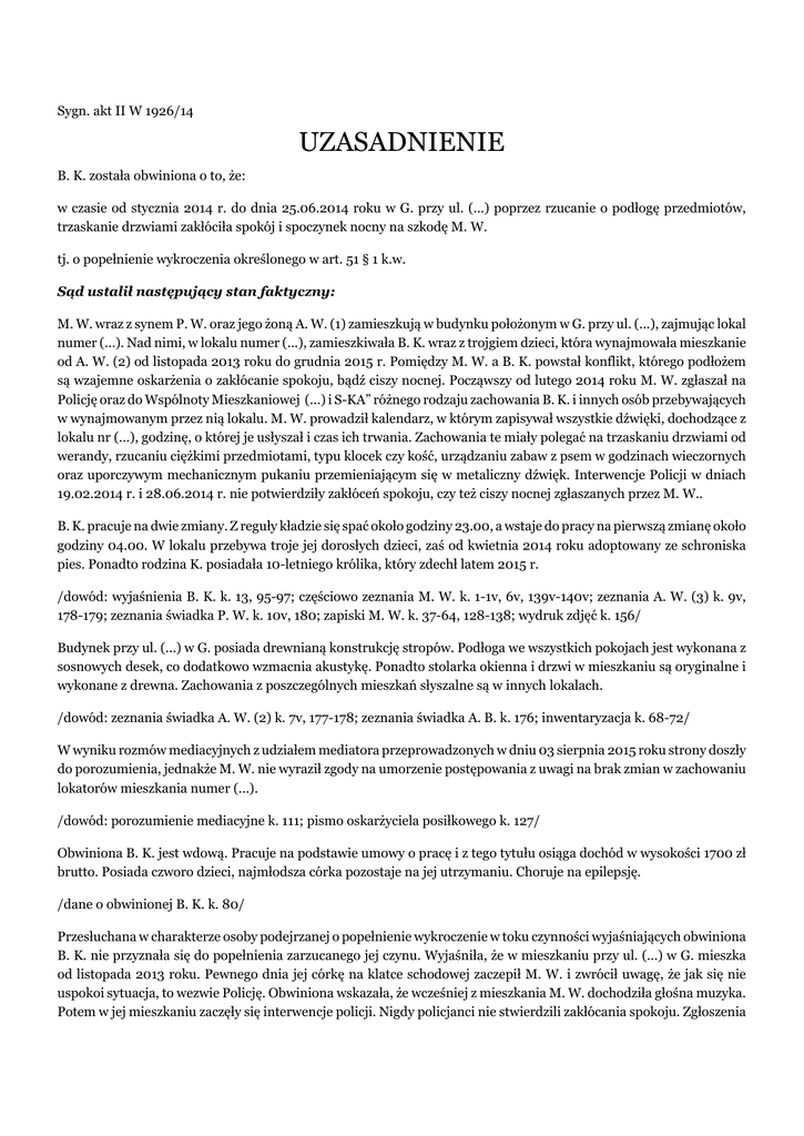Sygn. akt II W 1926/14 UZASADNIENIE B. K. została obwiniona o to, że: w czasie od stycznia 2014 r. do dnia 25.06.2014 roku w G. przy ul. (...) poprzez rzucanie o podłogę przedmiotów, trzaskanie drzwiami zakłóciła spokój i spoczynek nocny na szkodę M. W. tj. o popełnienie wykroczenia określonego w art. 51 § 1 k.w. Sąd ustalił następujący stan faktyczny: M. W. wraz z synem P. W. oraz jego żoną A. W. (1) zamieszkują w budynku położonym w G. przy ul. (...), zajmując lokal numer (...). Nad nimi, w lokalu numer (...), zamieszkiwała B. K. wraz z trojgiem dzieci, która wynajmowała mieszkanie od A. W. (2) od listopada 2013 roku do grudnia 2015 r. Pomiędzy M. W. a B. K. powstał konflikt, którego podłożem są wzajemne oskarżenia o zakłócanie spokoju, bądź ciszy nocnej. Począwszy od lutego 2014 roku M. W. zgłaszał na Policję oraz do Wspólnoty Mieszkaniowej (...) i S-KA” różnego rodzaju zachowania B. K. i innych osób przebywających w wynajmowanym przez nią lokalu. M. W. prowadził kalendarz, w którym zapisywał wszystkie dźwięki, dochodzące z lokalu nr (...), godzinę, o której je usłyszał i czas ich trwania. Zachowania te miały polegać na trzaskaniu drzwiami od werandy, rzucaniu ciężkimi przedmiotami, typu klocek czy kość, urządzaniu zabaw z psem w godzinach wieczornych oraz uporczywym mechanicznym pukaniu przemieniającym się w metaliczny dźwięk. Interwencje Policji w dniach 19.02.2014 r. i 28.06.2014 r. nie potwierdziły zakłóceń spokoju, czy też ciszy nocnej zgłaszanych przez M. W.. B. K. pracuje na dwie zmiany. Z reguły kładzie się spać około godziny 23.00, a wstaje do pracy na pierwszą zmianę około godziny 04.00. W lokalu przebywa troje jej dorosłych dzieci, zaś od kwietnia 2014 roku adoptowany ze schroniska pies. Ponadto rodzina K. posiadała 10-letniego królika, który zdechł latem 2015 r. /dowód: wyjaśnienia B. K. k. 13, 95-97; częściowo zeznania M. W. k. 1-1v, 6v, 139v-140v; zeznania A. W. (3) k. 9v, 178-179; zeznania świadka P. W. k. 10v, 180; zapiski M. W. k. 37-64, 128-138; wydruk zdjęć k. 156/ Budynek przy ul. (...) w G. posiada drewnianą konstrukcję stropów. Podłoga we wszystkich pokojach jest wykonana z sosnowych desek, co dodatkowo wzmacnia akustykę. Ponadto stolarka okienna i drzwi w mieszkaniu są oryginalne i wykonane z drewna. Zachowania z poszczególnych mieszkań słyszalne są w innych lokalach. /dowód: zeznania świadka A. W. (2) k. 7v, 177-178; zeznania świadka A. B. k. 176; inwentaryzacja k. 68-72/ W wyniku rozmów mediacyjnych z udziałem mediatora przeprowadzonych w dniu 03 sierpnia 2015 roku strony doszły do porozumienia, jednakże M. W. nie wyraził zgody na umorzenie postępowania z uwagi na brak zmian w zachowaniu lokatorów mieszkania numer (...). /dowód: porozumienie mediacyjne k. 111; pismo oskarżyciela posiłkowego k. 127/ Obwiniona B. K. jest wdową. Pracuje na podstawie umowy o pracę i z tego tytułu osiąga dochód w wysokości 1700 zł brutto. Posiada czworo dzieci, najmłodsza córka pozostaje na jej utrzymaniu. Choruje na epilepsję. /dane o obwinionej B. K. k. 80/ Przesłuchana w charakterze osoby podejrzanej o popełnienie wykroczenie w toku czynności wyjaśniających obwiniona B. K. nie przyznała się do popełnienia zarzucanego jej czynu. Wyjaśniła, że w mieszkaniu przy ul. (...) w G. mieszka od listopada 2013 roku. Pewnego dnia jej córkę na klatce schodowej zaczepił M. W. i zwrócił uwagę, że jak się nie uspokoi sytuacja, to wezwie Policję. Obwiniona wskazała, że wcześniej z mieszkania M. W. dochodziła głośna muzyka. Potem w jej mieszkaniu zaczęły się interwencje policji. Nigdy policjanci nie stwierdzili zakłócania spokoju. Zgłoszenia dotyczyły tego, że w mieszkaniu jest głośna muzyka i trwa impreza. Sąsiad M. W. w stosunku do obwinionej odnosił się w sposób nieprzyjemny, arogancki i lekceważący. Pewnego dnia sąsiadka z mieszkania numer (...) powiedziała obwinionej, że widziała jak M. W. idzie na strych i zaczyna skakać w miejscu, gdzie znajduje się mieszkanie B. K.. W toku postępowania sądowego obwiniona konsekwentnie nie przyznała się do popełnienia zarzucanego jej wykroczenia. Wyjaśniła, że niczym w mieszkaniu nie rzuca i niczym nie trzaska. Wskazała, że w mieszkaniu są drzwi tylko do toalety i łazienki, zaś drzwi na werandę są w takim stanie technicznym, że trzaskanie nimi byłoby niebezpieczne. Ponadto sąsiad M. W. tak głośno słucha muzyki, że aż drżą ściany. Z czasem trwało to coraz dłużej i coraz częściej, nawet kilka godzin. Podała, że w mieszkaniu nie ma żadnych głośników, a muzyki jak już słucha, to przy użyciu słuchawek. Problemy z sąsiadem zaczęły się długo wcześniej niż moment, w którym wzięła psa ze schroniska. Często dochodziły do niej hałasy ze strychu. Potem sąsiadka spod 5 wyjaśniła jej, że to M. W. chodzi tam specjalnie, żeby skakać i hałasować nad mieszkaniem obwinionej. Wskazała, że sąsiad nigdy nie przyszedł i nie powiedział, co mu przeszkadza. Pewnego dnia, gdy M. W. głośno słuchał muzyki, to B. K. zeszła, żeby zwrócić mu uwagę, to sąsiad odpowiedział, że będzie tak słuchać muzyki, żeby zrobić na złość. Obwiniona podała, że pracuje na dwie zmiany i z reguły kładzie się spać około 23, i wstaje o 4 rano, żeby o godzinie 6 być w pracy. Oświadczyła, że chce żyć w zgodzie z sąsiadem spod 2. Po godzinie 22 nie są rzucane psu przedmioty do aportowania, zaś kiedy wraca z pracy do zdarza się, że pies się cieszy i podskakuje. Odgłosy są kwestią podłóg, które są stare i hałas się niesie. Obwiniona wskazała, że raz spadł jej obraz ze ściany. Zawiadomienia na zachowanie M. W. nie złożyła, gdyż odradzili jej to synowie, dla „świętego spokoju”. Wykluczyła, ażeby pod jej nieobecność hałasowały inne osoby. Oświadczyła, że w mieszkaniu razem z dziećmi zachowuje się normaln