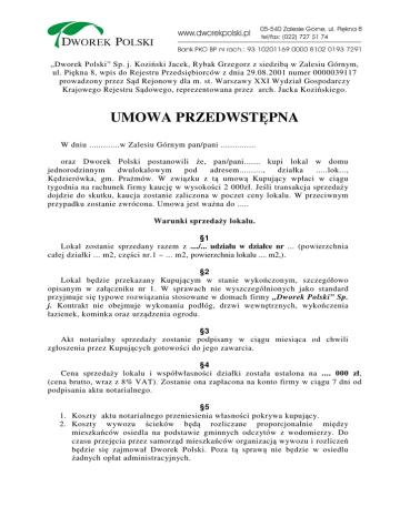 „Dworek Polski” Sp. j. Koziński Jacek, Rybak Grzegorz z siedzibą w Zalesiu Górnym, ul. Piękna 8, wpis do Rejestru Przedsiębiorców z dnia 29.08.2001 numer 0000039117 prowadzony przez Sąd Rejonowy dla m. st. Warszawy XXI Wydział Gospodarczy Krajowego Rejestru Sądowego, reprezentowana przez arch. Jacka Kozińskiego. UMOWA PRZEDWSTĘPNA W dniu .............w Zalesiu Górnym pan/pani ............... oraz Dworek Polski postanowili że, pan/pani....... kupi lokal w domu jednorodzinnym dwulokalowym pod adresem.........., działka .....lok..., Kędzierówka, gm. Prażmów. W związku z tą umową Kupujący wpłaci w ciągu tygodnia na rachunek firmy kaucję w wysokości 2 000zł. Jeśli transakcja sprzedaży dojdzie do skutku, kaucja zostanie zaliczona w poczet ceny lokalu. W przeciwnym przypadku zostanie zwrócona. Umowa jest ważna do ..... Warunki sprzedaży lokalu. §1 Lokal zostanie sprzedany razem z ..../... udziału w działce nr ... (powierzchnia całej działki ... m2, części nr.1 – ... m2, powierzchnia lokalu .... m2,). §2 Lokal będzie przekazany Kupującym w stanie wykończonym, szczegółowo opisanym w załączniku nr 1. W sprawach nie wyszczególnionych jako standard przyjmuje się typowe rozwiązania stosowane w domach firmy „Dworek Polski” Sp. j. Kontrakt nie obejmuje wykonania podłóg, drzwi wewnętrznych, wykończenia łazienek, kominka oraz urządzenia ogrodu. §3 Akt notarialny sprzedaży zostanie podpisany w ciągu miesiąca od chwili zgłoszenia przez Kupujących gotowości do jego zawarcia. §4 Cena sprzedaży lokalu i współwłasności działki została ustalona na .... 000 zł, (cena brutto, wraz z 8% VAT). Zostanie ona zapłacona na konto firmy w ciągu 7 dni od podpisania aktu notarialnego. §5 1. Koszty aktu notarialnego przeniesienia własności pokrywa kupujący. 2. Koszty wywozu ścieków będą rozliczane proporcjonalnie między mieszkańców osiedla na podstawie gminnych odczytów z wodomierzy. Do czasu przejęcia przez samorząd mieszkańców organizacją wywozu i rozliczeń będzie się zajmował Dworek Polski. Poza tą sprawą nie będzie w osiedlu żadnych opłat administracyjnych. §6 Dworek Polski udzieli na swoje prace rocznej gwarancji w zakresie prac wykończeniowych, 3 letniej w zakresie tych elementów lokalu, które mają wpływ na prawidłowe jego funkcjonowanie techniczne i 12 letniej w zakresie konstrukcji. §7 Dworek Polski oświadcza, że: 1. jest właścicielem przedmiotowej działki wpisanym do KW nr WA5M/00424925/0, 2. ustanowiona została służebność gruntowa dla Polenergia SA, polegająca na poprowadzeniu instalacji energetycznych w pasie ulicznym; 3. zostanie ustanowiona służebność gruntowa polegająca na poprowadzeniu instalacji telekomunikacyjnej przez ogródki. 4. dla inwestycji zostało wydane pozwolenie na budowę nr ... P/2011 z dnia 21.09.2011 5. tereny sąsiadujące przeznaczone są pod budownictwo jednorodzinne; 6. powierzchnie lokali zostały policzone wg PN-ISO 9836 (powierzchnia netto); 7. Dworek Polski sp.j jest członkiem Polskiego Związku Firm Deweloperskich, w konsekwencji podlega związkowym regułom Dobrych Praktyk; 8. W akcie notarialnym zostanie ustanowiona służebność dojścia i dojazdu po działce nr 261/35, co zapewni dostęp do drogi publicznej. §8 Powyższa umowa nie jest „umową deweloperską” w sensie ustawy z dnia 16 września 2011 „o ochronie praw nabywcy lokalu mieszkalnego lub domu jednorodzinnego”. Budowa przedmiotowego lokalu została ukończona, przy czym w procesie inwestycyjnym nie były zaangażowane środki finansowe klienta, co oznacza, że sprzedaż nie podlega regulacjom powyższej ustawy, lecz ogólnym przepisom Kodeksu Cywilnego. Kupujący Dworek Polski ZAŁĄCZNIK nr 1 Standardowe wykończenie lokalu Wnętrze: - podłogi: na parterze – szlichta cementowa, na piętrze - płyta OSB 15mm; w łazience na piętrze – dodatkowa płyta OSB 6mm; schodki wejściowe, taras ogrodowy (12 m2) - płyty z piaskowca Tumlin; - sufity: w części dziennej polakierowane belki, poszycie z płyt gipsowych, pozostałe pomieszczenia - płyty gipsowe malowane na biało (3 razy); - ściany od wnętrza: płyty gipsowe pomalowane farbą emulsyjną (3 razy) ; w pomieszczeniach mokrych na ścianach płyta wodoodporna; - drzwi zewnętrzne – drewniane, trójwarstwowe (2 cm styropianu); - okna drewniane, z okuciami obwiedniowymi, szklone niskoemisyjnymi szybami zespolonymi ; - elementy wykończenia (listwy, lamówki, parapety) drewniane, polakierowane; - schody wewnętrzne – stopnie z klejonego drewna jesionowego, policzki sosnowe, polakierowane; Elewacje zewnętrzne: - pokrycie dachu - gont bitumiczny; rynny - PCV; - ściany od strony zewnętrznej - tynk cementowo-wapienny na zbrojonych siatką płytach wiórowo-cementowych; - ogrody rozdzielone płotem z siatki; Instalacje wewnętrzne: - elektryczna (bez opraw oświetleniowych) przewody miedziane w podwójnej izolacji, prowadzone pod gipsem; norma - 1 punkt na 2.5 m 2 pow. podłogi; osprzęt typu Legrand, bez montażu gniazdek na glazurze; - kanalizacja - rury PCV; - wodna - rury polipropylenowe, bez montażu armatury; - CO – zbiornik ciepła zasilany kominkiem z płaszczem wodnym i dodatkowo elektrycznie, rury polipropylenowe; Na parterze, w strefie kuchni, sieni i łazienki ogrzewanie podłogowe, w pozostałych pomieszczeniach - grzejniki wodne (konwekcyjne); - ciepła woda – z systemu kolektorów słonecznych (2szt.) współpracującego z urządzeniem odzyskującym energię ze zużytej wody* , dodatkowo z wymiennika w zbiorniku ciepła. - TV – 1 punkt. Instalacje zewnętrzne: - elektryczna - kanalizacja - sieć osiedlowa, podłączona do centralnego zbiornika; - woda – z wodociągu gminnego; - w ulicach osiedlowa kanalizacja deszczowa. * pierwsze domy w osiedlu nie mają zamontowanej odzyskwy ściekowej.
