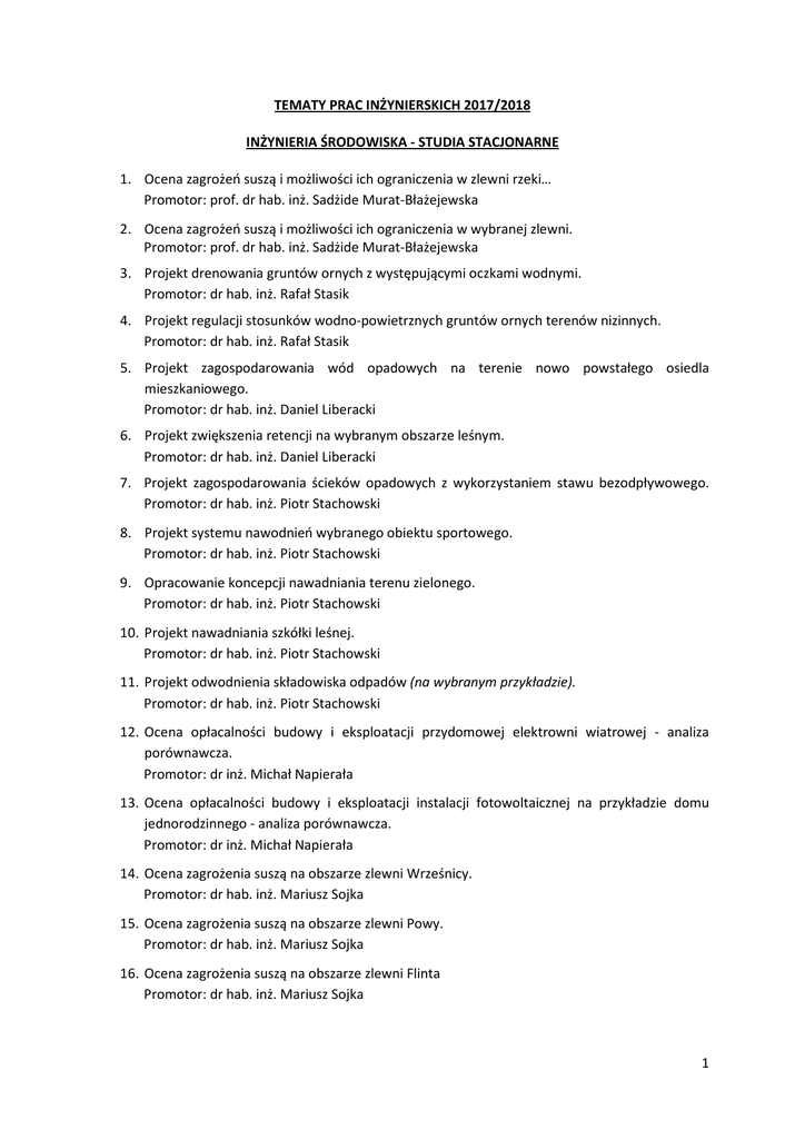 TEMATY PRAC INŻYNIERSKICH 2017/2018 INŻYNIERIA ŚRODOWISKA - STUDIA STACJONARNE 1. Ocena zagrożeń suszą i możliwości ich ograniczenia w zlewni rzeki… Promotor: prof. dr hab. inż. Sadżide Murat-Błażejewska 2. Ocena zagrożeń suszą i możliwości ich ograniczenia w wybranej zlewni. Promotor: prof. dr hab. inż. Sadżide Murat-Błażejewska 3. Projekt drenowania gruntów ornych z występującymi oczkami wodnymi. Promotor: dr hab. inż. Rafał Stasik 4. Projekt regulacji stosunków wodno-powietrznych gruntów ornych terenów nizinnych. Promotor: dr hab. inż. Rafał Stasik 5. Projekt zagospodarowania wód opadowych na terenie nowo powstałego osiedla mieszkaniowego. Promotor: dr hab. inż. Daniel Liberacki 6. Projekt zwiększenia retencji na wybranym obszarze leśnym. Promotor: dr hab. inż. Daniel Liberacki 7. Projekt zagospodarowania ścieków opadowych z wykorzystaniem stawu bezodpływowego. Promotor: dr hab. inż. Piotr Stachowski 8. Projekt systemu nawodnień wybranego obiektu sportowego. Promotor: dr hab. inż. Piotr Stachowski 9. Opracowanie koncepcji nawadniania terenu zielonego. Promotor: dr hab. inż. Piotr Stachowski 10. Projekt nawadniania szkółki leśnej. Promotor: dr hab. inż. Piotr Stachowski 11. Projekt odwodnienia składowiska odpadów (na wybranym przykładzie). Promotor: dr hab. inż. Piotr Stachowski 12. Ocena opłacalności budowy i eksploatacji przydomowej elektrowni wiatrowej - analiza porównawcza. Promotor: dr inż. Michał Napierała 13. Ocena opłacalności budowy i eksploatacji instalacji fotowoltaicznej na przykładzie domu jednorodzinnego - analiza porównawcza. Promotor: dr inż. Michał Napierała 14. Ocena zagrożenia suszą na obszarze zlewni Wrześnicy. Promotor: dr hab. inż. Mariusz Sojka 15. Ocena zagrożenia suszą na obszarze zlewni Powy. Promotor: dr hab. inż. Mariusz Sojka 16. Ocena zagrożenia suszą na obszarze zlewni Flinta Promotor: dr hab. inż. Mariusz Sojka 1 17. Ocena wpływu pokrycia terenu na zasoby wodne zlewni cieku… Promotor: dr hab. inż. Jolanta Kanclerz 18. Ocena wpływu pokrycia terenu na zasoby wodne zlewni cieku… Promotor: dr hab. inż. Jolanta Kanclerz 19. Projekt rozproszonej sieci pomiarowej, do monitoringu temperatury. Promotor: dr inż. Marek Urbaniak 20. Projekt samopoziomującego uchwytu dla pyranometru. Promotor: dr inż. Marek Urbaniak 21. Ocena funkcjonowania kolektora słoneczno-powietrznego Promotor: dr hab. inż. Jacek Leśny 22. Projekt muru oporowego w postaci ściany płytowo-żebrowej. Promotor: dr inż. Sławomir Gogolik 23. Projekt ścianki szczelnej swobodnie podpartej, jednokrotnie zakotwionej. Promotor: dr inż. Sławomir Gogolik 24. Projekt posadowienia pośredniego stopy fundamentowej na podstawie badań CPTU. Promotor: dr inż. Sławomir Gogolik 25. Analiza stateczności zapory czołowej zbiornika retencyjnego Maleszów. Promotor: dr inż. Sławomir Gogolik 26. Projekt cylindrycznego zbiornika żelbetowego na ciecze. Promotor: dr inż. Jacek Mądrawski 27. Projekt termomodernizacji budynku jednorodzinnego. Promotor: dr inż. Jacek Mądrawski 28. Wpływ ilości cykli zamarzania na drobnoziarnistych. Promotor: dr inż. Katarzyna Stefaniak wybrane właściwości mechaniczne gruntów 29. Ocena przydatności gruntów pylastych w budownictwie ziemnym. Promotor: dr inż. Katarzyna Stefaniak 30. Ocena wpływu zawartości frakcji piaskowej w gruntach pylastych na wartość modułu odkształcenia wyznaczonego w badaniu edometrycznym. Promotor: dr inż. Katarzyna Stefaniak 31. Termorenowacja obiektów zabytkowych. Promotor: dr inż. Anna Smoczkiewicz-Wojciechowska 32. Ograniczenie zużycia energii cieplnej przez optymalny dobór warstwy izolacyjnej. Promotor: dr inż. Anna Smoczkiewicz-Wojciechowska 33. Modernizacja systemu klimatyzacji dla wybranego Promotor: dr inż. Anna Smoczkiewicz-Wojciechowska obiektu budowlanego. 34. Projekt konstrukcji stalowej salonu samochodowego. Promotor: dr inż. Anna Szymczak-Graczyk 35. Opracowanie metody ustalania składu zapraw z zawartością wybranych odpadów recyklingowych w zależności od zadanej konsystencji. Promotor: dr inż. Daniel Zawal 36. Optymalizacja składu zaprawy z udziałem zmiennego udziału frakcji kruszyw recyklingowych i różnych rodzajów cementu. 2 Promotor: dr inż. Daniel Zawal 37. Wybrane badania właściwości cementogruntów z dodatkiem mineralnych materiałów odpadowych. Promotor: dr inż. Krzysztof Górski 38. Wybrane badania cementogruntów modyfikowanych kruszywem recyklingowym. Promotor: dr inż. Krzysztof Górski 39. Wybrane badania właściwości cementogruntów modyfikowanych kruszywem z odpadów przemysłowych poddawanych obróbce termicznej. Promotor: dr inż. Krzysztof Górski 40. Wymiarowanie wybranych elementów przeznaczonego pod działalność hodowlaną. Promotor: dr inż. Krzysztof Górski konstrukcyjnych obiektu gospodarczego 41. Wymiarowanie pali fundamentowych na podstawie wyników testu statycznego sondowania. Promotor: prof. dr hab. inż. Wojciech Tschuschke 42. Wykorzystanie sondy ADCP Stream Pro do pomiarów rozdziału przepływu i batymetrii węzła wodnego w Śremie. Promotor: dr inż. Ireneusz Laks 43. Wykorzystanie zdjęć cyfrowych obiektów hydrotechnicznych do określania ich wymiarów geometrycznych na przykładzie mostów zlokalizowanych w obrębie Poznańskiego Węzła Wodnego. Promotor: dr inż. Ireneusz Laks 44. Kalibracja systemu kontroli jakości wody wodociągowej SYMBIO w odniesieniu substancji toksycznych. Promotor: prof. dr hab. Krzysztof Szoszkiewicz 45. Koncepcja renaturyzacji wybranego odcinka rzecznego. Promotor: prof. dr hab. Krzysztof Szoszkiewicz 46. Ocena wykorzystania roślinności jako płaszcza ekologicznego budynku. Promotor: dr hab. Maria Drapikowska 47. Zieleń miejska w ekosystemie aglomeracji poznańskiej. Promotor: dr hab. Maria Drapikowska 48. Koncepcja poprawy stanu ekologicznego jeziora (do ustalenia) Promotor: dr hab. inż. Agnieszka Ławniczak 49. Koncepcja poprawy p