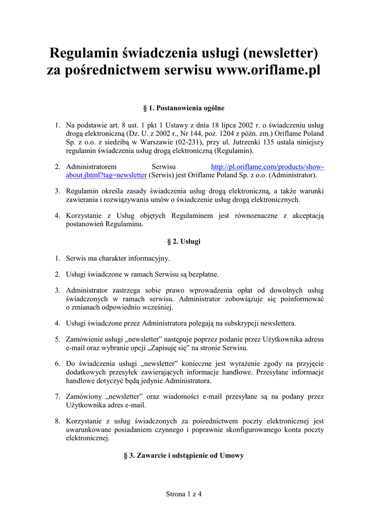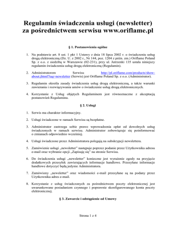 Regulamin świadczenia usługi (newsletter) za pośrednictwem serwisu www.oriflame.pl § 1. Postanowienia ogólne 1. Na podstawie art. 8 ust. 1 pkt 1 Ustawy z dnia 18 lipca 2002 r. o świadczeniu usług drogą elektroniczną (Dz. U. z 2002 r., Nr 144, poz. 1204 z późn. zm.) Oriflame Poland Sp. z o.o. z siedzibą w Warszawie (02-231), przy ul. Jutrzenki 135 ustala niniejszy regulamin świadczenia usług drogą elektroniczną (Regulamin). 2. Administratorem Serwisu http://pl.oriflame.com/products/showabout.jhtml?tag=newsletter (Serwis) jest Oriflame Poland Sp. z o.o. (Administrator). 3. Regulamin określa zasady świadczenia usług drogą elektroniczną, a także warunki zawierania i rozwiązywania umów o świadczenie usług drogą elektronicznych. 4. Korzystanie z Usług objętych Regulaminem jest równoznaczne z akceptacją postanowień Regulaminu. § 2. Usługi 1. Serwis ma charakter informacyjny. 2. Usługi świadczone w ramach Serwisu są bezpłatne. 3. Administrator zastrzega sobie prawo wprowadzenia opłat od dowolnych usług świadczonych w ramach serwisu. Administrator zobowiązuje się poinformować o zmianach odpowiednio wcześniej. 4. Usługi świadczone przez Administratora polegają na subskrypcji newslettera. 5. Zamówienie usługi „newsletter” następuje poprzez podanie przez Użytkownika adresu e-mail oraz wybranie opcji „Zapisuję się” na stronie Serwisu. 6. Do świadczenia usługi „newsletter” konieczne jest wyrażenie zgody na przyjęcie dodatkowych przesyłek zawierających informacje handlowe. Przesyłane informacje handlowe dotyczyć będą jedynie Administratora. 7. Zamówiony „newsletter” oraz wiadomości e-mail przesyłane są na podany przez Użytkownika adres e-mail. 8. Korzystanie z usług świadczonych za pośrednictwem poczty elektronicznej jest uwarunkowane posiadaniem czynnego i poprawnie skonfigurowanego konta poczty elektronicznej. § 3. Zawarcie i odstąpienie od Umowy Strona 1 z 4 1. Umowa o świadczenie usług drogą elektroniczną zostaje zawarta z chwilą rozpoczęcia przez Użytkowników korzystania z usług świadczonych przez Administratora, zgodnie z § 2 ust. 5 i ust. 6. 2. Umowa zostaje zawarta na czas nieoznaczony. 3. Każda ze stron może rozwiązać Umowę o świadczenie usług drogą elektroniczną bez podania przyczyn i w trybie natychmiastowym 4. Administrator rozwiązuje Umowę w przedmiocie usługi „newsletter” poprzez usunięcie konta użytkownika i powiadomienie go o tym fakcie drogą elektroniczną. 5. Użytkownik rozwiązuje Umowę w przedmiocie usługi „newsletter” poprzez kliknięcie na link w tekście „Jeżeli nie chcesz więcej otrzymywać informacji od nas, kliknij - ten link.” znajdującym się w końcowej części e-maila. Następnie należy potwierdzić rozwiązanie Umowy klikając na link w wiadomości, która zostanie wysłana, aby potwierdzić chęć wypisania się z listy „newsletter”. § 4. Zastrzeżenia dotyczące wykonania zamówionej Usługi 1. Administrator nie ponosi odpowiedzialności za brak możliwości dostępu do Serwisu wynikający z przyczyn od Administratora niezależnych. 2. Administrator zastrzega sobie prawo do krótkiej przerwy technicznej w funkcjonowaniu witryny Serwisu w przypadku planowanej, bieżącej obsługi i konserwacji serwera oraz oprogramowania Serwisu. 3. Administrator nie ponosi odpowiedzialności za skutki zastosowania się do informacji zamieszczonych w Serwisie lub posłużenia się wzorami udostępnianych dokumentów. § 5. Dane osobowe 1. Administratorem danych osobowych jest Oriflame Poland Sp. z o. o. z siedzibą w Warszawie (02 – 231) przy ul. Jutrzenki 135. 2. Dane osobowe będą przetwarzane w celu realizacji usługi wysyłki newslettera zawierającego informacje marketingowe produktów i usług Oriflame Poland Sp. z o.o. 3. Zbiór danych osobowych został zarejestrowany w biurze Generalnego Inspektora Ochrony Danych Osobowych. 4. Użytkownik ma prawo dostępu do treści swoich danych oraz ich poprawiania. Podanie danych osobowych przez Użytkownika jest dobrowolne, ale niezbędne do wykonania w/w celu. 5. Podane przez Użytkownika dane osobowe mogą być przetwarzane dla celów marketingowych jedynie przez Administratora. 6. Dane osobowe będą udostępnianie podmiotom upoważnionym na podstawie przepisów prawa. Strona 2 z 4 7. Administrator zapewnia Użytkownikom możliwość usunięcia swoich danych z bazy danych. Aby zapobiec powtórnej rejestracji osobom, których konta zostały zablokowane ze względu na niedozwolone korzystanie usług Serwisu Administrator może odmówić usunięcia danych. 8. W przypadku jakiekolwiek pytań dotyczących zasad zachowania poufności, praktyk stosowanych w Serwisie bądź korzystania z usług, prosimy o kontakt: [email protected]. 9. Dane osobowe Użytkowników są przechowywane w bazie danych, w której zastosowano środki techniczne i organizacyjne zapewniające ochronę przetwarzanych danych zgodne z wymaganiami określonymi w przepisach o ochronie danych osobowych, w tym rozporządzenia Ministra Spraw Wewnętrznych i Administracji z dnia 29 kwietnia 2004 r. w sprawie dokumentacji przetwarzania danych osobowych oraz warunków technicznych i organizacyjnych, jakim powinny odpowiadać urządzenia i systemy informatyczne służące do przetwarzania danych osobowych (Dz. U. Nr 100, poz. 1024) oraz wytycznymi Generalnego Inspektora Ochrony Danych Osobowych. Dostęp do bazy mają jedynie osoby, posiadające upoważnienia nadane przez Administratora. 10. Administrator prowadzi statystyki i badania dotyczące Usługi, ruchu w sieci. Mogą być one używane i wymieniane z podmiotami trzecimi, jednak żadne z tych statystyk nie zawierają jakichkolwiek danych osobowych Użytkowników. 11. Administrator nie odpowiada za politykę prywatności stron internetowych, do których odnośniki umieszczone są na stronach Serwisu. 12. W Serwisie wykorzystywane są pliki "cookies" w celu nawiązania i utrzymania sesji u