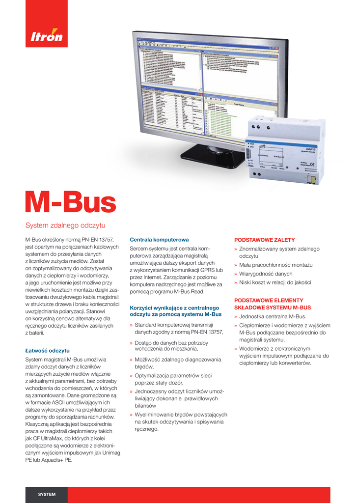 M-Bus System zdalnego odczytu M-Bus określony normą PN-EN 13757, jest opartym na połączeniach kablowych systemem do przesyłania danych z liczników zużycia mediów. Został on zoptymalizowany do odczytywania danych z ciepłomierzy i wodomierzy, a jego uruchomienie jest możliwe przy niewielkich kosztach montażu dzięki zastosowaniu dwużyłowego kabla magistrali w strukturze drzewa i braku konieczności uwzględniania polaryzacji. Stanowi on korzystną cenowo alternatywę dla ręcznego odczytu liczników zasilanych z baterii. Łatwość odczytu System magistrali M-Bus umożliwia zdalny odczyt danych z liczników mierzących zużycie mediów włącznie z aktualnymi parametrami, bez potrzeby wchodzenia do pomieszczeń, w których są zamontowane. Dane gromadzone są w formacie ASCII umożliwiającym ich dalsze wykorzystanie na przykład przez programy do sporządzania rachunków. Klasyczną aplikacją jest bezpośrednia praca w magistrali ciepłomierzy takich jak CF UltraMax, do których z kolei podłączone są wodomierze z elektronicznym wyjściem impulsowym jak Unimag PE lub Aquadis+ PE. SYSTEM Centrala komputerowa PODSTAWOWE ZALETY Sercem systemu jest centrala komputerowa zarządzająca magistralą umożliwiająca dalszy eksport danych z wykorzystaniem komunikacji GPRS lub przez Internet. Zarządzanie z poziomu komputera nadrzędnego jest możliwe za pomocą programu M-Bus Read. »» Znormalizowany system zdalnego odczytu Korzyści wynikające z centralnego odczytu za pomocą systemu M-Bus »» Standard komputerowej transmisji danych zgodny z normą PN-EN 13757, »» Dostęp do danych bez potrzeby wchodzenia do mieszkania, »» Możliwość zdalnego diagnozowania błędów, »» O ptymalizacja parametrów sieci poprzez stały dozór, »» Jednoczesny odczyt liczników umożliwiający dokonanie prawidłowych bilansów »» W yeliminowanie błędów powstających na skutek odczytywania i spisywania ręcznego. »» Mała pracochłonność montażu »» Wiarygodność danych »» Niski koszt w relacji do jakości PODSTAWOWE ELEMENTY SKŁADOWE SYSTEMU M-BUS »» Jednostka centralna M-Bus. »» Ciepłomierze i wodomierze z wyjściem M-Bus podłączane bezpośrednio do magistrali systemu. »» Wodomierze z elektronicznym wyjściem impulsowym podłączane do ciepłomierzy lub konwerterów. PODSTAWOWE ELEMENTY SKŁADOWE SYSTEMU M-BUS »» Jednostka centralna M-Bus. »» Ciepłomierze i wodomierze z wyjściem M-Bus podłączane bezpośrednio do magistrali systemu. »» Wodomierze z elektronicznym wyjściem impulsowym podłączane do ciepłomierzy lub konwerterów. Pozostałe atuty CF UltraMax »» Wieloletnia praca z zachowaniem stabilności metrologicznej (pozytywna wtórna legalizacja) »» Możliwość pracy w układach klimatyzacji i dualnych (ogrzewanie / chłodzenie) »» Możliwość analizy parametrów sieci za pomocą wbudowanego rejestratora »» Wersja z odczytem radiowym w dwukierunkowym systemie inkasenckim lub stacjonarnym »» Złącze optyczne w standardzie »» Interfejs M-Bus • Przesyłanie aktualnych wartości zużycia (opcjonalnie także dla wodomierzy) • Przesyłanie aktualnych danych serwisowych • Przesyłanie numeru licznika, kodu błędu i czasu trwania awarii • 18 miesięczny rejestr stanu wartości energii na koniec miesiąca »» Stan liczników wody (1 do 4) na koniec roku rozliczeniowego Napięcie zasilania 3,6 V Wejścia impulsowe styk zwarty (R ≤ 500) st yk rozwar t y (R ≥ 1M) maksymalna częstotliwość impulsów 0,25 Hz CF UltraMax CF 55 CIEPŁOMIERZE Z PRZELICZNIKAMI CF 51 I CF 55 Dane w ramce standardowej możliwe do odczytania za pomocą M-Bus Ciepłomierze ultradźwiękowe oraz mechaniczne oparte na przelicznikach wskazujących CF51 oraz CF55 dostępne są w zakresie przepływów nominalnych od qp 0,6 do qp 400 m3/h. CF 51 i CF 55 można w każdej chwili wyposażyć w opcjonalną kartę M-Bus z możliwością podłączenia do 2 dodatkowych wodomierzy (250, 100, 25, 10, 2.5 lub 1L/imp.), jak również w karty LON, radiowe i inne. Za pomocą systemu M-Bus i interfejsu optycznego dostępne są zaawansowane funkcje umożliwiające odczyt wszystkich danych potrzebnych do analizy i kontroli sieci. Wykorzystuje się je najczęściej w węzłach cieplnych. »» Numer producenta »» Energia cieplna »» Objętość »» Moc cieplna »» Przepływ »» Temperatura zasilania i powrotu »» Różnica temperatur »» Aktualna data »» Czas pracy »» Numer wersji »» Kod alarmu Przykładowe inne dane możliwe do zdalnego odczytu: »» Aktualne wartości zużycia z dodatkowych wodomierzy »» Energia chłodzenia »» Energia II taryfy »» 13 miesięczny rejestr stanu wartości energii, zużycia wody z wodomierzy 1 do 2 oraz wartości maksymalnych (moc, przepływ, temperatura) Istnieje również możliwość zabudowy wewnątrz przelicznika karty GPRS Cmi 2130, która pozwala przesyłać dane z ciepłomierza poprzez sieć GSM na adres e-mail, serwer ftp lub stronę http. Konfigurację karty dokonuje się wysyłając SMSy z telefonu komórkowego, a dzięki temu, że karta ma złącze M-Bus ciepłomierz może pełnić funkcję centrali dla dodatkowych 8 urządzeń. »» Rejestr alarmów z czasem ich wystąpienia PADPULS M2 - MODUŁ KONWERTERA 2 WEJŚCIA IMPULSOWE / M-BUS W przypadku sieci M-Bus, która w swojej strukturze zawiera oprócz liczników ciepła i wody także liczniki innych mediów takie jak gazomierze i liczniki energi elektryznej, można zastosować moduł PadPuls M2. Liczy on impulsy wysyłane z modułów impulsujących zamontowanych na licznikach mediów. Do modułu można dołączyć do 2 zewnętrznych urządzeń, przy czym każde z wejść może być skonfigurowane dla innego medium (różne jednostki) i stanowi osobny adres magistrali M-Bus. Napięcie zasilania Wejścia impulsowe wykorzystywane jest napięcie sieci M-Bus, w przypadku awarii zasilania wykorzystywana jest wewnętrzna bateria 3V styk zwarty (R ≤ 2 k Ω) styk rozwarty (R