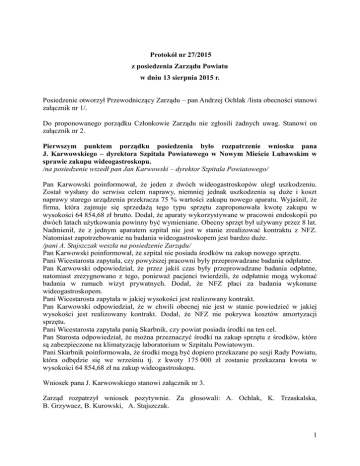 Protokół nr 27/2015 z posiedzenia Zarządu Powiatu w dniu 13 sierpnia 2015 r. Posiedzenie otworzył Przewodniczący Zarządu – pan Andrzej Ochlak /lista obecności stanowi załącznik nr 1/. Do proponowanego porządku Członkowie Zarządu nie zgłosili żadnych uwag. Stanowi on załącznik nr 2. Pierwszym punktem porządku posiedzenia było rozpatrzenie wniosku pana J. Karwowskiego – dyrektora Szpitala Powiatowego w Nowym Mieście Lubawskim w sprawie zakupu wideogastroskopu. /na posiedzenie wszedł pan Jan Karwowski – dyrektor Szpitala Powiatowego/ Pan Karwowski poinformował, że jeden z dwóch wideogastroskopów uległ uszkodzeniu. Został wysłany do serwisu celem naprawy, niemniej jednak uszkodzenia są duże i koszt naprawy starego urządzenia przekracza 75 % wartości zakupu nowego aparatu. Wyjaśnił, że firma, która zajmuje się sprzedażą tego typu sprzętu zaproponowała kwotę zakupu w wysokości 64 854,68 zł brutto. Dodał, że aparaty wykorzystywane w pracowni endoskopii po dwóch latach użytkowania powinny być wymieniane. Obecny sprzęt był używany przez 8 lat. Nadmienił, że z jednym aparatem szpital nie jest w stanie zrealizować kontraktu z NFZ. Natomiast zapotrzebowanie na badania wideogastroskopem jest bardzo duże. /pani A. Stajszczak weszła na posiedzenie Zarządu/ Pan Karwowski poinformował, że szpital nie posiada środków na zakup nowego sprzętu. Pani Wicestarosta zapytała, czy powyższej pracowni były przeprowadzane badania odpłatne. Pan Karwowski odpowiedział, że przez jakiś czas były przeprowadzane badania odpłatne, natomiast zrezygnowano z tego, ponieważ pacjenci twierdzili, że odpłatnie mogą wykonać badania w ramach wizyt prywatnych. Dodał, że NFZ płaci za badania wykonane wideogastroskopem. Pani Wicestarosta zapytała w jakiej wysokości jest realizowany kontrakt. Pan Karwowski odpowiedział, że w chwili obecnej nie jest w stanie powiedzieć w jakiej wysokości jest realizowany kontrakt. Dodał, że NFZ nie pokrywa kosztów amortyzacji sprzętu. Pani Wicestarosta zapytała panią Skarbnik, czy powiat posiada środki na ten cel. Pan Starosta odpowiedział, że można przeznaczyć środki na zakup sprzętu z środków, które są zabezpieczone na klimatyzację laboratorium w Szpitalu Powiatowym. Pani Skarbnik poinformowała, że środki mogą być dopiero przekazane po sesji Rady Powiatu, która odbędzie się we wrześniu tj. z kwoty 175 000 zł zostanie przekazana kwota w wysokości 64 854,68 zł na zakup wideogastroskopu. Wniosek pana J. Karwowskiego stanowi załącznik nr 3. Zarząd rozpatrzył wniosek pozytywnie. Za głosowali: A. Ochlak, K. Trzaskalska, B. Grzywacz, B. Kurowski, A. Stajszczak. 1 Pan Kurowski zapytał pana Karwowskiego, czy w przychodni „Nad Jesionką” w Lubawie są realizowane usługi odpłatnie. Pan Karwowski odpowiedział, że m.in. są również realizowane usługi odpłatne. W ramach kontraktu jest obsługiwana poradnia chirurgiczna. Pan Kurowski zapytał, gdzie są przekazywane środki z odpłatnych usług. Pan Karwowski odpowiedział, że środki są przekazywane na Szpital Powiatowy w Nowym Mieście Lubawskim. Dodał, że wszystkie usługi w przychodni są realizowane w ramach Szpitala Powiatowego, nie ma wykonywanych usług w ramach prywatnej praktyki lekarskiej. /pan J. Karwowski opuścił posiedzenie Zarządu/ Drugim punktem porządku posiedzenia było podjęcie uchwały Zarządu Powiatu w sprawie przystąpienia do projektu pt. „Aktywizacja osób w wieku 30 lat i powyżej pozostających bez pracy w powiecie nowomiejskim (I)” współfinansowanego przez Unię Europejską ze środków Europejskiego Funduszu Społecznego w ramach Regionalnego Programu Operacyjnego Województwa Warmińsko – mazurskiego 2014-2020 oraz upoważnienia Dyrektora Powiatowego Urzędu Pracy w Nowym Mieście Lubawskim. /na posiedzenie wszedł pan Tomasz Rafalski – dyrektor PUP/ Pan Rafalski zapoznał Członków Zarządu z danymi o stanie bezrobocia w powiecie nowomiejskim. Dodał, że projekt o którym mowa w uchwale nie został jeszcze ogłoszony. Natomiast PUP posiada zgodę Wojewódzkiego Urzędu Pracy na rozpoczęcie działań w zakresie realizacji w/w projektu. Wyjaśnił, że trwa nabór wniosków na staże, prace interwencyjne, szkolenia indywidualne, rozpoczęcie działalności gospodarczej oraz doposażenia i stworzenia stanowisk pracy. Ponadto dodał, że są zabezpieczone środki z rezerwy na aktywizację osób do 30 roku życia. Pan Rafalski poinformował, że jednostka będzie wdrażać programy specjalne tzn. będzie aktywizować bezrobotnych w ramach trzeciego profilu, czyli osóby których do tej pory nie można było zaktywizować. Wyjaśnił, że środki z programów specjalnych będzie można przeznaczyć np. na roboty publiczne w wysokości 80% środków, natomiast 20 % środków będzie można przeznaczyć na dofinansowanie do żłobka, przedszkola lub opiekunki w kwocie ok. 200 zł miesięcznie przez okres dziewięciu miesięcy. Ponadto dodał, że środki można również przeznaczyć na zakup skutera dla osób, które nie mogą dojechać do pracy. Pan Rafalski poinformował, że jednostka nie otrzyma środków w wysokości 2% premii dla urzędów pracy przyznawanych przez Ministerstwo Pracy i Polityki Społecznej. Wyjaśnił, że premia nie została przyznana, ponieważ jednostka m.in. nie posiada wystarczającej liczby pracowników zatrudnionych na stanowisku doradcy klienta oraz wykazuje niezadowalający wskaźnik dotyczący stopy bezrobocia. Pan Starosta zapytał czy w poprzednich latach jednostka otrzymywała środki z Ministerstwa Pracy i Polityki Społecznej. Pan Rafalski odpowiedział, że po raz pierwszy środki były przyznane z ministerstwa w ubiegłym roku. Wcześniej jednostka nie spełniała wymogów określonych przez ministerstwo. Pani Skarbnik zapytała, jaki jest procent finansowania projektu ze środków Unii Europejskiej. Pan Rafalski odpowiedział, że na realizacj