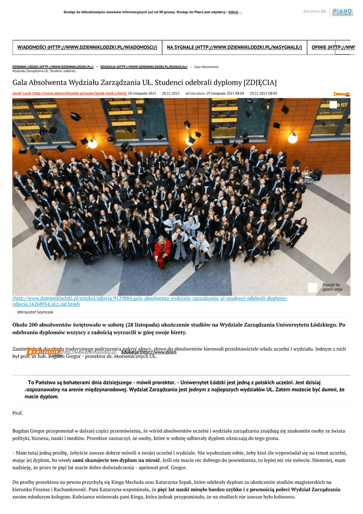 ZALOGUJ SIĘ Dostęp do kilkudziesięciu serwisów informacyjnych już od 90 groszy. Dostęp do Piano jest odpłatny kliknij (https://www.pianomedi WIADOMOŚCI (HTTP://WWW.DZIENNIKLODZKI.PL/WIADOMOSCI/) DZIENNIK ŁÓDZKI (HTTP://WWW.DZIENNIKLODZKI.PL/) Wydziału Zarządzania UŁ. Studenci odebrali... NA SYGNALE (HTTP://WWW.DZIENNIKLODZKI.PL/NASYGNALE/) EDUKACJA (HTTP://WWW.DZIENNIKLODZKI.PL/EDUKACJA/) OPINIE (HTTP://WWW.D Gala Absolwenta Gala Absolwenta Wydziału Zarządzania UŁ. Studenci odebrali dyplomy [ZDJĘCIA] Jacek Losik (http://www.dzienniklodzki.pl/autor/jacek-losik,s.html) 28 listopada 2015 28.11.2015 AKTUALIZACJA: 29 listopada 2015 08:04 29.11.2015 08:04 1/42 Przejdź do galerii zdjęć (http://www.dzienniklodzki.pl/artykul/zdjecia/9129884,gala-absolwenta-wydzialu-zarzadzania-ul-studenci-odebrali-dyplomyzdjecia,16268954,id,t,zid.html) ©Krzysztof Szymczak Około 200 absolwentów świętowało w sobotę (28 listopada) ukończenie studiów na Wydziale Zarządzania Uniwersytetu Łódzkiego. Po odebraniu dyplomów wszyscy z radością wyrzucili w górę swoje birety. Zanim jednak doszło do tradycyjnego podrzucenia nakryć głowy, słowo do absolwentów kierowali przedstawiciele władz uczelni i wydziału. Jednym z nich (http://www.dzienniklodzki.pl) Edukacja (http://www.dzienniklodzki.pl/edukacja/) był prof. dr hab. Bogdan Gregor - prorektor ds. ekonomicznych UŁ. - To Państwo są bohaterami dnia dzisiejszego - mówił prorektor. - Uniwersytet Łódzki jest jedną z polskich uczelni. Jest dzisiaj rozpoznawalny na arenie międzynarodowej. Wydział Zarządzania jest jednym z najlepszych wydziałów UŁ. Zatem możecie być dumni, że macie dyplom. Prof. Bogdan Gregor przypomniał w dalszej części przemówienia, że wśród absolwentów uczelni i wydziału zarządzania znajdują się znakomite osoby ze świata polityki, biznesu, nauki i mediów. Prorektor zaznaczył, że osoby, które w sobotę odbierały dyplom wkraczają do tego grona. - Mam tutaj jedną prośbę, żebyście zawsze dobrze mówili o swojej uczelni i wydziale. Nie wyobrażam sobie, żeby ktoś źle wypowiadał się na temat uczelni, mając jej dyplom, bo wtedy sami skazujecie ten dyplom na nicość. Jeśli nie macie nic dobrego do powiedzenia, to lepiej nic nie mówcie. Niemniej, mam nadzieję, że przez te pięć lat macie dobre doświadczenia - apelował prof. Gregor. Do prośby prorektora na pewno przychylą się Kinga Mechuła oraz Katarzyna Szpak, które odebrały dyplom za ukończenie studiów magisterskich na kierunku Finanse i Rachunkowość. Pani Katarzyna wspominała, że pięć lat nauki minęło bardzo szybko i z pewnością poleci Wydział Zarządzania swoim młodszym kolegom. Koleżance wtórowała pani Kinga, która jednak przypominała, że na studiach nie zawsze było kolorowo. - Wiadomo, że w ciągu tych pięciu lat były wzloty i upadki. Niełatwym wyzwaniem był np. rachunek kosztów u profesora Wnuka. Było bardzo dużo materiału, a sam egzamin, składający się z czterech zadań trwał cztery godziny - mówi Kinga Mechuła. - Jednak, gdy dzisiaj odbieramy ten dyplom, to czujemy pewien smutek. Podczas uroczystości, oprócz dyplomów, wręczono m.in. nagrody i wyróżnienia za wyjątkowe osiągnięcia w nauce oraz najlepsze prace magisterskie. Wybrano również najlepszych wykładowców. W kategorii "milard w w rozumie" wygrał prof. Robert Kozielski. "Sprawiedliwym wykładowcą" została dr Barbara Ocicka. W kategorii "zawsze dla nas" wybrano dr Jolantę Bieńkowską. "Ikoną wydziału" okrzyknięto natomiast prof. Ewę Śnieżek. Laureatami nagrody specjalnej zostali prof. Ewa Śnieżek i prof. Tomasz Czapla. O tym mówiło się w Łodzi i w regionie w ubiegłym tygodniu (http://www.dzienniklodzki.pl/artykul/zdjecia/9109962,najwazniejsze-wydarzenia-tygodnia-wlodzi-i-w-regionie-16-22-listopada,16221078,id,t,zid.html) (http://ksiegarnia.dzienniklodzki.pl) -30% -25% -30% Wesoła zima Kraina Lodu. Opowieść filmowa Krew na śniegu / Więcej krwi 1,75 zł PRACA ZBIOROWA JO NESBO 18,74 zł 38,43 zł TAGI: 2,50 zł Uniwersytet Łódzki (/tag/uniwersytet-lodzki.html) zarządzanie uł (/tag/zarzadzanie-ul.html) Lubię to! 12 0 24,99 zł Wydział Zarządzania UŁ (/tag/wydzial-zarzadzania-ul.html) studenci zarządzania (/tag/studenci-zarzadzania.html) 54,90 zł studia Łódź (/tag/studia-lodz.html) wiadomosci łódź (/tag/wiadomosci-lodz.html) odebranie dyplomów uł (/tag/odebranie-dyplomow-ul.html) Tweetnij Czytaj także Ksiądz z Szadku skazany na grzywnę za kradzież aparatu fotograficznego Ledowe czy Zostałeś tymczasowo tradycyjne? Szukamy zablokowany odpowiedniego oświetlenia do domu i biura Sponsorowane Janusz Baranowski, były prezes Westy, chce 20 mln zł od Skarbu Państwa Rewitalizacja kamienic w Łodzi. Nie ma gdzie wyprowadzić lokatorów: "Pieniędzy starczy na 60 lokali" (http://www.dzienniklodzki.pl/artykul/9134194,ksiadz(//emisja.contentstream.pl/_/ctr/? (http://www.dzienniklodzki.pl/artykul/9133576,laureaci(http://www.dzienniklodzki.pl/artykul/9140258,janusz(http://www.dzienniklodzki.pl/artykul/9139638,rewitalizacja(http://contentstream.pl/related-content/) z-szadku-skazany-na- p=0&vt=B&mob=f&u=http%3A%2F%2Fwww.polskatimes.pl%2Fartykul%2F9105994%2Ctradycyjne5baranowski-bylykamienic-w-lodzigrzywne-za-kradziezzarowki-to-juzmiedzynarodowegoprezes-westy-chcenie-ma-gdzieaparatuprzeszlosc%2Cid%2Ct.html&e=G5LA324KdUYTykonkursu20-mln-zl-od-skarbuwyprowadzicKomentarze fotograficznego,id,t.html) 7UakxmKg718s_k7pG62tFhpl4SBeeYzIQ_51zQ4lpkompozytorskiegopanstwa,id,t.html) lokatorow-pieniedzyQaId28ammmI-HYim-grazynystarczy-na-60oL7RIM8m9p3qMbpICaGmJqHO8vPO9i1U4COCfgWUUA83wJUpShiof1vDFzqXGOMpcFxoMAxLeO7ShY3v31GOF7VzFSP1h63ze2fb9yQPdZei4LpdbSP2ixHO7oA1 bacewicz,id,t.html) lokali,id,t.html) UvzOTfFP790HByiIwdtJJ-