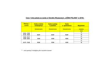Cena 1 dnia pobytu za osobę w Ośrodku Wczasowym „LEŚNA POLANA” w 2016r. Osoba w domku campingowym Osoba w pokoju w pawilonie Osoba w apartamencie Zakwaterowanie Zakwaterowanie Zakwaterowanie 30.04 – 15.06 01.09 – 30.09 30.00* 45.00* 50.00* 16.06 – 01.07 16.08 - 30.08 38.00 50.00 60.00 01.07 – 15.08 40.00 55.00 65.00 Miesiąc / termin * - cena poniżej 2 noclegów jak w wysokim sezonie Wyżywienie: śniadanie obiad 11 19 11 19 11 19