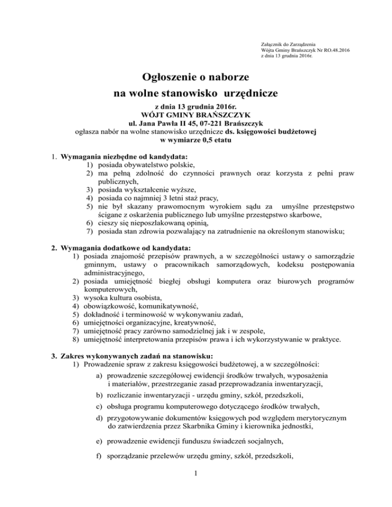 Załącznik do Zarządzenia Wójta Gminy Brańszczyk Nr RO.48.2016 z dnia 13 grudnia 2016r. Ogłoszenie o naborze na wolne stanowisko urzędnicze z dnia 13 grudnia 2016r. WÓJT GMINY BRAŃSZCZYK ul. Jana Pawła II 45, 07-221 Brańszczyk ogłasza nabór na wolne stanowisko urzędnicze ds. księgowości budżetowej w wymiarze 0,5 etatu 1. Wymagania niezbędne od kandydata: 1) posiada obywatelstwo polskie, 2) ma pełną zdolność do czynności prawnych oraz korzysta z pełni praw publicznych, 3) posiada wykształcenie wyższe, 4) posiada co najmniej 3 letni staż pracy, 5) nie był skazany prawomocnym wyrokiem sądu za umyślne przestępstwo ścigane z oskarżenia publicznego lub umyślne przestępstwo skarbowe, 6) cieszy się nieposzlakowaną opinią, 7) posiada stan zdrowia pozwalający na zatrudnienie na określonym stanowisku; 2. Wymagania dodatkowe od kandydata: 1) posiada znajomość przepisów prawnych, a w szczególności ustawy o samorządzie gminnym, ustawy o pracownikach samorządowych, kodeksu postępowania administracyjnego, 2) posiada umiejętność biegłej obsługi komputera oraz biurowych programów komputerowych, 3) wysoka kultura osobista, 4) obowiązkowość, komunikatywność, 5) dokładność i terminowość w wykonywaniu zadań, 6) umiejętności organizacyjne, kreatywność, 7) umiejętność pracy zarówno samodzielnej jak i w zespole, 8) umiejętność interpretowania przepisów prawa i ich wykorzystywanie w praktyce. 3. Zakres wykonywanych zadań na stanowisku: 1) Prowadzenie spraw z zakresu księgowości budżetowej, a w szczególności: a) prowadzenie szczegółowej ewidencji środków trwałych, wyposażenia i materiałów, przestrzeganie zasad przeprowadzania inwentaryzacji, b) rozliczanie inwentaryzacji - urzędu gminy, szkół, przedszkoli, c) obsługa programu komputerowego dotyczącego środków trwałych, d) przygotowywanie dokumentów księgowych pod względem merytorycznym do zatwierdzenia przez Skarbnika Gminy i kierownika jednostki, e) prowadzenie ewidencji funduszu świadczeń socjalnych, f) sporządzanie przelewów urzędu gminy, szkół, przedszkoli, 1 g) sporządzanie sprawozdań dotyczących środków trwałych, wyposażenia i materiałów. 4. Informacja o warunkach pracy na stanowisku: a) miejsce wykonywania pracy: Urząd Gminy w Brańszczyku, ul. Jana Pawła II 45, 07-221-Brańszczyk, b) wymiar czasu pracy: 0,5 etatu (20 godz.) c) umowa na czas określony, z możliwością zawarcia kolejnej na czas nieokreślony, d) praca o charakterze biurowym z wykorzystaniem monitora ekranowego, praca w budynku nie przystosowanym do poruszania się na wózku inwalidzkim, e) stopień odpowiedzialności pracownika, zgodny z przyjętymi regulaminami oraz ryzykiem zawodowym na danym stanowisku pracy, f) u pracodawcy jest utworzony Zakładowy Fundusz Świadczeń Socjalnych, g) pracownik ma możliwość podnoszenia kwalifikacji zawodowych przez szkolenia, kursy, warsztaty, konferencje. 5. Wymagane dokumenty: a) CV z przebiegiem nauki i pracy zawodowej, b) list motywacyjny, c) kwestionariusz osobowy dla osoby ubiegającej się o zatrudnienie wraz z nr telefonu, d) kopia dowodu osobistego, e) oświadczenie kandydata o braku przeciwwskazań zdrowotnych do wykonywania pracy na określonym stanowisku, f) kopie dokumentów potwierdzających wykształcenie i dodatkowe kwalifikacje, g) oświadczenie, że kandydat ma pełną zdolność do czynności prawnych oraz w pełni korzysta z praw publicznych, h) oświadczenie, że kandydat nie był skazany prawomocnym wyrokiem sądu za umyślne przestępstwo ścigane z oskarżenia publicznego lub umyślne przestępstwo skarbowe, i) oświadczenie o wyrażeniu zgody na przetwarzanie danych osobowych zawartych w ofercie pracy dla potrzeb niezbędnych do realizacji procesu rekrutacji zgodnie z ustawą z dnia 29 sierpnia 1997r. o ochronie danych osobowych (t. j. Dz. U. z 2016r. poz. 922) oraz ustawą z dnia 21 listopada 2008r. o pracownikach samorządowych (t. j. Dz. U. z 2016r. poz. 902) j) kserokopie świadectw pracy lub innych dokumentów potwierdzających okresy zatrudnienia, Informuję, że w miesiącu poprzedzającym datę upublicznienia ogłoszenia wskaźnik zatrudnienia osób niepełnosprawnych w urzędzie wyniósł 7,6%. Oferty należy składać w zaklejonej kopercie, opatrzonej imieniem, nazwiskiem i miejscem zamieszkania z dopiskiem: „Nabór na wolne stanowisko urzędnicze ds. księgowości budżetowej" w terminie do dnia 30 grudnia 2016r. w siedzibie Urzędu Gminy w Brańszczyku, przy ul. Jana Pawła II 45, pokój nr 7 – sekretariat, do godz. 1500 lub drogą pocztową na adres urzędu. W razie złożenia dokumentów drogą pocztową, za datę ich złożenia uważa się datę stempla pocztowego. Oferty, które wpłyną do urzędu po wyżej określonym terminie nie będą rozpatrywane. 2 Lista kandydatów, którzy spełnią wymagania niezbędne, o których mowa w ogłoszeniu oraz informacja o wynikach naboru będzie umieszczona w Biuletynie Informacji Publicznej oraz na tablicy ogłoszeń Urzędu Gminy w Brańszczyku. Postępowanie w sprawie naboru na wolne stanowisko urzędnicze Komisja Rekrutacyjna przeprowadzi według zasad określonych w „Regulaminie naboru na wolne stanowisko urzędnicze w Urzędzie Gminy w Brańszczyku” stanowiącego załącznik do zarządzenia Nr 113/2009 Wójta Gminy Brańszczyk z dnia 21 października 2009r. (tekst regulaminu naboru zamieszczony został w Biuletynie Informacji Publicznej). WÓJT mgr Mieczysław Pękul 3