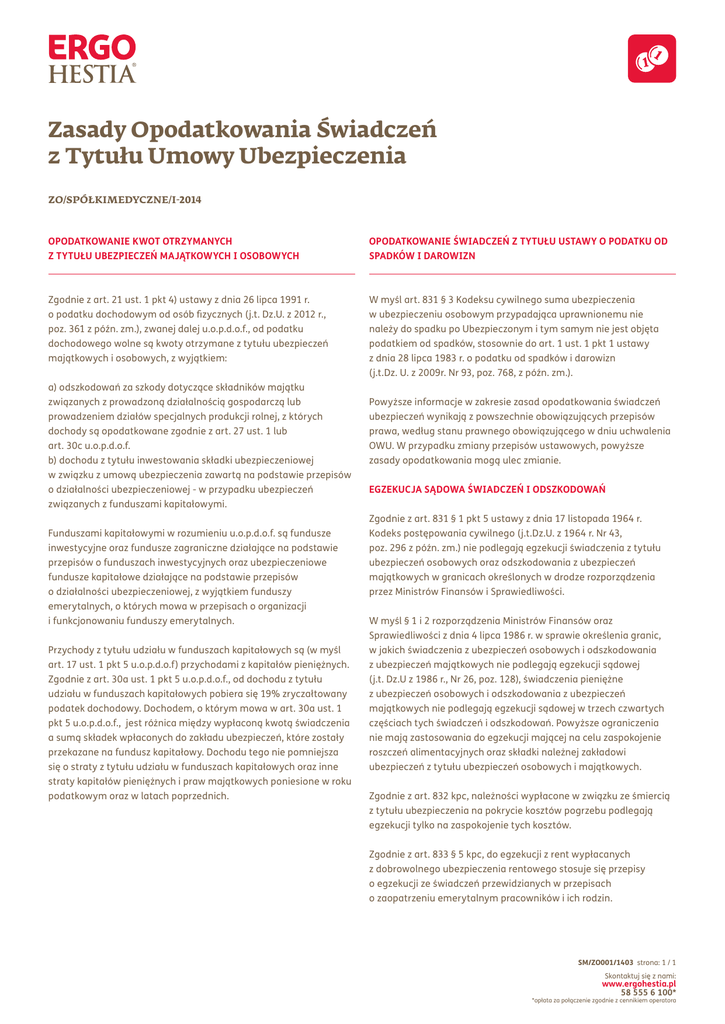 Zasady Opodatkowania Świadczeń z Tytułu Umowy Ubezpieczenia ZO/SPÓŁKIMEDYCZNE/I-2014 OPODATKOWANIE KWOT OTRZYMANYCH Z TYTUŁU UBEZPIECZEŃ MAJĄTKOWYCH I OSOBOWYCH OPODATKOWANIE ŚWIADCZEŃ Z TYTUŁU USTAWY O PODATKU OD SPADKÓW I DAROWIZN Zgodnie z art. 21 ust. 1 pkt 4) ustawy z dnia 26 lipca 1991 r. o podatku dochodowym od osób fizycznych (j.t. Dz.U. z 2012 r., poz. 361 z późn. zm.), zwanej dalej u.o.p.d.o.f., od podatku dochodowego wolne są kwoty otrzymane z tytułu ubezpieczeń majątkowych i osobowych, z wyjątkiem: W myśl art. 831 § 3 Kodeksu cywilnego suma ubezpieczenia w ubezpieczeniu osobowym przypadająca uprawnionemu nie należy do spadku po Ubezpieczonym i tym samym nie jest objęta podatkiem od spadków, stosownie do art. 1 ust. 1 pkt 1 ustawy z dnia 28 lipca 1983 r. o podatku od spadków i darowizn (j.t.Dz. U. z 2009r. Nr 93, poz. 768, z późn. zm.). a) odszkodowań za szkody dotyczące składników majątku związanych z prowadzoną działalnością gospodarczą lub prowadzeniem działów specjalnych produkcji rolnej, z których dochody są opodatkowane zgodnie z art. 27 ust. 1 lub art. 30c u.o.p.d.o.f. b) dochodu z tytułu inwestowania składki ubezpieczeniowej w związku z umową ubezpieczenia zawartą na podstawie przepisów o działalności ubezpieczeniowej - w przypadku ubezpieczeń związanych z funduszami kapitałowymi. Funduszami kapitałowymi w rozumieniu u.o.p.d.o.f. są fundusze inwestycyjne oraz fundusze zagraniczne działające na podstawie przepisów o funduszach inwestycyjnych oraz ubezpieczeniowe fundusze kapitałowe działające na podstawie przepisów o działalności ubezpieczeniowej, z wyjątkiem funduszy emerytalnych, o których mowa w przepisach o organizacji i funkcjonowaniu funduszy emerytalnych. Przychody z tytułu udziału w funduszach kapitałowych są (w myśl art. 17 ust. 1 pkt 5 u.o.p.d.o.f) przychodami z kapitałów pieniężnych. Zgodnie z art. 30a ust. 1 pkt 5 u.o.p.d.o.f., od dochodu z tytułu udziału w funduszach kapitałowych pobiera się 19% zryczałtowany podatek dochodowy. Dochodem, o którym mowa w art. 30a ust. 1 pkt 5 u.o.p.d.o.f., jest różnica między wypłaconą kwotą świadczenia a sumą składek wpłaconych do zakładu ubezpieczeń, które zostały przekazane na fundusz kapitałowy. Dochodu tego nie pomniejsza się o straty z tytułu udziału w funduszach kapitałowych oraz inne straty kapitałów pieniężnych i praw majątkowych poniesione w roku podatkowym oraz w latach poprzednich. Powyższe informacje w zakresie zasad opodatkowania świadczeń ubezpieczeń wynikają z powszechnie obowiązujących przepisów prawa, według stanu prawnego obowiązującego w dniu uchwalenia OWU. W przypadku zmiany przepisów ustawowych, powyższe zasady opodatkowania mogą ulec zmianie. EGZEKUCJA SĄDOWA ŚWIADCZEŃ I ODSZKODOWAŃ Zgodnie z art. 831 § 1 pkt 5 ustawy z dnia 17 listopada 1964 r. Kodeks postępowania cywilnego (j.t.Dz.U. z 1964 r. Nr 43, poz. 296 z późn. zm.) nie podlegają egzekucji świadczenia z tytułu ubezpieczeń osobowych oraz odszkodowania z ubezpieczeń majątkowych w granicach określonych w drodze rozporządzenia przez Ministrów Finansów i Sprawiedliwości. W myśl § 1 i 2 rozporządzenia Ministrów Finansów oraz Sprawiedliwości z dnia 4 lipca 1986 r. w sprawie określenia granic, w jakich świadczenia z ubezpieczeń osobowych i odszkodowania z ubezpieczeń majątkowych nie podlegają egzekucji sądowej (j.t. Dz.U z 1986 r., Nr 26, poz. 128), świadczenia pieniężne z ubezpieczeń osobowych i odszkodowania z ubezpieczeń majątkowych nie podlegają egzekucji sądowej w trzech czwartych częściach tych świadczeń i odszkodowań. Powyższe ograniczenia nie mają zastosowania do egzekucji mającej na celu zaspokojenie roszczeń alimentacyjnych oraz składki należnej zakładowi ubezpieczeń z tytułu ubezpieczeń osobowych i majątkowych. Zgodnie z art. 832 kpc, należności wypłacone w związku ze śmiercią z tytułu ubezpieczenia na pokrycie kosztów pogrzebu podlegają egzekucji tylko na zaspokojenie tych kosztów. Zgodnie z art. 833 § 5 kpc, do egzekucji z rent wypłacanych z dobrowolnego ubezpieczenia rentowego stosuje się przepisy o egzekucji ze świadczeń przewidzianych w przepisach o zaopatrzeniu emerytalnym pracowników i ich rodzin. SM/ZO001/1403 strona: 1 / 1 Skontaktuj się z nami: www.ergohestia.pl 58 555 6 100* *opłata za połączenie zgodnie z cennikiem operatora