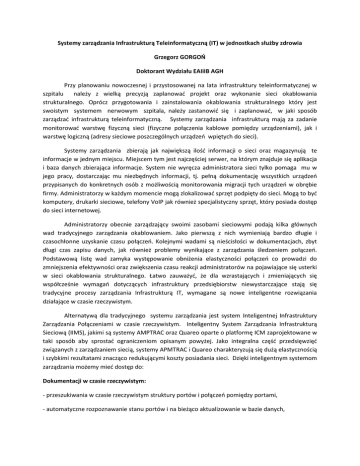 Systemy zarządzania Infrastrukturą Teleinformatyczną (IT) w jednostkach służby zdrowia Grzegorz GORGOŃ Doktorant Wydziału EAIiIB AGH Przy planowaniu nowoczesnej i przystosowanej na lata infrastruktury teleinformatycznej w szpitalu należy z wielką precyzją zaplanować projekt oraz wykonanie sieci okablowania strukturalnego. Oprócz przygotowania i zainstalowania okablowania strukturalnego który jest swoistym systemem nerwowym szpitala, należy zastanowić się i zaplanować, w jaki sposób zarządzać infrastrukturą teleinformatyczną. Systemy zarządzania infrastrukturą mają za zadanie monitorować warstwę fizyczną sieci (fizyczne połączenia kablowe pomiędzy urządzeniami), jak i warstwę logiczną (adresy sieciowe poszczególnych urządzeń wpiętych do sieci). Systemy zarządzania zbierają jak największą ilość informacji o sieci oraz magazynują te informacje w jednym miejscu. Miejscem tym jest najczęściej serwer, na którym znajduje się aplikacja i baza danych zbierająca informacje. System nie wyręcza administratora sieci tylko pomaga mu w jego pracy, dostarczając mu niezbędnych informacji, tj. pełną dokumentację wszystkich urządzeń przypisanych do konkretnych osób z możliwością monitorowania migracji tych urządzeń w obrębie firmy. Administratorzy w każdym momencie mogą zlokalizować sprzęt podpięty do sieci. Mogą to być komputery, drukarki sieciowe, telefony VoIP jak również specjalistyczny sprzęt, który posiada dostęp do sieci internetowej. Administratorzy obecnie zarządzający swoimi zasobami sieciowymi podają kilka głównych wad tradycyjnego zarządzania okablowaniem. Jako pierwszą z nich wymieniają bardzo długie i czasochłonne uzyskanie czasu połączeń. Kolejnymi wadami są nieścisłości w dokumentacjach, zbyt długi czas zapisu danych, jak również problemy wynikające z zarządzania śledzeniem połączeń. Podstawową listę wad zamyka występowanie obniżenia elastyczności połączeń co prowadzi do zmniejszenia efektywności oraz zwiększenia czasu reakcji administratorów na pojawiające się usterki w sieci okablowania strukturalnego. Łatwo zauważyć, że dla wzrastających i zmieniających się współcześnie wymagań dotyczących infrastruktury przedsiębiorstw niewystarczające stają się tradycyjne procesy zarządzania Infrastrukturą IT, wymagane są nowe inteligentne rozwiązania działające w czasie rzeczywistym. Alternatywą dla tradycyjnego systemu zarządzania jest system Inteligentnej Infrastruktury Zarządzania Połączeniami w czasie rzeczywistym. Inteligentny System Zarządzania Infrastrukturą Sieciową (IIMS), jakimi są systemy AMPTRAC oraz Quareo oparte o platformę ICM zaprojektowane w taki sposób aby sprostać ograniczeniom opisanym powyżej. Jako integralna część przedsięwzięć związanych z zarządzaniem siecią, systemy APMTRAC i Quareo charakteryzują się dużą elastycznością i szybkimi rezultatami znacząco redukującymi koszty posiadania sieci. Dzięki inteligentnym systemom zarządzania możemy mieć dostęp do: Dokumentacji w czasie rzeczywistym: - przeszukiwania w czasie rzeczywistym struktury portów i połączeń pomiędzy portami, - automatyczne rozpoznawanie stanu portów i na bieżąco aktualizowanie w bazie danych, - historia zdarzeń mających miejsce w systemie jest zapisywana w aplikacji jak również w postaci logów do wcześniej zdefiniowanego pliku na serwerze; Kontrola sieci: - zdalne reagowanie na błędy pojawiające się w sieci w czasie rzeczywistym; - reakcja na nieautoryzowane działanie poprzez generowanie alarmów i zdarzeń(np. na podpięcie nieautoryzowanego sprzętu do sieci w budynku); Zoptymalizowana konfiguracja sieci oraz możliwość zdalnego zarzadzania zmianami: - system podpowie administratorowi, jakie działania są potrzebne w celu wykonania odpowiedniego zadania i sam wygeneruje listę poleceń potrzebną do jego wykonania; - cały czas dostępna jest lista urządzeń oraz ich fizycznych lokalizacji w obiekcie; Dodatkowymi atutami systemów AMPTRAC i Quareo jest podniesienie poziomu usług powiązanych z IT poprzez: - dodanie w pełni automatycznej informacji lokalizowania zasobów w czasie rzeczywistym, - dostarczenie umożliwiającego przeszukiwanie, dziennika zdarzeń na zasobach w czasie ich istnienia, - 100% dokładna informacja o centrach kosztowych, nazwie użytkownika i portach przełączenia, - dostarczenie doładowań poprzez informację o rejestracji zasobów, monitoring SLA, - raportowanie dostosowane do użytkownika (połączone ze słownikami), - natychmiastowy audyt. Dobre planowanie oraz koordynacja są warunkami koniecznymi dla bezawaryjnego działania różnorodnych technologii opartych na okablowaniu strukturalnym. Aby to uzyskać należy zastosować system który będzie w inteligentny sposób zarządzać i monitorować infrastrukturę teleinformatyczną. Podstawą dobrego planowania jest możliwość zarządzania wszystkimi warstwami sieci w tym warstwą fizyczną, w której występuje najwięcej usterek związanych z prawidłowym działaniem sieci. Zarządzanie warstwą fizyczną jest sprawą kluczową dla wszystkich procesów i usług zależnych od infrastruktury teleinformatycznej. Jest ona podstawą organizacji ICT (tzw: Technologii informacyjnokomunikacyjnych), można więc powiedzieć, że cała organizacja jest zależna od tego rodzaju zarządzania. Warstwa fizyczna łączy razem wszystkie urządzenia znajdujące się w sieci. Jest to najniższa z 7 warstw modelu odniesienia określonego przez grupę ISO Open System Interconnect (OSI). Prawidłowe działanie tej warstwy jest niezbędne do działania pozostałych a co za tym idzie do prawidłowego działania sieci okablowania strukturalnego w budynku. Unikalna specyfika budowy infrastruktury teleinformatycznej w jednostkach szpitalnych pozwala na wykorzystanie systemów zarządzania infrastrukturą teleinformatyczną w czasie rzeczywistym. Obiekty te z