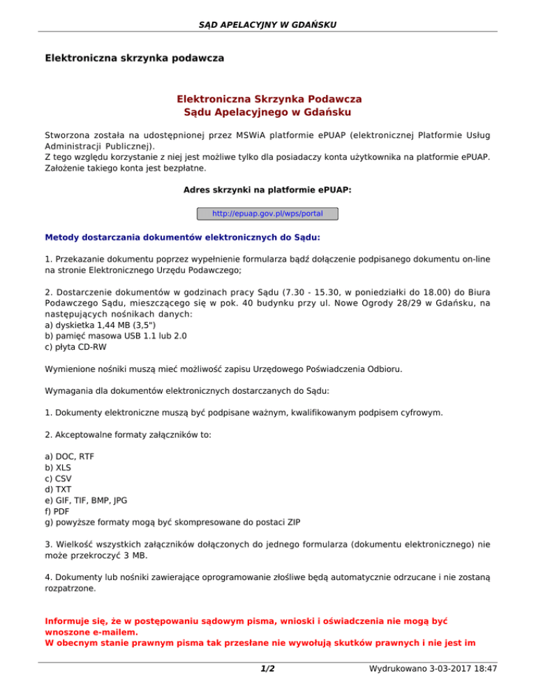 SĄD APELACYJNY W GDAŃSKU Elektroniczna skrzynka podawcza Elektroniczna Skrzynka Podawcza Sądu Apelacyjnego w Gdańsku Stworzona została na udostępnionej przez MSWiA platformie ePUAP (elektronicznej Platformie Usług Administracji Publicznej). Z tego względu korzystanie z niej jest możliwe tylko dla posiadaczy konta użytkownika na platformie ePUAP. Założenie takiego konta jest bezpłatne. Adres skrzynki na platformie ePUAP: http://epuap.gov.pl/wps/portal Metody dostarczania dokumentów elektronicznych do Sądu: 1. Przekazanie dokumentu poprzez wypełnienie formularza bądź dołączenie podpisanego dokumentu on-line na stronie Elektronicznego Urzędu Podawczego; 2. Dostarczenie dokumentów w godzinach pracy Sądu (7.30 - 15.30, w poniedziałki do 18.00) do Biura Podawczego Sądu, mieszczącego się w pok. 40 budynku przy ul. Nowe Ogrody 28/29 w Gdańsku, na następujących nośnikach danych: a) dyskietka 1,44 MB (3,5") b) pamięć masowa USB 1.1 lub 2.0 c) płyta CD-RW Wymienione nośniki muszą mieć możliwość zapisu Urzędowego Poświadczenia Odbioru. Wymagania dla dokumentów elektronicznych dostarczanych do Sądu: 1. Dokumenty elektroniczne muszą być podpisane ważnym, kwalifikowanym podpisem cyfrowym. 2. Akceptowalne formaty załączników to: a) DOC, RTF b) XLS c) CSV d) TXT e) GIF, TIF, BMP, JPG f) PDF g) powyższe formaty mogą być skompresowane do postaci ZIP 3. Wielkość wszystkich załączników dołączonych do jednego formularza (dokumentu elektronicznego) nie może przekroczyć 3 MB. 4. Dokumenty lub nośniki zawierające oprogramowanie złośliwe będą automatycznie odrzucane i nie zostaną rozpatrzone. Informuje się, że w postępowaniu sądowym pisma, wnioski i oświadczenia nie mogą być wnoszone e-mailem. W obecnym stanie prawnym pisma tak przesłane nie wywołują skutków prawnych i nie jest im 1/2 Wydrukowano 3-03-2017 18:47 2/2 Wydrukowano 3-03-2017 18:47 nadawany bieg. Udostępniający: Administrator Wytwarzający/Odpowiadający: Administrator Czas udostępnienia: 01.02.2011 14:36 Czas wytworzenia: 30.12.2010 13:23 Ostatnia modyfikacja: 18.08.2016 13:01 przez Administrator 2/2 Wydrukowano 3-03-2017 18:47