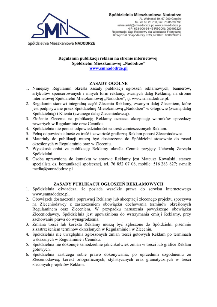 Regulamin publikacji reklam na stronie internetowej Spółdzielni Mieszkaniowej „Nadodrze” www.smnadodrze.pl ZASADY OGÓLNE 1. Niniejszy Regulamin określa zasady publikacji ogłoszeń reklamowych, bannerów, artykułów sponsorowanych i innych form reklamy, zwanych dalej Reklamą, na stronie internetowej Spółdzielni Mieszkaniowej „Nadodrze”, tj. www.smnadodrze.pl. 2. Regulamin stanowi integralną część Zlecenia Reklamy, zwanym dalej Zleceniem, które jest podpisywane przez Spółdzielnię Mieszkaniową „Nadodrze” w Głogowie (zwaną dalej Spółdzielnią) i Klienta (zwanego dalej Zleceniodawcą). 3. Złożenie Zlecenia na publikację Reklamy oznacza akceptację warunków sprzedaży zawartych w Regulaminie oraz Cenniku. 4. Spółdzielnia nie ponosi odpowiedzialności za treść zamieszczonych Reklam. 5. Pełną odpowiedzialność za treść i zawartość graficzną Reklam ponosi Zleceniodawca. 6. Materiały do publikacji muszą być dostarczone do Spółdzielni stosownie do zasad określonych w Regulaminie oraz w Zleceniu. 7. Wysokość opłat za publikację Reklamy określa Cennik przyjęty Uchwałą Zarządu Spółdzielni. 8. Osobą uprawnioną do kontaktu w sprawie Reklamy jest Mateusz Kowalski, starszy specjalista ds. komunikacji społecznej, tel. 76 852 07 08, mobile: 516 283 827; e-mail: [email protected]. ZASADY PUBLIKACJI OGŁOSZEŃ REKLAMOWYCH 1. Spółdzielnia oświadcza, że posiada wszelkie prawa do serwisu internetowego www.smnadodrze.pl. 2. Obowiązek dostarczenia poprawnej Reklamy lub akceptacji zleconego projektu spoczywa na Zleceniodawcy z zastrzeżeniem obowiązku dochowania terminów określonych Regulaminem oraz Zleceniem. W przypadku naruszenia powyższego obowiązku Zleceniodawcy, Spółdzielnia jest upoważniona do wstrzymania emisji Reklamy, przy zachowaniu prawa do wynagrodzenia. 3. Zmiana treści lub korekta Reklamy muszą być zgłoszone do Spółdzielni pisemnie z zastrzeżeniem terminów określonych w Regulaminie i w Zleceniu. 4. Spółdzielnia nie uwzględnia zgłoszonych zmian treści gotowych Reklam po terminach wskazanych w Regulaminie i Cenniku. 5. Spółdzielnia nie dokonuje samodzielnie jakichkolwiek zmian w treści lub grafice Reklam gotowych. 6. Spółdzielnia zastrzega sobie prawo dokonywania, po uprzednim uzgodnieniu ze Zleceniodawcą, korekt ortograficznych, stylistycznych oraz gramatycznych w treści zleconych projektów Reklam. 7. Spółdzielnia zastrzega sobie prawo odmowy przyjęcia lub odmowy publikacji albo też wstrzymania publikacji Reklamy na wcześniej uzgodnionych warunkach, bez ponoszenia jakiejkolwiek odpowiedzialności z tego tytułu, z następujących przyczyn: a) sprzeczności ogłoszenia reklamowego z prawem bądź zasadami współżycia społecznego (dobrymi obyczajami), b) sprzeczności Reklamy z interesem Spółdzielni, a także negatywnej oceny przez Zarząd Spółdzielni treści zawartych w ogłoszeniu reklamowym, c) technicznych, technologicznych lub emisyjnych, d) sądowego zabezpieczenia bądź zgłoszenia przez osoby trzecie przeciwko Spółdzielni lub osobom trzecim roszczeń lub uprawdopodobnionych zastrzeżeń związanych z ogłoszeniem reklamowym bądź jego emisją w zakresie objętym Zleceniem, e) zgłoszenia zastrzeżeń przez uprawniony do tego organ, f) zawarcie z innym Zleceniodawcą umowy na wyłączność umieszczania Reklamy w danej branży. 8. Publikacja Reklamy następuje od dnia podanego przez Zleceniodawcę na Zleceniu. 9. W przypadku opóźnienia płatności ze strony Zleceniodawcy, Spółdzielnia naliczy odsetki ustawowe. 10. Za dzień dokonania płatności uznaje się datę wpływu środków na konto Spółdzielni. 11. Spółdzielnia zastrzega sobie prawo odmowy przyjęcia lub odmowy dalszej publikacji albo też wstrzymania publikacji Reklamy bez podania przyczyny, bez ponoszenia jakiejkolwiek odpowiedzialności z tego tytułu. 12. Ewentualne reklamacje należy zgłaszać w terminie 7 dni od daty publikacji Reklamy. 1. 2. 3. 4. 5. 6. 7. WARUNKI TECHNICZNE Dostarczone materiały muszą być przygotowane w 4 kolorach: CMYK. Dopuszczalne formaty plików: a) JPG, b) TIFF, c) PDF, d) CDR, e) PSD. Jakość przygotowanych plików: rozdzielczość 72 DPI. Dostarczenie poprawnej Reklamy lub akceptacja zleconego projektu muszą nastąpić najpóźniej na trzy dni przed datą publikacji Reklamy. Zmiana treści lub korekta Reklamy możliwe są najpóźniej na trzy dni przed datą publikacji Reklamy. Wymiary bannerów znajdują się w aktualnym Cenniku. Zamówienie należy składać na Formularzu zlecenia. Zamówienia można składać drogą elektroniczną na adres: [email protected] lub pisemnie w siedzibie Spółdzielni, pokój nr 34.