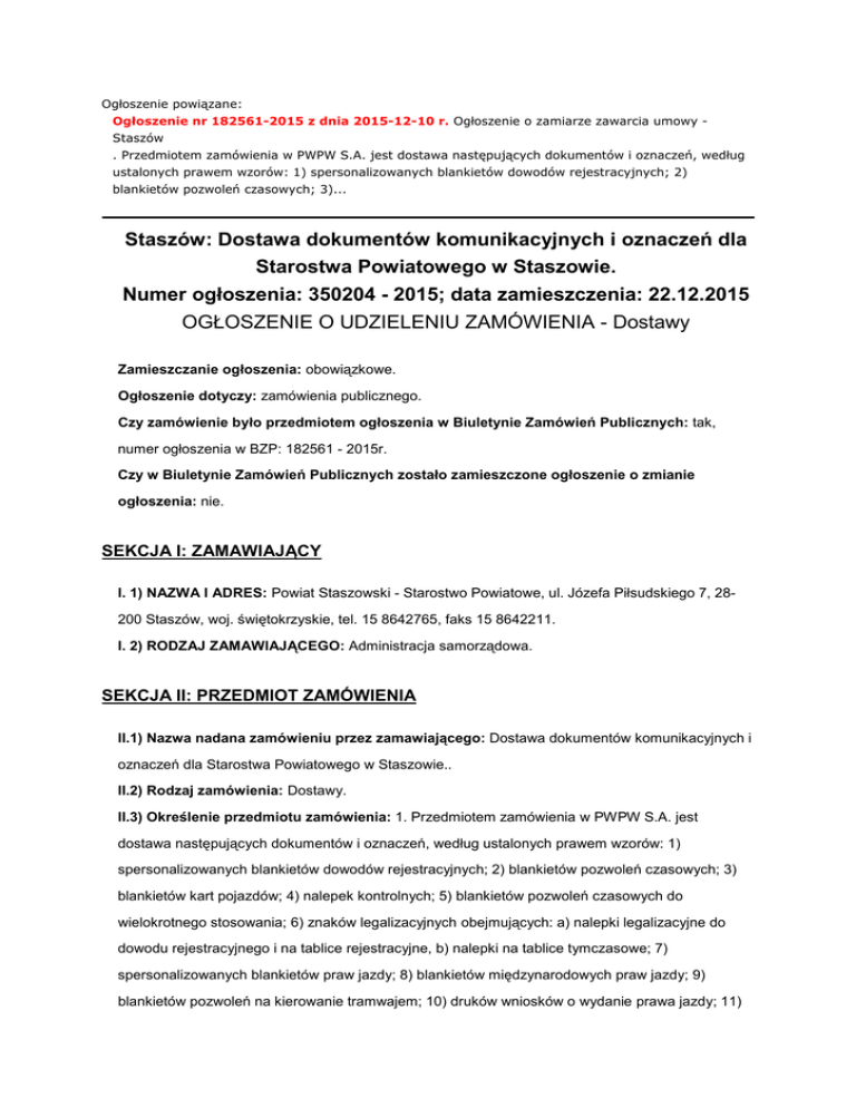 Ogłoszenie powiązane: Ogłoszenie nr 182561-2015 z dnia 2015-12-10 r. Ogłoszenie o zamiarze zawarcia umowy Staszów . Przedmiotem zamówienia w PWPW S.A. jest dostawa następujących dokumentów i oznaczeń, według ustalonych prawem wzorów: 1) spersonalizowanych blankietów dowodów rejestracyjnych; 2) blankietów pozwoleń czasowych; 3)... Staszów: Dostawa dokumentów komunikacyjnych i oznaczeń dla Starostwa Powiatowego w Staszowie. Numer ogłoszenia: 350204 - 2015; data zamieszczenia: 22.12.2015 OGŁOSZENIE O UDZIELENIU ZAMÓWIENIA - Dostawy Zamieszczanie ogłoszenia: obowiązkowe. Ogłoszenie dotyczy: zamówienia publicznego. Czy zamówienie było przedmiotem ogłoszenia w Biuletynie Zamówień Publicznych: tak, numer ogłoszenia w BZP: 182561 - 2015r. Czy w Biuletynie Zamówień Publicznych zostało zamieszczone ogłoszenie o zmianie ogłoszenia: nie. SEKCJA I: ZAMAWIAJĄCY I. 1) NAZWA I ADRES: Powiat Staszowski - Starostwo Powiatowe, ul. Józefa Piłsudskiego 7, 28200 Staszów, woj. świętokrzyskie, tel. 15 8642765, faks 15 8642211. I. 2) RODZAJ ZAMAWIAJĄCEGO: Administracja samorządowa. SEKCJA II: PRZEDMIOT ZAMÓWIENIA II.1) Nazwa nadana zamówieniu przez zamawiającego: Dostawa dokumentów komunikacyjnych i oznaczeń dla Starostwa Powiatowego w Staszowie.. II.2) Rodzaj zamówienia: Dostawy. II.3) Określenie przedmiotu zamówienia: 1. Przedmiotem zamówienia w PWPW S.A. jest dostawa następujących dokumentów i oznaczeń, według ustalonych prawem wzorów: 1) spersonalizowanych blankietów dowodów rejestracyjnych; 2) blankietów pozwoleń czasowych; 3) blankietów kart pojazdów; 4) nalepek kontrolnych; 5) blankietów pozwoleń czasowych do wielokrotnego stosowania; 6) znaków legalizacyjnych obejmujących: a) nalepki legalizacyjne do dowodu rejestracyjnego i na tablice rejestracyjne, b) nalepki na tablice tymczasowe; 7) spersonalizowanych blankietów praw jazdy; 8) blankietów międzynarodowych praw jazdy; 9) blankietów pozwoleń na kierowanie tramwajem; 10) druków wniosków o wydanie prawa jazdy; 11) spersonalizowanych kart pojazdu; 12) spersonalizowanych nalepek kontrolnych. PWPW S.A. będzie dokonywać personalizacji blankietów dokumentów: dowodów rejestracyjnych, praw jazdy, kart pojazdu, nalepek kontrolnych na podstawie danych i informacji uzyskanych od Zamawiającego w zamówieniach. PWPW S.A. umożliwi Zamawiającemu korzystanie z systemów teleinformatycznych POJAZD i KIEROWCA służących do wsparcia informatycznego procesu rejestracji pojazdów i wydawania uprawnień do kierowania pojazdów oraz składania odpowiednich zamówień w formie elektronicznej na dokumenty spersonalizowane w ramach cen za wytwarzanie tych dokumentów. PWPW S.A. zapewni dostarczanie ww. dokumentów z zachowaniem wymogów technicznych i jakościowych zgodnie z przepisami w sprawie: 1) warunków dystrybucji blankietów dowodów rejestracyjnych, pozwoleń czasowych i nalepek kontrolnych; 2) warunków dystrybucji kart pojazdów; 3) wydawania uprawnień do kierowania pojazdami; 4) warunków produkcji oraz sposobu dystrybucji tablic rejestracyjnych i znaków legalizacyjnych. Opis przedmiotu zamówienia według kodów CPV: 22.90.00.00-9 - Różne druki, 22.45.40.00-7- Prawa jazdy; 22.45.60.00-1 - Pozwolenia. II.4) Wspólny Słownik Zamówień (CPV): 22.90.00.00-9, 22.45.40.00-7, 22.45.60.00-1. SEKCJA III: PROCEDURA III.1) TRYB UDZIELENIA ZAMÓWIENIA: Zamówienie z wolnej ręki III.2) INFORMACJE ADMINISTRACYJNE • Zamówienie dotyczy projektu/programu finansowanego ze środków Unii Europejskiej: nie SEKCJA IV: UDZIELENIE ZAMÓWIENIA IV.1) DATA UDZIELENIA ZAMÓWIENIA: 21.12.2015. IV.2) LICZBA OTRZYMANYCH OFERT: 1. IV.3) LICZBA ODRZUCONYCH OFERT: 0. IV.4) NAZWA I ADRES WYKONAWCY, KTÓREMU UDZIELONO ZAMÓWIENIA: • Polska Wytwórnia Papierów Wartościowych S.A., ul. Sanguszki 1, 00-222 Warszawa, kraj/woj. mazowieckie. IV.5) Szacunkowa wartość zamówienia (bez VAT): 551986,69 PLN. IV.6) INFORMACJA O CENIE WYBRANEJ OFERTY ORAZ O OFERTACH Z NAJNIŻSZĄ I NAJWYŻSZĄ CENĄ • Cena wybranej oferty: 678943,63 • Oferta z najniższą ceną: 678943,63 / Oferta z najwyższą ceną: 678943,63 • Waluta: PLN . ZAŁĄCZNIK I Uzasadnienie udzielenia zamówienia w trybie negocjacji bez ogłoszenia, zamówienia z wolnej ręki albo zapytania o cenę • 1. Podstawa prawna Postępowanie prowadzone jest w trybie zamówienie z wolnej ręki na podstawie art. 67 ust. 1 pkt 1 lit. a ustawy z dnia 29 stycznia 2004r. - Prawo zamówień publicznych. • 2. Uzasadnienia wyboru trybu Należy podać uzasadnienie faktyczne i prawne wyboru trybu oraz wyjaśnić, dlaczego udzielenie zamówienia jest zgodne z przepisami. Zgodnie z art. 67 ust. 1 pkt 1 lit. a) ustawy z 29 stycznia 2004 r. Prawo zamówień publicznych (t. j. Dz. U. z 2013 r., poz. 907 ze zm.) Zamawiający może udzielić zamówienia w trybie zamówienia z wolnej ręki, gdy dostawy mogą być świadczone tylko przez jednego Wykonawcę z przyczyn technicznych o obiektywnym charakterze. Na podstawie art. 75d ustawy Prawo o ruchu drogowym (Dz. U. z 2012 r. poz. 1137 z późn. zm.) Minister Infrastruktury komunikatem z dnia 18 sierpnia 2008 r. w sprawie wyboru producenta blankietów dokumentów komunikacyjnych (Dz. Urzędowy MI z 2008 r. Nr 11, poz. 64) poinformował o wyborze Polskiej Wytwórni Papierów Wartościowych S.A. z siedzibą w Warszawie przy ul. Sanguszki 1 jako wyłącznego producenta blankietów dokumentów komunikacyjnych. W związku z powyższym Zamawiający udziela zamówienia z wolnej ręki na podstawie art. 67 ust. 1 pkt 1 lit. a) ustawy Pzp, Polskiej Wytwórni Papierów Wartościowych S.A., gdyż PWPW S.A. jest jedynym producentem realizującym dostawy dot. przedmiotowych dokumentów komunikacyjnych z przyczyn technicznych o obiektywnym charakterze.