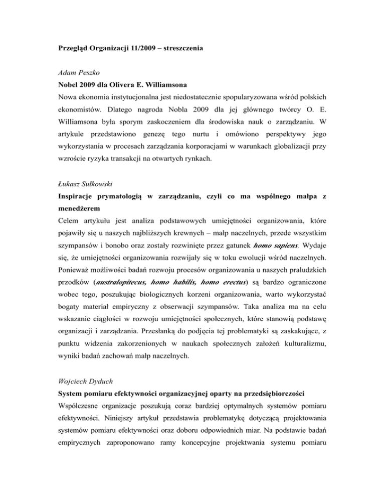 Przegld Organizacji 11/2009 – streszczenia Adam Peszko Nobel 2009 dla Olivera E. Williamsona Nowa ekonomia instytucjonalna jest niedostatecznie spopularyzowana wród polskich ekonomistów. Dlatego nagroda Nobla 2009 dla jej g ównego twórcy O. E. Williamsona by a sporym zaskoczeniem dla rodowiska nauk o zarzdzaniu. W artykule przedstawiono genez tego nurtu i omówiono perspektywy jego wykorzystania w procesach zarzdzania korporacjami w warunkach globalizacji przy wzrocie ryzyka transakcji na otwartych rynkach. ukasz Sukowski Inspiracje prymatologi w zarzdzaniu, czyli co ma wspólnego mapa z menederem Celem artyku u jest analiza podstawowych umiejtnoci organizowania, które pojawi y si u naszych najbliszych krewnych – ma p naczelnych, przede wszystkim szympansów i bonobo oraz zosta y rozwinite przez gatunek homo sapiens. Wydaje si, e umiejtnoci organizowania rozwija y si w toku ewolucji wród naczelnych. Poniewa moliwoci bada rozwoju procesów organizowania u naszych praludzkich przodków (australopitecus, homo habilis, homo erectus) s bardzo ograniczone wobec tego, poszukujc biologicznych korzeni organizowania, warto wykorzysta bogaty materia empiryczny z obserwacji szympansów. Taka analiza ma na celu wskazanie cig oci w rozwoju umiejtnoci spo ecznych, które stanowi podstaw organizacji i zarzdzania. Przes ank do podjcia tej problematyki s zaskakujce, z punktu widzenia zakorzenionych w naukach spo ecznych za oe kulturalizmu, wyniki bada zachowa ma p naczelnych. Wojciech Dyduch System pomiaru efektywnoci organizacyjnej oparty na przedsi biorczoci Wspólczesne organizacje poszukuj coraz bardziej optymalnych systemów pomiaru efektywnoci. Niniejszy artyku przedstawia problematyk dotyczc projektowania systemów pomiaru efektywnoci oraz doboru odpowiednich miar. Na podstawie bada empirycznych zaproponowano ramy koncepcyjne projektwania systemu pomiaru efektywnoci, który bierze pod uwag miary przedsibiorczoci organizacyjnej oparte na jej skadowych w najwikszym stopniu powizanych z efektywnoci: proaktywnoci, innowacyjnoci, intraprzedsibiorczoci, podejmowaniu ryzyka, oraz elastycznoci w myleniu i dziaaniu. Mirosaw Laszczak B dy zarzdzania w czasach kryzysu Czas kryzysu stawia przed menederami nowe wyzwania, a równoczenie odsania bdy zarzdzajcych. Za najpowaniejszy bd w pierwszej fazie kryzysu uwaa si nadmiern pewno siebie i wybujay optymizm. Zwalnianie pracowników oraz kierowane do dostawców dania niszych cen – to typowe bdy drugiej fazy kryzysu. Gdy wreszcie kryzys si koczy i nadchodzi oywienie, wówczas menederowie zakadaj, e wzrost sprzeday bdzie szybszy ni wzrost zaplanowanych przez nich wydatków, przez co naraaj swoje przedsibiorstwo na kolejne niebezpieczestwo. Janusz T. Hryniewicz Nierównoci pacowe i kwalifikacje menederskie. Wraz z globalizacja rosn gwatownie dochody najwyszych menederów. Wzrost ten nie zawsze ma uzasadnienie w realnych sukcesach gospodarczych przedsibiorstw. Obserwacja dochodów 1% najbogatszych Amerykanów dowodzi, e dochody te zale od fluktuacji polityczno – ideologicznych. Dochody wikszoci pracowników najemnych zale od si rynkowych. Podobnie jest w Polsce, gdzie pace menederów w sektorze publicznym powinny by uzalenione od pac pracowników. Mariola Ciszewska-Mlinari Wpyw czynników menederskich na umi dzynarodowienie maych i rednich firm w Sowenii Umidzynarodowienie dziaalnoci maych i rednich przedsibiorstw (MP) jest wanym i interesujcym obszarem bada na caym wiecie. W celu zrozumienia tego zoonego zjawiska przyjmowane s róne teoretyczne perspektywy; wród nich podejcie zasobowe cieszy si niesabncym zainteresowaniem. W niniejszym artykule skoncentrowano si na trzech czynnikach menederskich bdcych przyk adami niematerialnych zasobów firmy i jednoczenie zwizanych z umidzynarodowieniem dzia alnoci firmy. S to: stosunek menederów do umidzynarodowienia dzia alnoci; wiedza o procesie umidzynarodowienia; oraz midzynarodowe dowiadczenie menederów. Prezentowane wyniki opieraj si na próbie 67 s oweskich firm produkcyjnych. Wszystkie firmy wybrane do próby s eksporterami. Hipotezy s weryfikowane przy wykorzystaniu modeli regresji liniowej. Wyniki pokazuj, e dwa z trzech czynników, tj. stosunek i wiedza wp ywaj na poziom umidzynarodowienia. Wojciech Popczyk Czynniki determinujce internacjonalizacj przedsi biorstw rodzinnych W przedsibiorstwach rodzinnych system rodziny ma istotny wp yw na funkcjonowanie i zachowania strategiczne systemu biznesu. Stopie, zakres oraz przebieg internacjonalizacji biznesu jest determinowany czynnikami rodzinnymi. Autor prezentuje dotychczasow wiedz empiryczn na wiecie, opisujc zachowania midzynarodowe firm rodzinnych oraz formu uje rekomendacje, co do dalszych bada w tej dziedzinie. Stanisaw Podczarski Tendencje zmian kosztów restrukturyzacji przedsi biorstw Przedsibiorstwo podczas restrukturyzacji, oprócz kosztów swojej dzia alnoci zawodowej, dodatkowo ponosi koszty restrukturyzacji, w tym m.in. koszty administracyjno-prawne. Nale do nich m.in. koszty sporzdzenia aktu notarialnego i statutu spó ki. Ustalono kierunki zmian wielkoci kosztów administracyjnoprawnych oraz ogólnie oceniono wielko udzia u niektórych tych kosztów w ca kowitych kosztach restrukturyzacji przedsibiorstwa. Katarzyna Byrka-Kita, Dominik Rozkrut Wybór metody estymacji a warto szacunku parametru beta dla akcji notowanych na Giedzie Papierów Wartociowych w Warszawie Nawet na rozwinitych rynkach kapita owych kwestia wyznaczania kosztu kapita u w asnego, a w szczególnoci beta jako taka stanowi przedmiot wielu kontrowersji. Znajomo kosztu kapita u nie jest na co dzie potrzebna zarzdzajcym, gdy nie podejmuj decyzji inwestycyjnych, czy te decyzji zwizanych z procesami fuzji i przej. Ponadto nie jest to warto raportowana w systemach ewidencji ksigowej. Estymacja Bety w praktyce dokonywana moe by na róne sposoby,w rezultacie czego dla tej samej akcji moliwe jest uzyskanie odmiennych wartoci tego wspó czynnika. W literaturze mamy do czynienia z obsz