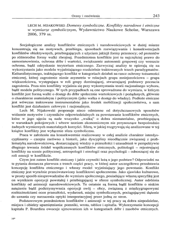 Oceny i omówienia LECH M. NIJAKOWSKI: 243 Domeny symboliczne. Konflikty narodowe i etniczne w wymiarze symbolicznym, Wydawnictwo Naukowe Scholar, Warszawa 2006, 379 ss. Socjologiczne analizy konfliktów etnicznych i narodowosciowych w duzej mierze koncentruja sie na motywach, przebiegu, sposobach rozwiazywania i konsekwencjach konfliktów obiektywnych, przebiegajacych z uzyciem jakiejs formy przemocy; od protestów po róznorodne formy walki zbrojnej. Przedmiotem konfliktu jest tu najczesciej prawo do samostanowienia, ochrona dóbr i wartosci, zwiekszenie autonomii grupowej czy wreszcie ochrona, badz odzyskanie terytorium etnicznego. Zazwyczaj analizy te opieraja sie na wykorzystaniu jako modelu wyjasniajacego rozdzielnie traktowanych trzech paradygmatów. Kulturalistycznego, traktujacego konflikt w kategoriach dzialan na rzecz ochrony tozsamosci etnicznej, której zagrozenie niesie asymetria w relacjach grupa mniejszosciowa - grupa wiekszosciowa, wystepujaca w roli grupy dominujacej, stwarzajacej podstawy poczucia zagrozenia. Poza nim konflikty wyjasnia sie przy wykorzystaniu teorii racjonalnego wyboru, badz modelu politycznego. W tych przypadkach sa one sprowadzane do wymiaru, w którym konflikt jest forma walki o dostep do dóbr spolecznie wartosciowych i pozadanych, glównie o charakterze materialnym i politycznym Uako walka o dostep do wladzy). Podloze etniczne jest wówczas traktowane instrumentalnie jako srodek mobilizacji spoleczenstwa, a sam konflikt jest dzialaniem celowym i racjonalnym. Lech M. Nijakowski proponuje nieco odmienne od dotychczasowych sposobów widzenie motywów i czynników odpowiedzialnych za powstawanie konfliktów etnicznych, które w jego ujeciu sa nade wszystko "walka" o dobra niematerialne, przebiegajaca w warunkach pokojowych i wbrew teoriom ekonomicznym nie przynoszace bezposrednio zadnych wymiernych materialnych korzysci. Sfera, w jakiej rozgrywaja sie analizowane w tej ksiazce konflikty jest wylacznie sfera symboliczna. Praca w zalozeniu ma konsekwentnie realizowany w calej analizie charakter interdyscyplinarny - czerpie zarówno z historii, jako dyscypliny nieodlacznie zwiazanej z problematyka narodowosciowa, dostarczajacej wiedzy o przeszlosci i uzasadnien w perspektywie dlugiego trwania zródel wspólczesnych konfliktów etnicznych, politologii - rejestrujacej konflikty na scenie politycznej, antropologii i etnologii oraz psychologii - odnoszacej sie do roli emocji w konflikcie. Czym jest zatem konflikt etniczny i jakie czynniki leza u jego podstaw? Odpowiedzi na te pytania dostarcza pierwsza z trzech czesci pracy, w której autor szczególowo przedstawia koncepcje konfliktu etnicznego i wlasny model wyjasniajacy jego powstanie. Konflikt etniczny jest wyraznie przeciwstawiony konfliktowi spolecznemu. Jako zjawisko kulturowe, w prosty sposób niesprowadzalne do wymiaru spolecznego, posiadajace wlasna specyfike jest on wynikiem opozycji powstalej i przebiegajacej w sferze symbolicznej. Autor odróznia konflikty od animozji narodowosciowych. Te ostatnie sa forma badz konfliktu o niskim natezeniu badz podtrzymywania opozycji swój - obcy, zwiazana z miedzygrupowymi rozbieznosciami ocen przeszlosci, wydarzen, miejsc symbolicznych, pociagajacymi dazenie do uznania czy narzucenia optyki interpretacyjnej przez jedna ze stron. Podstawowym przedmiotem konfliktów i animozji w tej pracy sa dobra niepodzielne, miejsca i obiekty upamietniania: pomniki, wrota, tablice i epitafia. Wykorzystanie koncepcji kapitalu P. Bourdieu owocuje ujmowaniem ich w kategoriach dóbr i zasobów etnicznych. 16* 244 Oceny i omówienia Róznica miedzy nimi tkwi w funkcji, jakie pelnia. Dobra stanowia wyrózniki grupy, wspólksztaltuja i pozwalaja zachowac tozsamosc etniczna grupy. Zasoby to jedynie ta czesc elementów kulturowych, które sa wykorzystywane w dzialaniu wykraczajacym poza plaszczyzne tozsamosciowa. Zgodnie z przyjeta koncepcja konflikty symboliczne nie tylko wykraczaja poza pole symbolizacji, wkraczajac na inne, ale takze angazuja wiele podmiotów, których motywacje do dzialania w tym zakresie wyjasniaja pojawienie sie konfliktów. Przedstawienie modelu wyjasniajacego poprzedza analiza funkcji, wymiarów i typologii "pomników", zawarta w podrozdziale noszacym metaforyczny tytul: Socjologia pomnika. Mianem pomnika okreslone ,zostaly wszelkie wytwory materialne w formie naturalnej i sztucznej, majace na celu upamietnienie, istotnych z punktu widzenia danej grupy etnicznej wydarzen historycznych, miejsc czy postaci z nimi zwiazanych. Tym samym pomniki staja sie przedmiotem symbolizacji i jednoczesnie dobrem (badz zasobem) etnicznym. W tym sensie pelnia - zdaniem autora - nie tylko funkcje integrujaca spoleczenstwa, ale takze sa podstawa powstawania konfliktów etnicznych i animozji narodowosciowych, przebiegajacych miedzy odrebnymi "wspólnotami pamieci". Wspólnoty te tworzone sa wokól odmiennych i czesto nieprzystajacych do siebie zasobów pamieci o wspólnej przeszlosci, sposobów widzenia i interpretowania minionych wydarzen. Spory moga zatem dotyczyc kilku podstawowych elementów: statusu pomnika, jego przeslania, estetyki, kwestii utrzymania, prawa do sprawowania ceremonii i zasad jej prowadzenia, granic pomnika czy wreszcie jego wlasnosci. W tej czesci pracy uwage zwraca autorska typologia pomników, opatrzona przykladami i opierajaca sie na czterech podstawowych kryteriach wyrózniania: lokalizacji pomnika (wraz z jego kulturowymi konsekwencjami), przedmiocie upamietniania (kryterium uwzgledniajace podmiot upamietniajacy), charakterze upamietnienia (odnoszacym sie do spolecznej percepcji tych obiektów), w ostatnim typie mieszcza sie tzw. pomniki "niestandardowe". Analiza któregokolwiek z tych typów pomników w opinii L.M. Nijakowskiego wymaga przeprowadzenia wielowymiarowego postepowania, którego celem i efektem koncowym jest uchwycenie nie tyle zlozonego charaktery tych zjawisk kulturowych, co znaczenia i roli pomników w róznych wymiarach zycia spoleczne