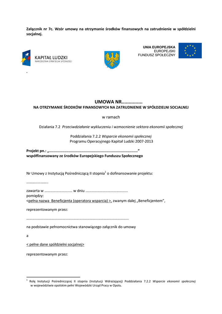 Załącznik nr 7c. Wzór umowy na otrzymanie środków finansowych na zatrudnienie w spółdzielni socjalnej. UNIA EUROPEJSKA EUROPEJSKI FUNDUSZ SPOŁECZNY . UMOWA NR............... NA OTRZYMANIE ŚRODKÓW FINANSOWYCH NA ZATRUDNIENIE W SPÓŁDZIELNI SOCJALNEJ w ramach Działania 7.2 Przeciwdziałanie wykluczeniu i wzmocnienie sektora ekonomii społecznej Poddziałania 7.2.2 Wsparcie ekonomii społecznej Programu Operacyjnego Kapitał Ludzki 2007-2013 Projekt pn.: „.................................................................................” współfinansowany ze środków Europejskiego Funduszu Społecznego Nr Umowy z Instytucją Pośredniczącą II stopnia1 o dofinansowanie projektu: ………………….. zawarta w ........................... w dniu ......................................... pomiędzy: <pełna nazwa Beneficjenta (operatora wsparcia) >, zwanym dalej „Beneficjentem”, reprezentowanym przez: ................................................................................................... na podstawie pełnomocnictwa stanowiącego załącznik do umowy a < pełne dane spółdzielni socjalnej> reprezentowanym przez: 1 Rolę Instytucji Pośredniczącej II stopnia (Instytucji Wdrażającej) Poddziałania 7.2.2 Wsparcie ekonomii społecznej w województwie opolskim pełni Wojewódzki Urząd Pracy w Opolu. ................................................................................................... na podstawie pełnomocnictwa stanowiącego załącznik do umowy Strony uzgodniły, co następuje: §1 Przedmiot umowy 1. 2. 3. 4. 5. 6. 7. 8. Przedmiotem niniejszej Umowy jest przyznanie przez Beneficjenta, wsparcia w postaci środków finansowych na zatrudnienie w spółdzielni socjalnej, zgodnie z art. 5a ust. 1 ustawy o spółdzielniach socjalnych, zwanego dalej „wsparciem finansowym”. Wsparcie finansowe, polega na udzieleniu spółdzielni socjalnej, wsparcia kapitałowego, o które wnioskuje spółdzielnia socjalna utworzona przez podmioty, o których mowa w art. 4 ust. 2 pkt 2 i 3 ustawy o spółdzielniach socjalnych, ułatwiającego sfinansowanie wydatków umożliwiających poprawę jej funkcjonowania, Wsparcie finansowe przyznawane jest zgodnie z Wnioskiem o przyznanie środków finansowych na założenie/przystąpienie/zatrudnienie w spółdzielni socjalnej, stanowiącym załącznik do niniejszej Umowy, zwanego dalej „Wnioskiem”. Wsparcie finansowe może zostać udzielone tylko na rzecz uczestnika projektu, który spełnia określone wymagania czyli jest osobą fizyczną, o której mowa w art. 4 ust. 2 pkt 1 ustawy o spółdzielniach socjalnych. Wsparcie finansowe udzielane jest w oparciu o zasadę de minimis, zgodnie z § 33 ust. 1 pkt 2 Rozporządzenia Ministra Rozwoju Regionalnego z dnia 15 grudnia 2010r. w sprawie udzielania pomocy publicznej w ramach Programu Operacyjnego Kapitał Ludzki (Dz. U. Nr 239 poz. 1598 z późn. zm.), zwanym dalej „rozporządzeniem”, przy czym Beneficjentem pomocy w rozumieniu rozporządzenia jest, w ramach niniejszej Umowy, spółdzielnia socjalna. Spółdzielnia socjalna otrzymuje wsparcie finansowe na zasadach i warunkach określonych w niniejszej Umowie oraz załącznikach, które stanowią integralną część Umowy. Spółdzielnia socjalna przyjmuje wsparcie finansowe i zobowiązuje się do jego wykorzystania, tj. dokonania zakupów towarów i usług, zgodnie z Planem wykorzystania środków finansowych, zwanego dalej „Planem” i Harmonogramem rzeczowo-finansowym, stanowiącym załącznik do niniejszej Umowy. Spółdzielnia socjalna ponosi wyłączną odpowiedzialność za szkody wyrządzone wobec osób trzecich w związku z realizowanymi działaniami. §2 Przyznanie środków finansowych na zatrudnienie w spółdzielni socjalnej oraz płatności 1. Na warunkach określonych w niniejszej Umowie, Beneficjent przyznaje spółdzielni socjalnej wsparcie finansowe w łącznej kwocie nie wyższej niż…………………….PLN (słownie:…………………………………………………………..złotych). 2. Na kwotę wsparcia finansowego udzielanego spółdzielni socjalnej składają się kwoty wnioskowane na rzecz: 1. ……………………………………………..dane osoby zatrudnianej w spółdzielni socjalnej w wysokości…………………….PLN (słownie:……………………………………………………………złotych), 2. ……………………………………………..dane osoby zatrudnianej w spółdzielni socjalnej w wysokości…………………….PLN (słownie:……………………………………………………………złotych), n……………………………………………...dane osoby zatrudnianej w spółdzielni socjalnej w wysokości…………………….PLN (słownie:……………………………………………………………złotych). 3. Wsparcie finansowe, o którym mowa w ust. 1, zostanie wypłacone przez Beneficjenta na rachunek spółdzielni socjalnej, o którym mowa w ust. 9, w następujący sposób: 1) w terminie ……dni od zawarcia niniejszej umowy i złożenia przez spółdzielnię socjalną zabezpieczenia, o którym mowa w § 4 ust. 2 pkt 2, Beneficjent dokona wypłaty I transzy wsparcia finansowego w maksymalnej wysokości 80%, a następnie, po spełnieniu przez spółdzielnię socjalną warunków określonych w § 4 ust. 4 i po dokonaniu przez Beneficjenta weryfikacji prawidłowości wydatkowania I transzy, dokona wypłaty II transzy w postaci pozostałej części wsparcia finansowego, lub 2) w terminie ……dni od zawarcia niniejszej umowy i złożenia przez spółdzielnię socjalną zabezpieczenia, o którym mowa w § 4 ust. 2 pkt 2, Beneficjent dokona wypłaty 100 % wsparcia finansowego w postaci dotacji.2 4. Kwoty o których mowa w ust. 1 i 3 mogą ulec zmianie po końcowym rozliczeniu wsparcia finansowego. Zmiany te nie wymagają formy aneksu do niniejszej Umowy. 5. Wydatkowanie wsparcia finansowego prz